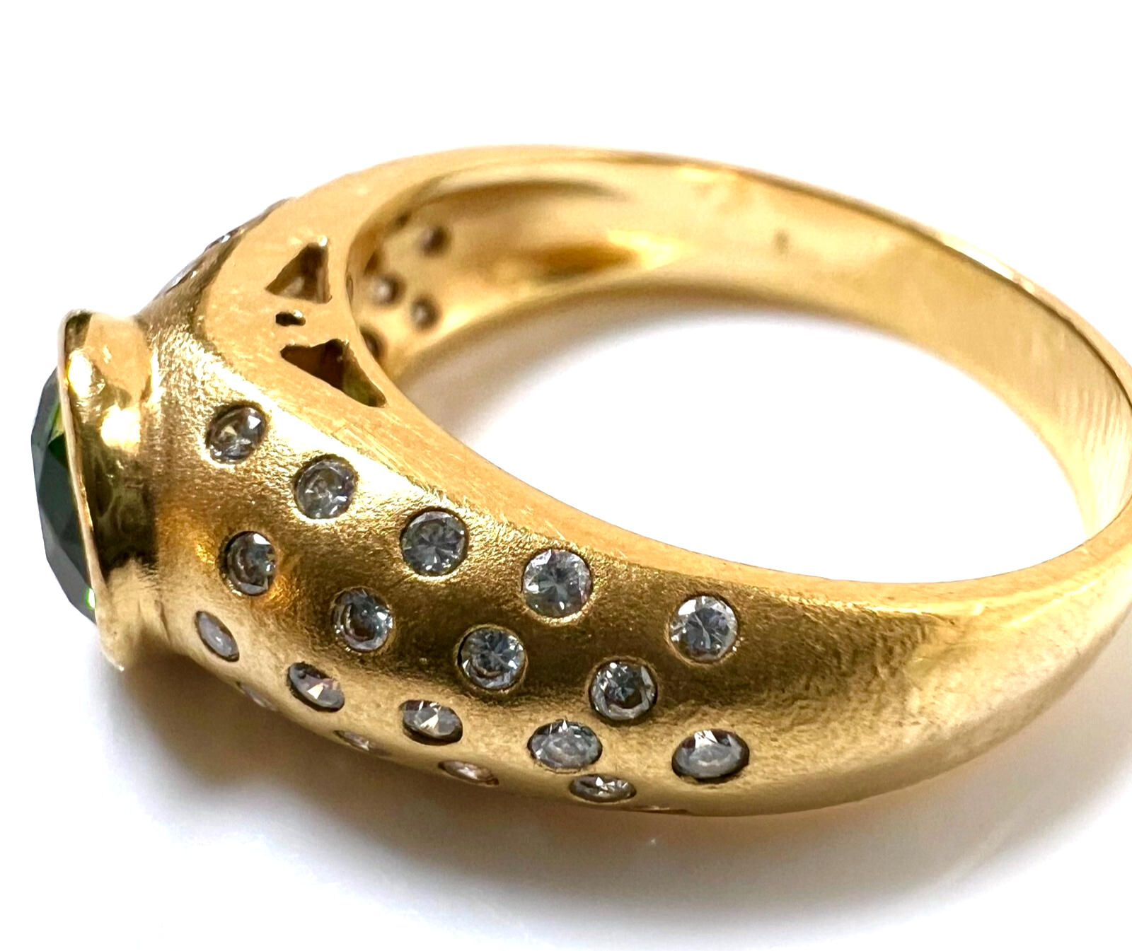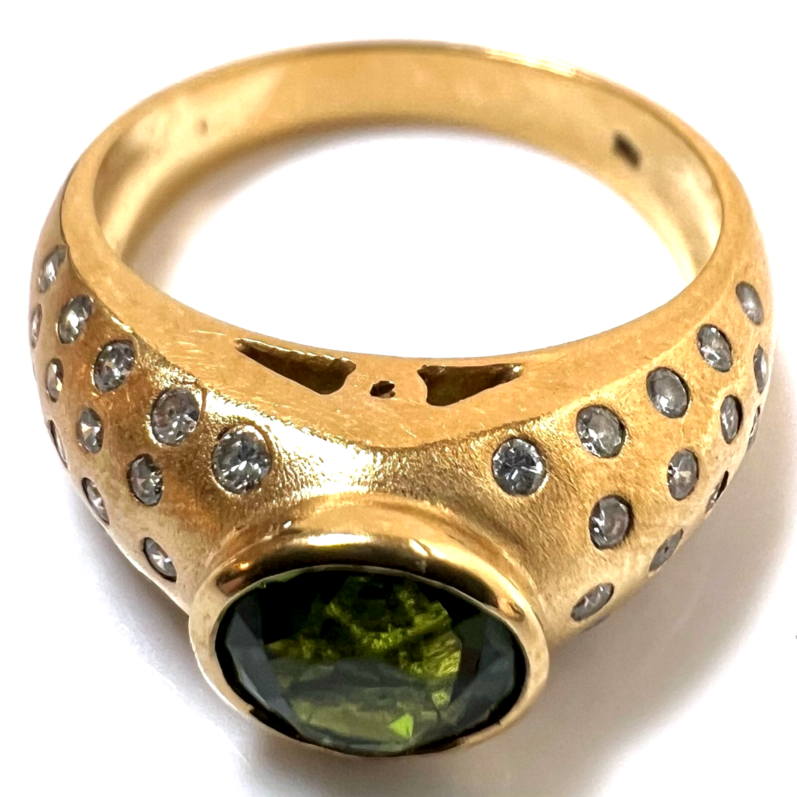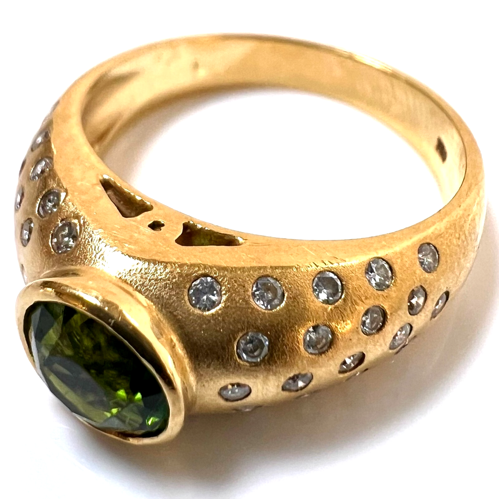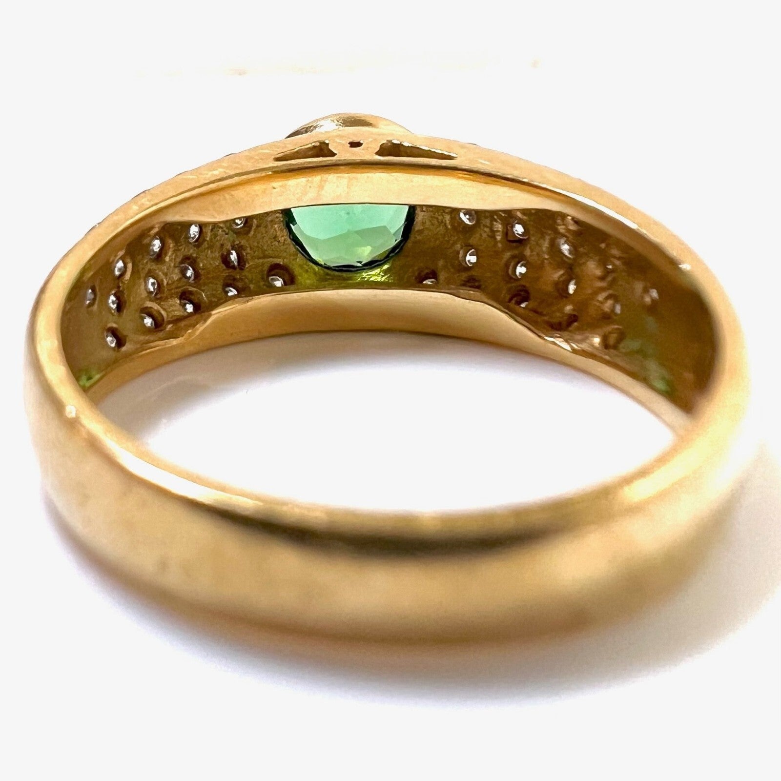 Ring in 750 / 18 K Gelbgold. Der Ring ist eine Goldschmiede-Arbeit von Hand. In die gewölbten Ringschultern sind insgesamt 46 Diamanten im Brillantschliff in die edel mattierte Oberfläche eingefasst. Die 46 Diamanten haben ca. 0.60 ct. (F/VS-VVS). Im Zentrum ist ein runder, facettierter Turmalin von 1.00 ct. in einem hellen Grün.