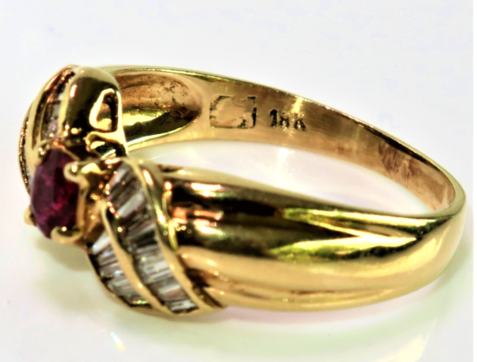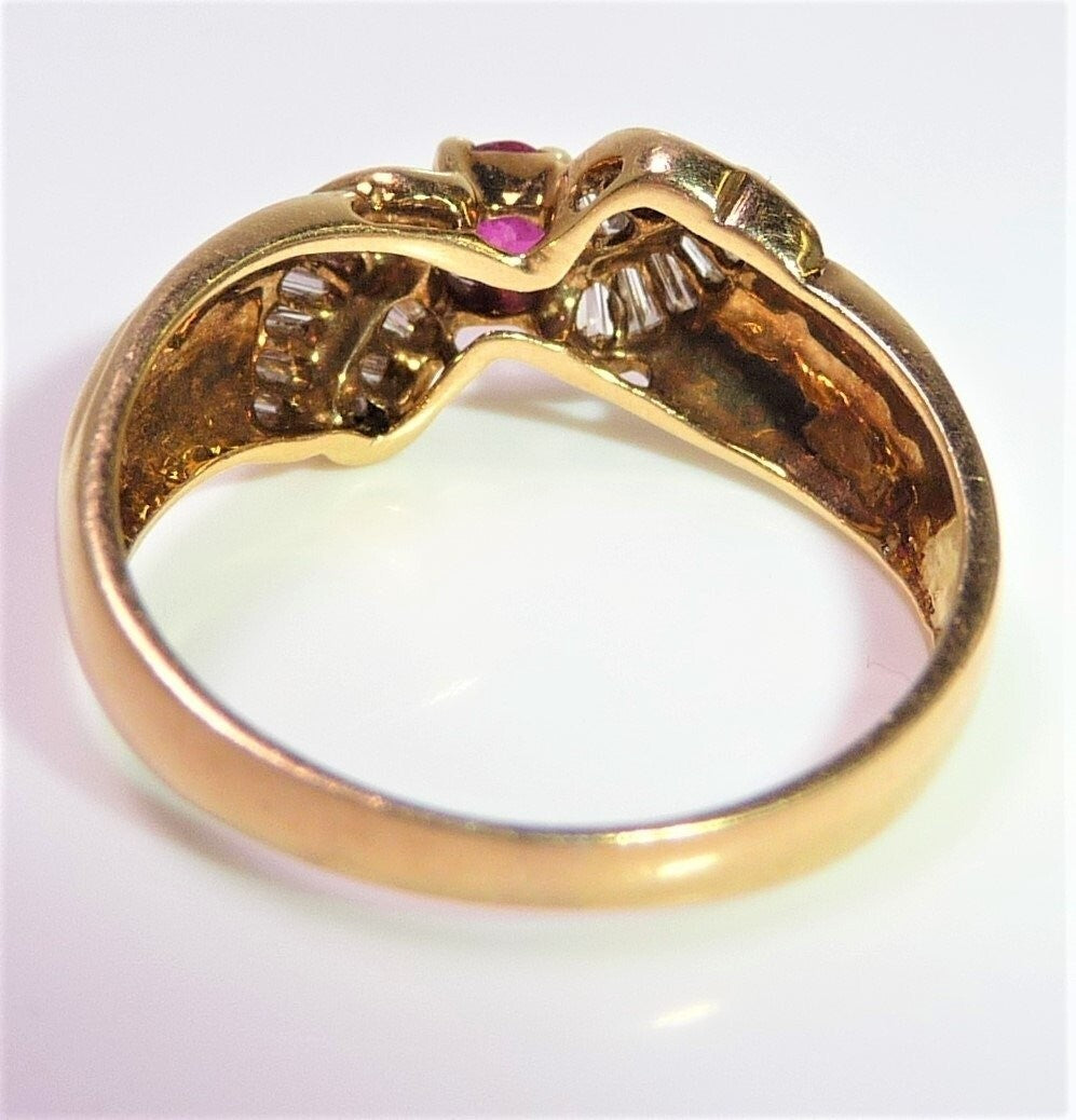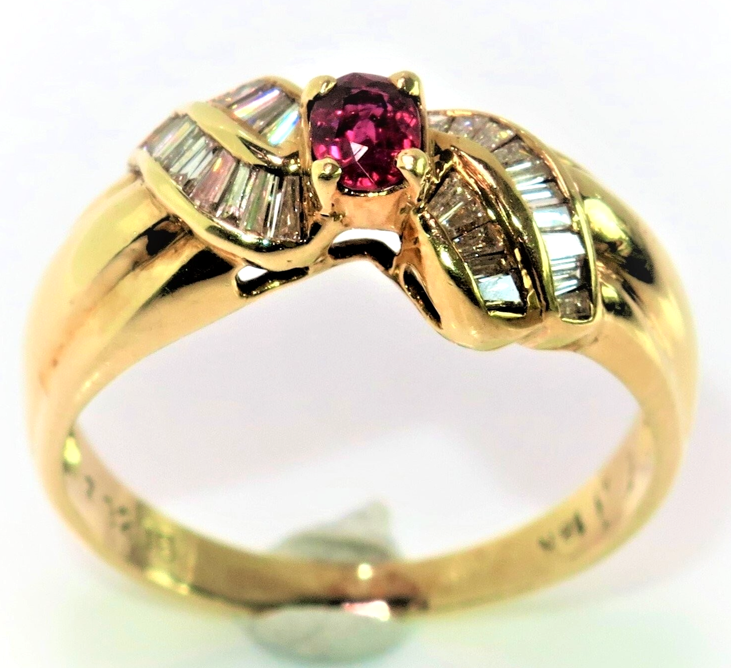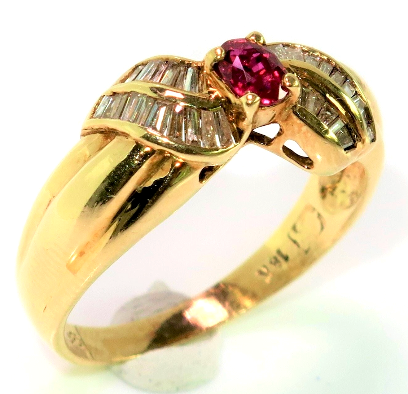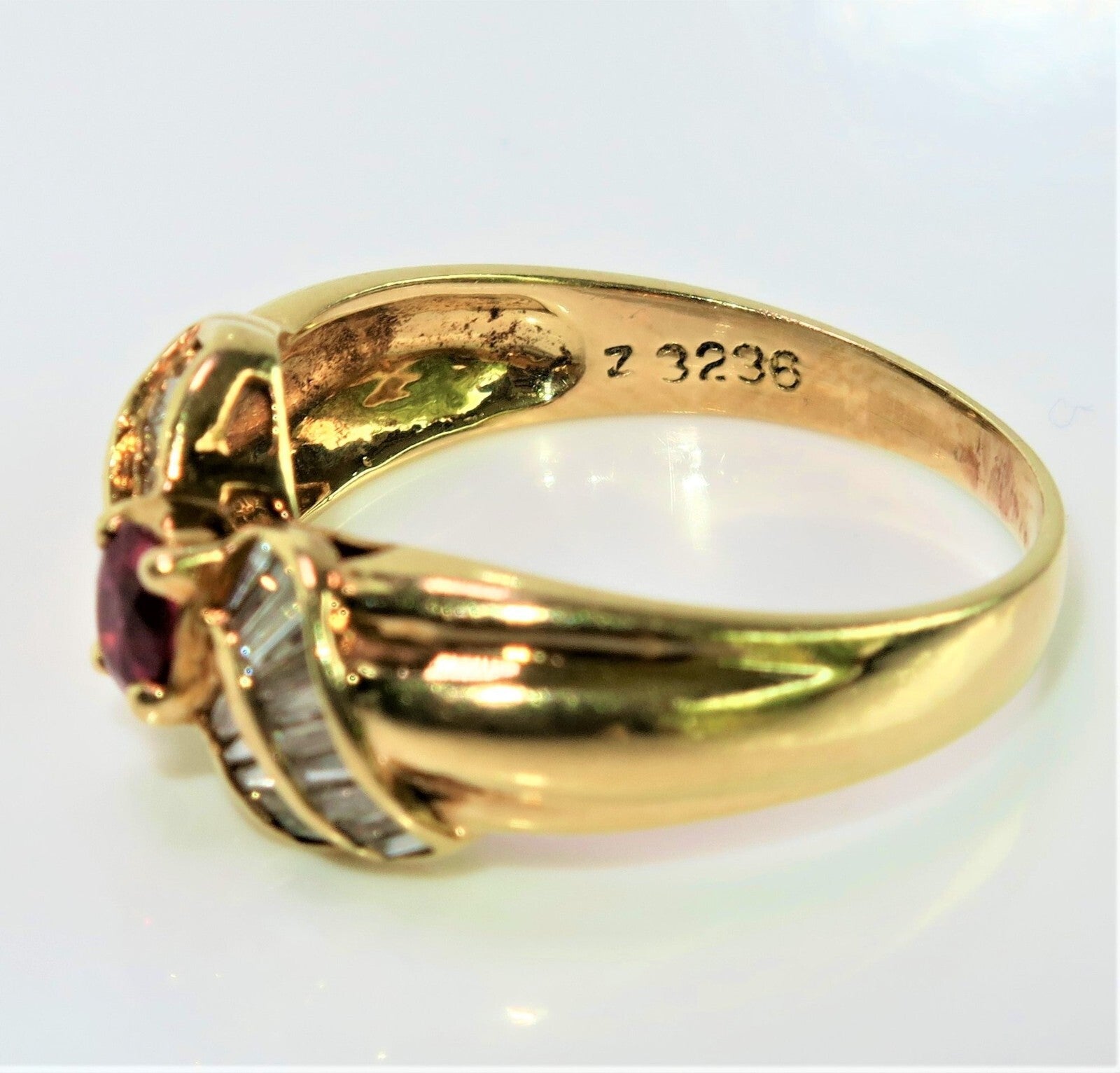 Ring in 750 / 18 K Gelbgold. Der Ring hat einen ovalen, facettierten Rubin von 0.20 ct. im Zentrum. Der Rubin hat eine sehr intensive rote Farbe und ist nahezu augenrein. Seitlich wird der Rubin von 30 Baguette-Diamanten von total 0.90 ct. (H/VS) eingefasst. Die Diamanten sind dicht an dich in Kanalfassungen eingefasst.