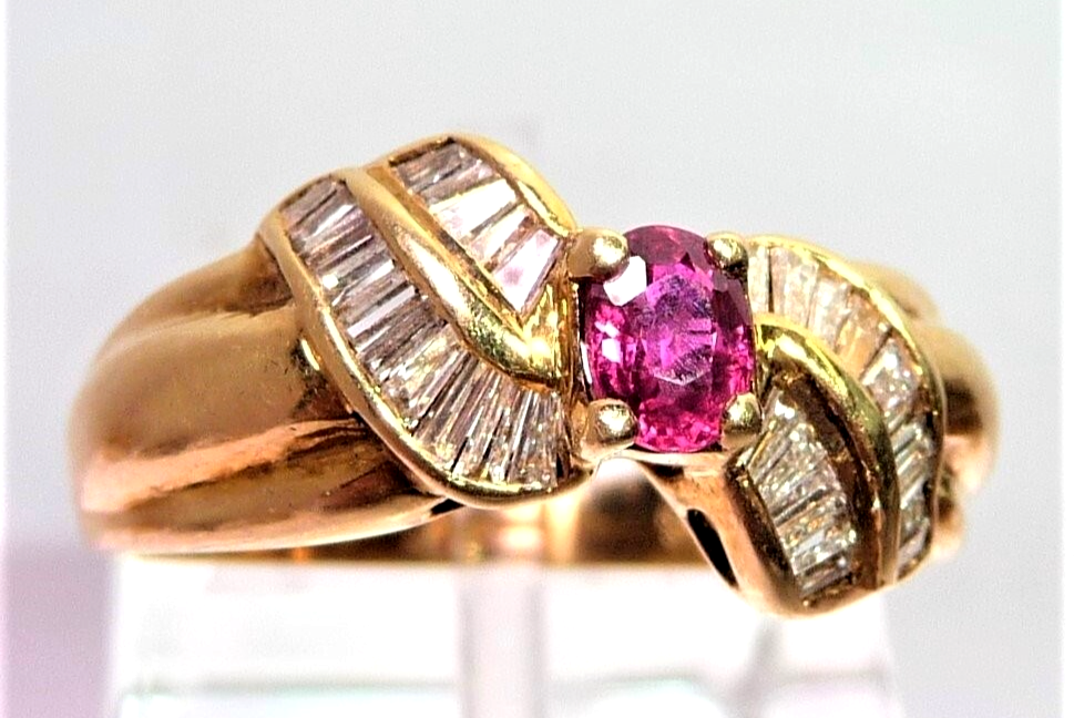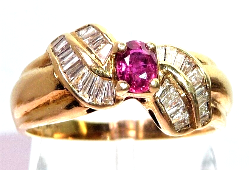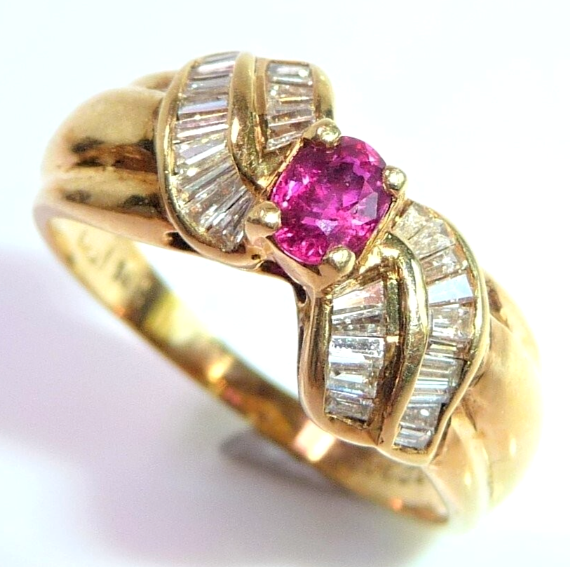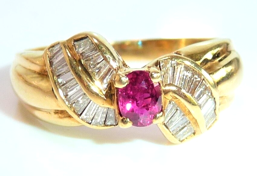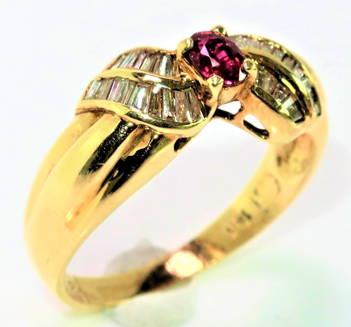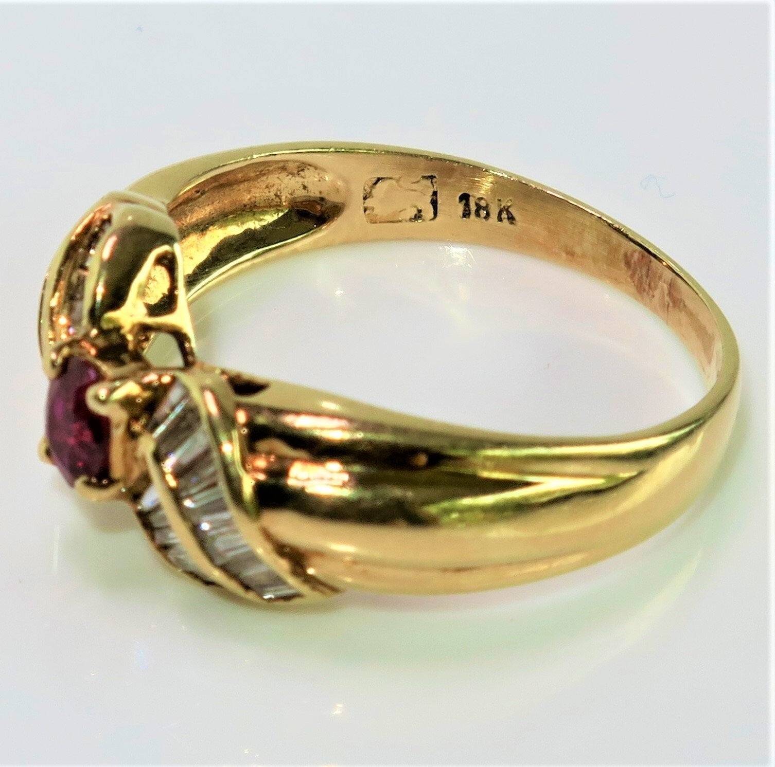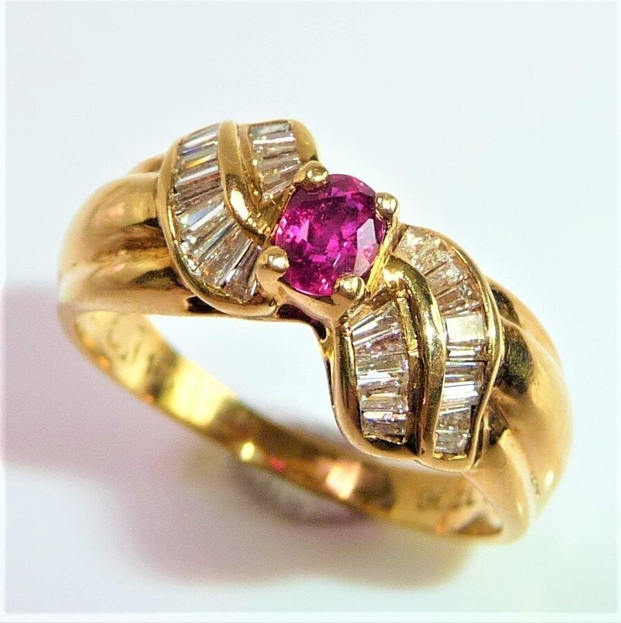 Ring in 750 / 18 K Gelbgold. Der Ring hat einen ovalen, facettierten Rubin von 0.20 ct. im Zentrum. Der Rubin hat eine sehr intensive rote Farbe und ist nahezu augenrein. Seitlich wird der Rubin von 30 Baguette-Diamanten von total 0.90 ct. (H/VS) eingefasst. Die Diamanten sind dicht an dich in Kanalfassungen eingefasst.
