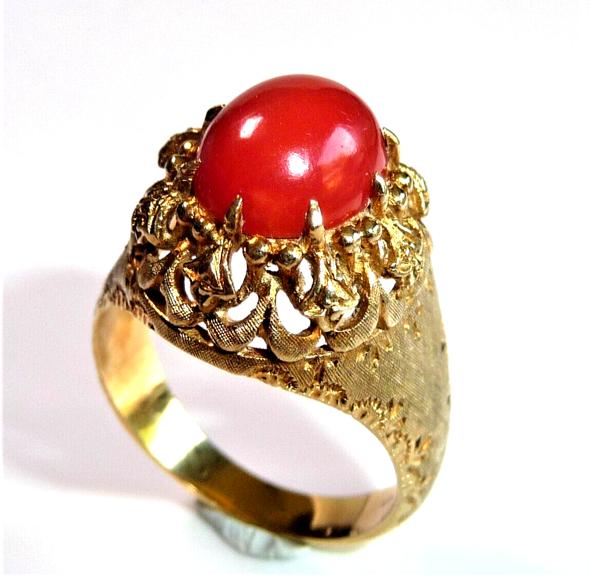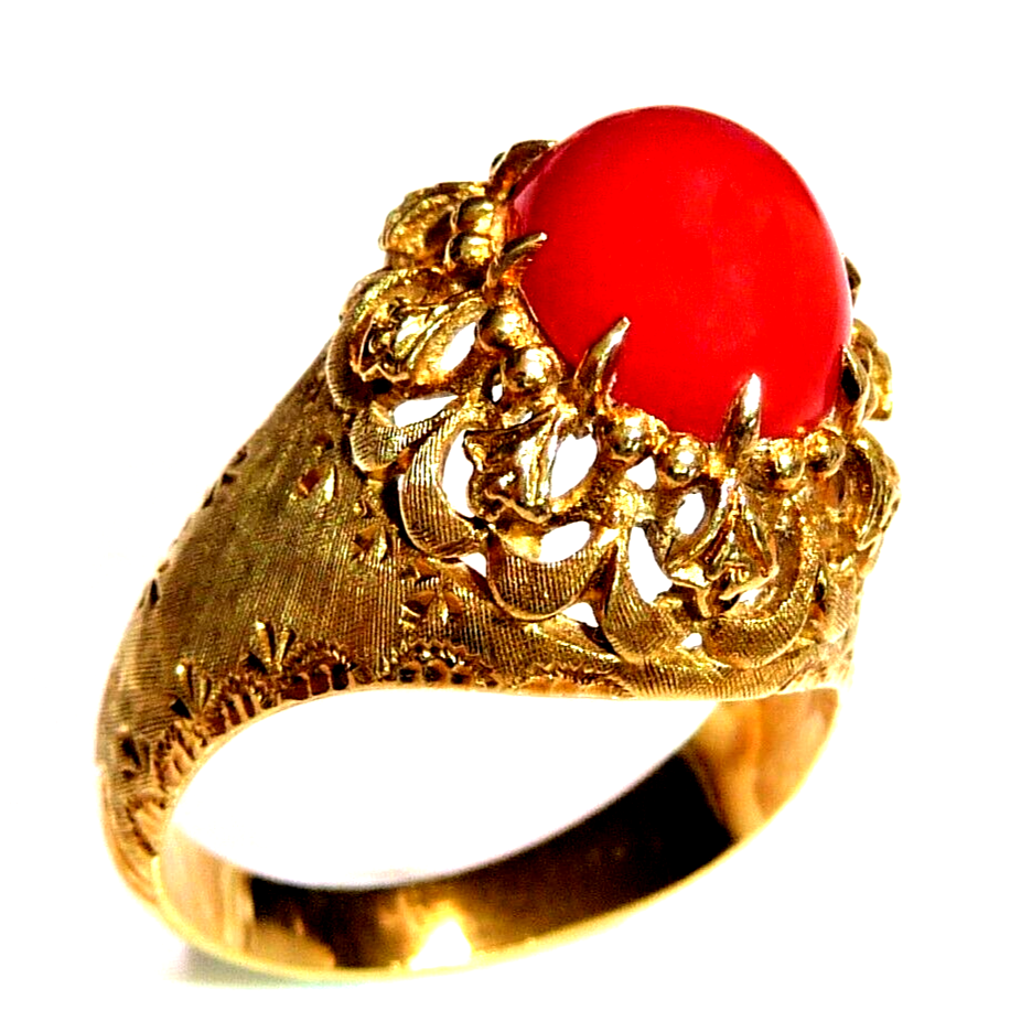 Kunstvoll gestalteter Ring in 750 / 18 kt Gelbgold. Der Ring wurde aus einem Stück geschmiedet und gipfelt in dem kunstvoll gestalteten Ringkopf, der eine intensiv rote Blutkoralle aus dem Mittelmeer trägt. Die ovale Koralle ist als Cabochon geschliffen und hat etwa 1.00 ct. Der Ringkopf und die Ringschultern sind mit feinsten Gravuren verziert. In die seidig matt schraffierte Oberfläche wurden feine Muster eingraviert. Eine Arbeit, die nur von Hand gefertigt werde kann. Typisch für die Goldschmiede-Kunst der Jahre um 1960