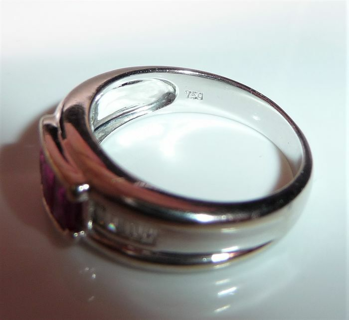 Ring in 750 / 18 K Weißgold. Der Ring ist als flacher Bandring gearbeitet. Im Zentrum sind drei blutrote Rubine im rechteckigen Facettenschliff dicht an dicht in einer Channel-Fassung eingearbeitet. Zusammen haben die Rubine etwa 1,20 ct.. Sie sind von exzellenter Farb-Qualität und nahezu augenrein. Die Ringschultern sind noch mit jeweils 5 Diamanten im Baguette-Schliff verziert, die zusammen etwa 0,70 ct. haben und nach unten hin etwas kleiner werden. Auch sie sind dicht an dicht in einer Channel-Fassung eingefasst.
