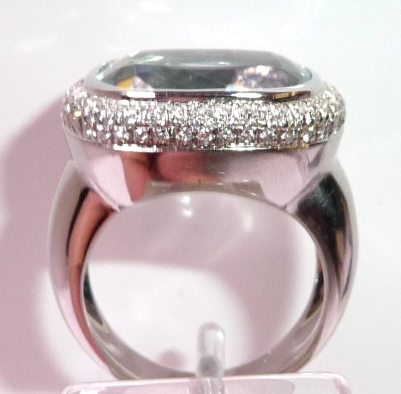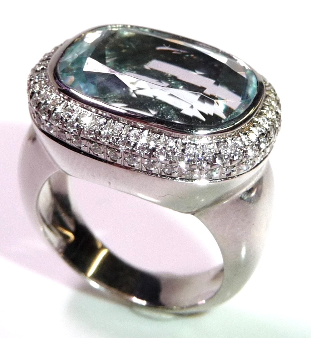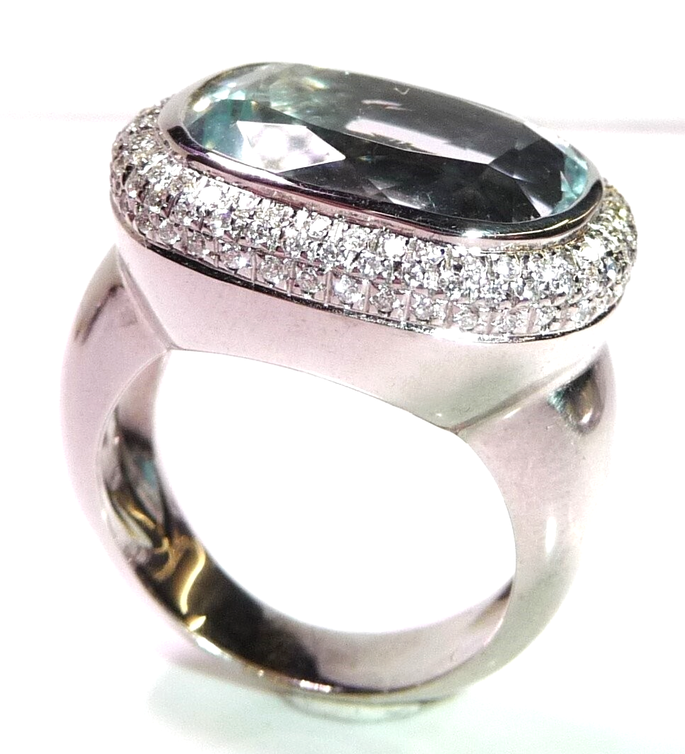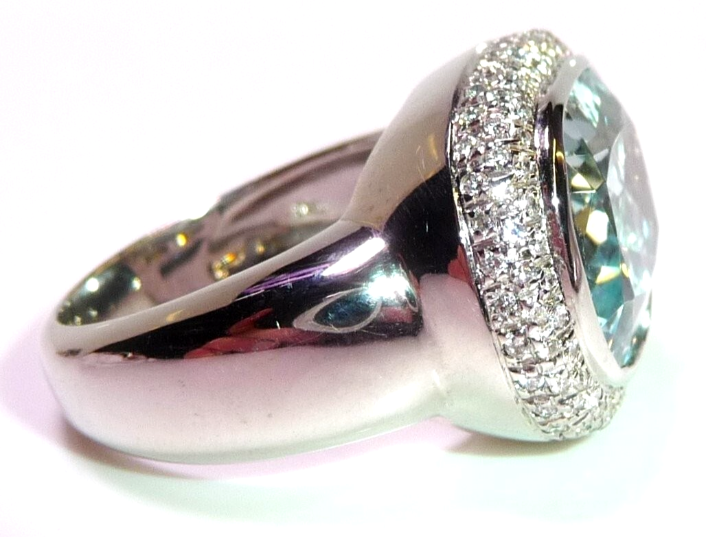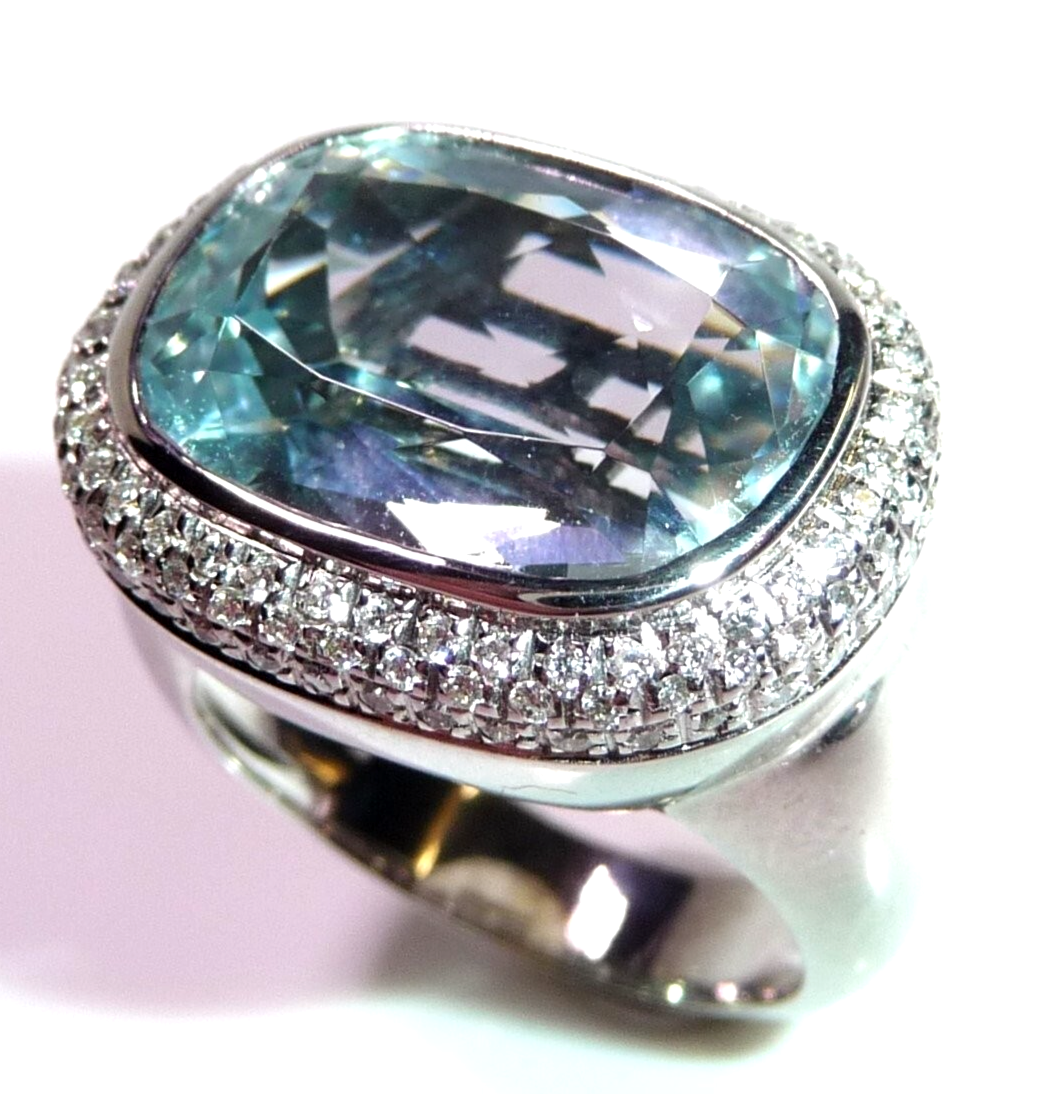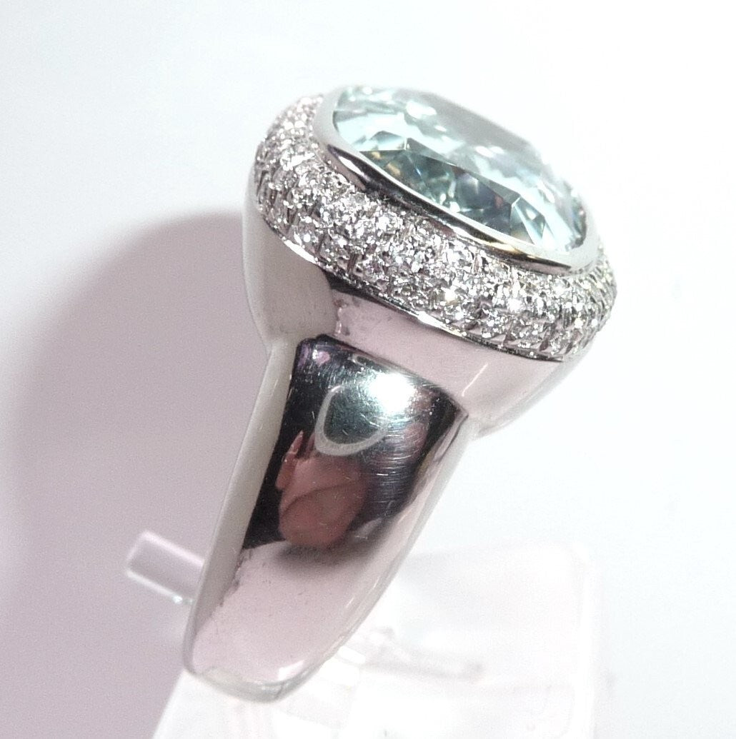 Massiver Ring in 750 / 18 K Weißgold. Der Ring ist mit 14,0 Gramm sehr massiv gearbeitet. Das Weißgold ist Hochglanz poliert. Im Zentrum ist ein Aquamarin von 8.50 ct. mit den Maßen 16 x 12 x 7,5 mm. Der geprüfte Aquamarin hat ein intensives Wasserblau. Der Aquamarin wird in drei Kreisen umrunden von insgesamt 120 Diamanten im Brillantschliff von total 1.20 ct. (F/VVS).