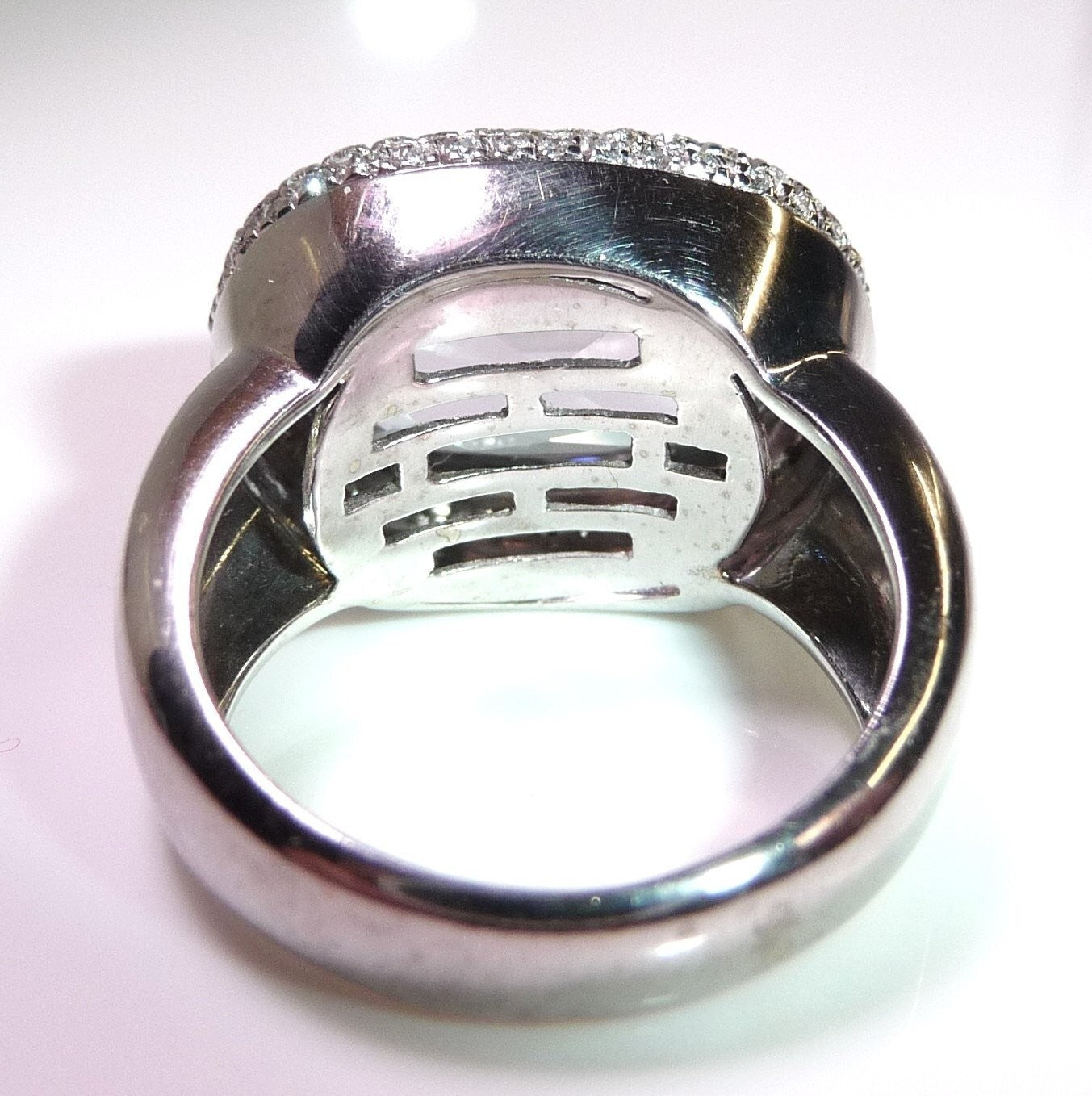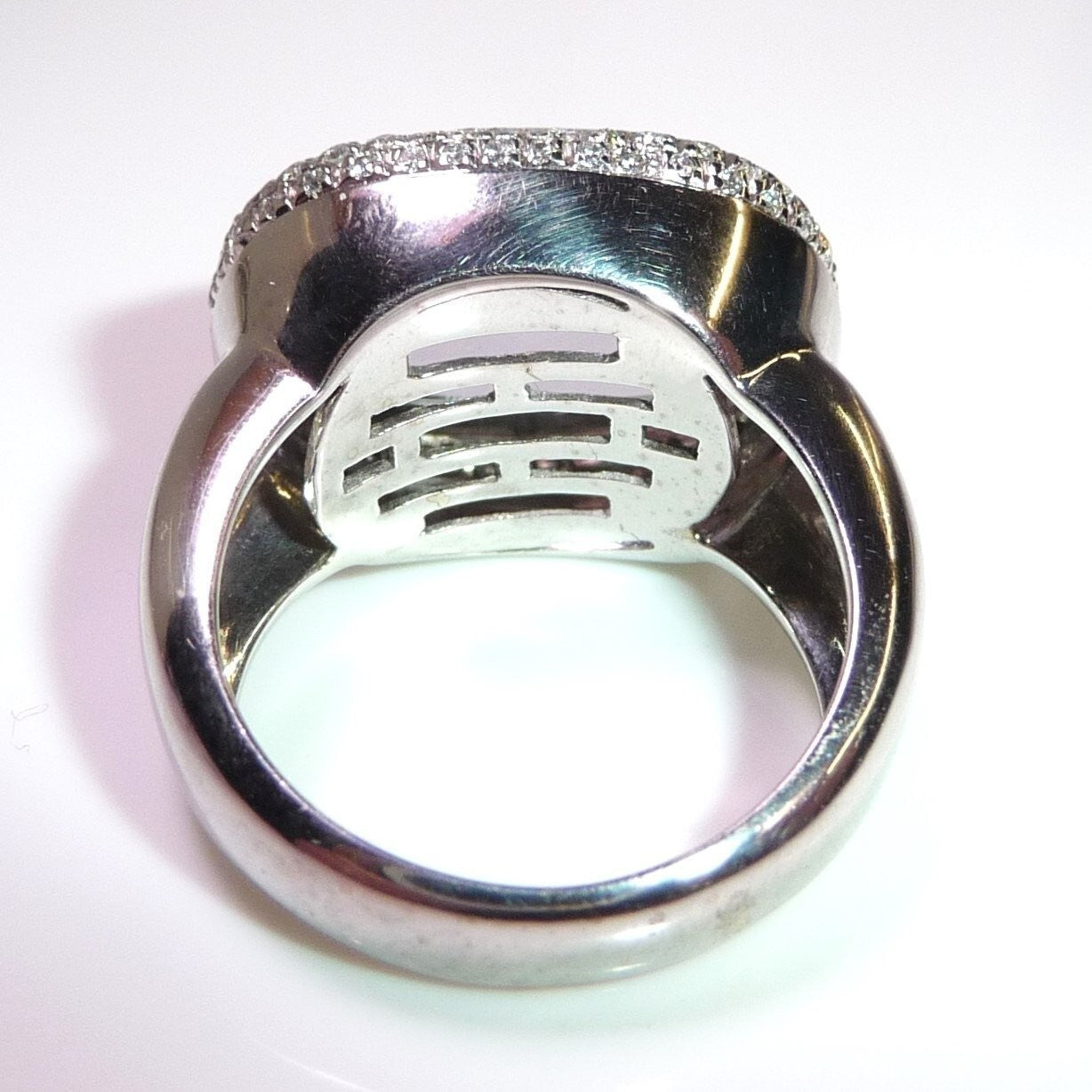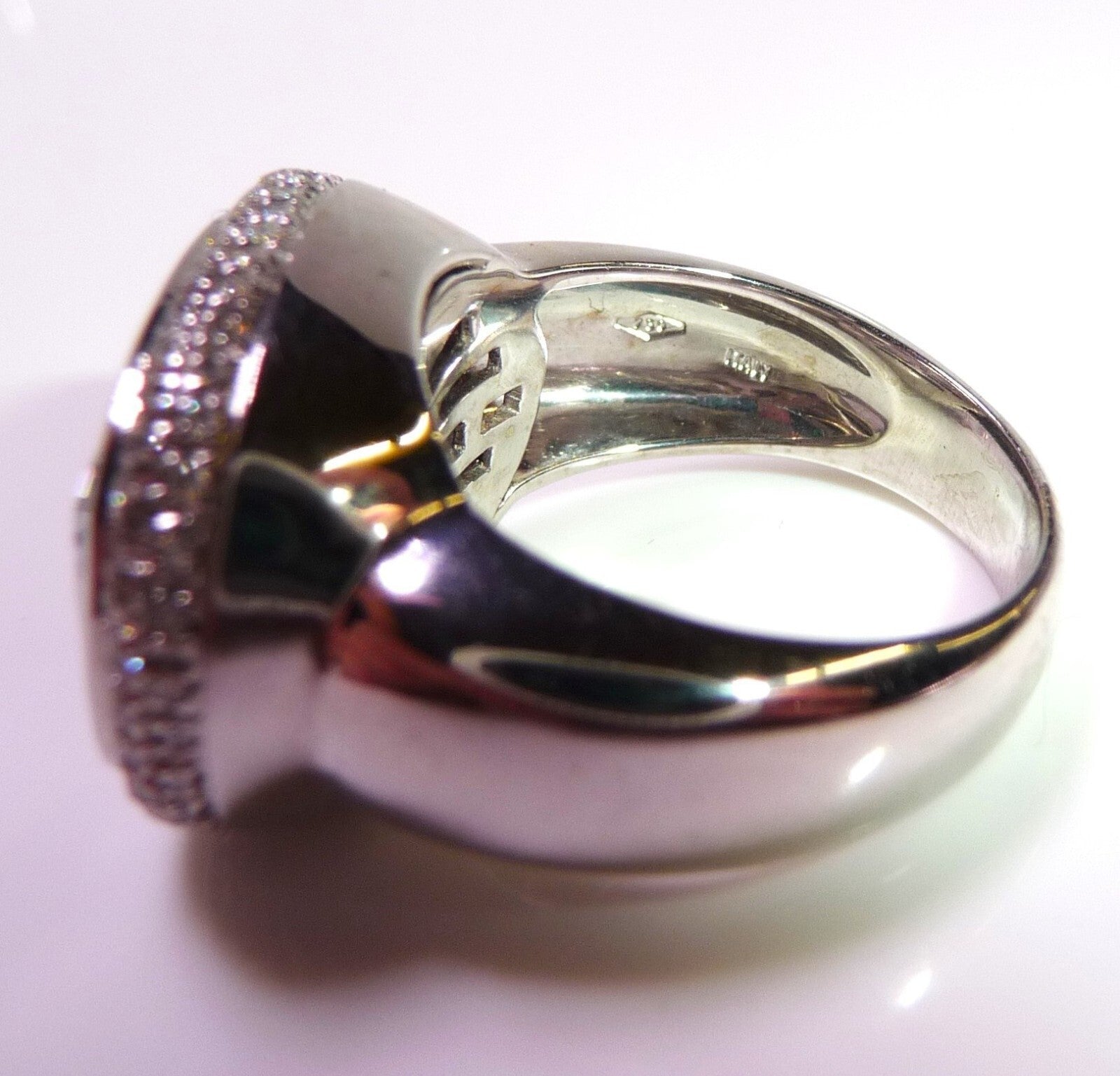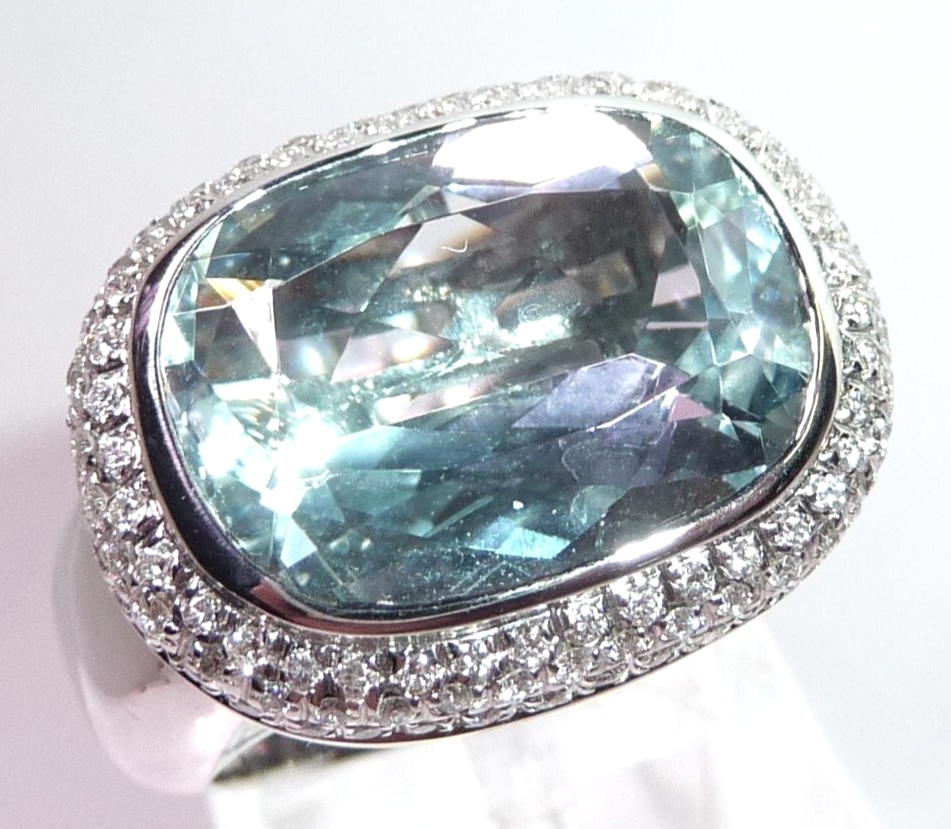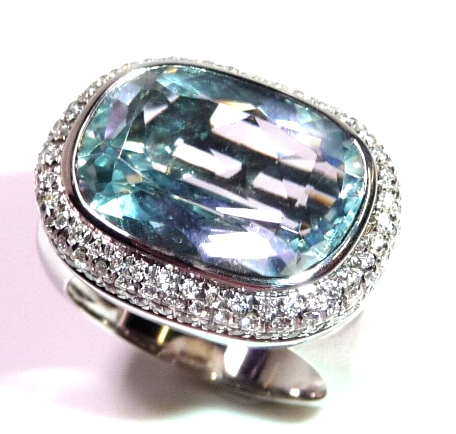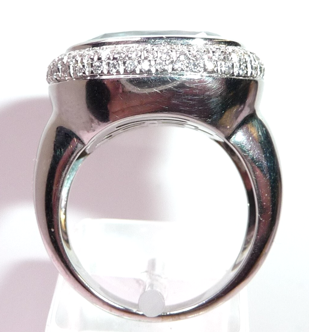 Massiver Ring in 750 / 18 K Weißgold. Der Ring ist mit 14,0 Gramm sehr massiv gearbeitet. Das Weißgold ist Hochglanz poliert. Im Zentrum ist ein Aquamarin von 8.50 ct. mit den Maßen 16 x 12 x 7,5 mm. Der geprüfte Aquamarin hat ein intensives Wasserblau. Der Aquamarin wird in drei Kreisen umrunden von insgesamt 120 Diamanten im Brillantschliff von total 1.20 ct. (F/VVS).