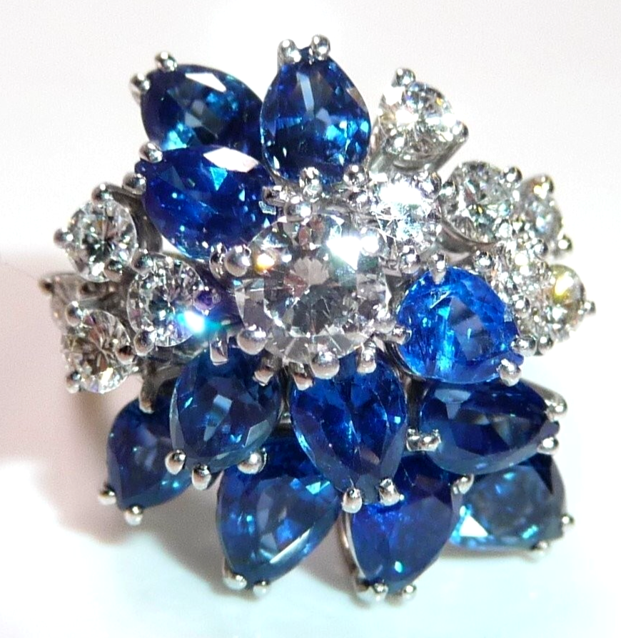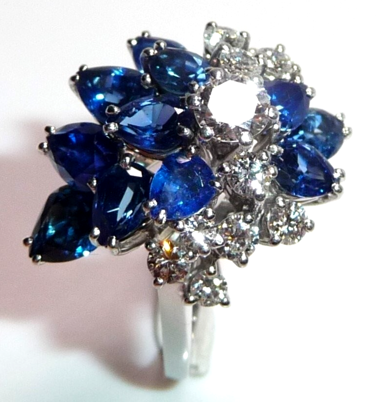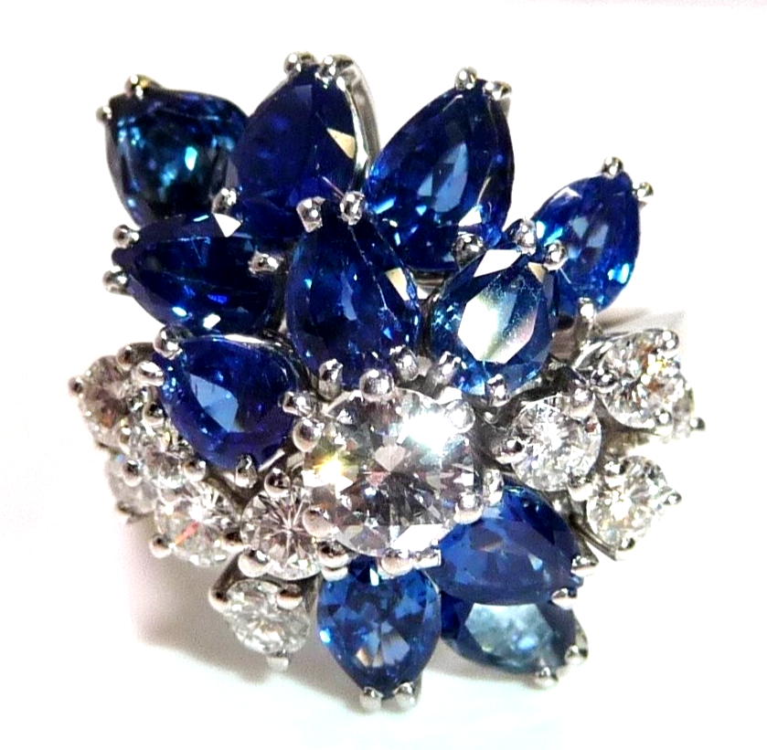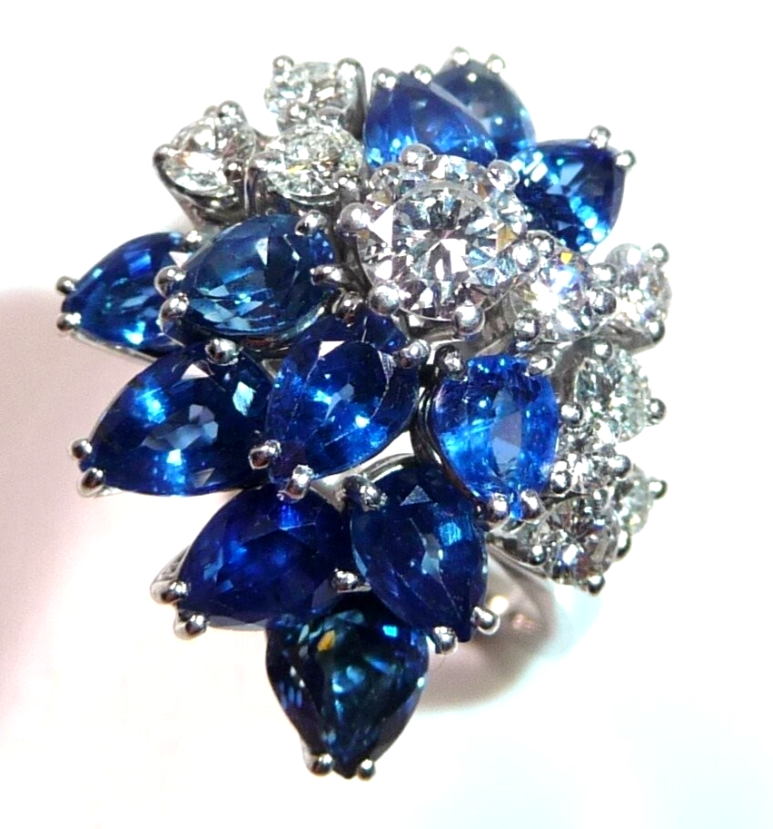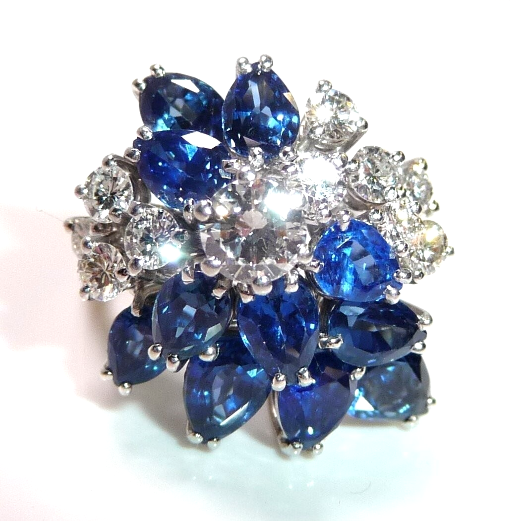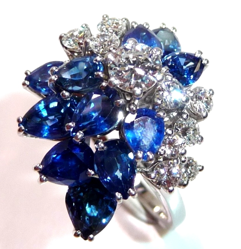 Eleganter Ring in 750 / 18 K Weißgold. Der Ring hat einen großen Ringkopf mit einem Cluster von Saphiren und Diamanten. Die 11 Saphire sind im Tropfen-Schliff (Pear Cut) und haben ein fantastisches mittleres Blau. Die Saphire haben zusammen ca. 2.50 ct. und sind nahezu augenrein und damit von höchster Qualität, was man auch schon auf den Fotos sehen kann. Dazwischen mischen sich 11 Diamanten im Brillantschliff von total ca. 1.00 ct. (G/VS-VVS).