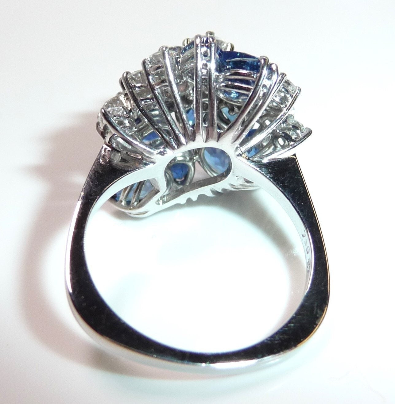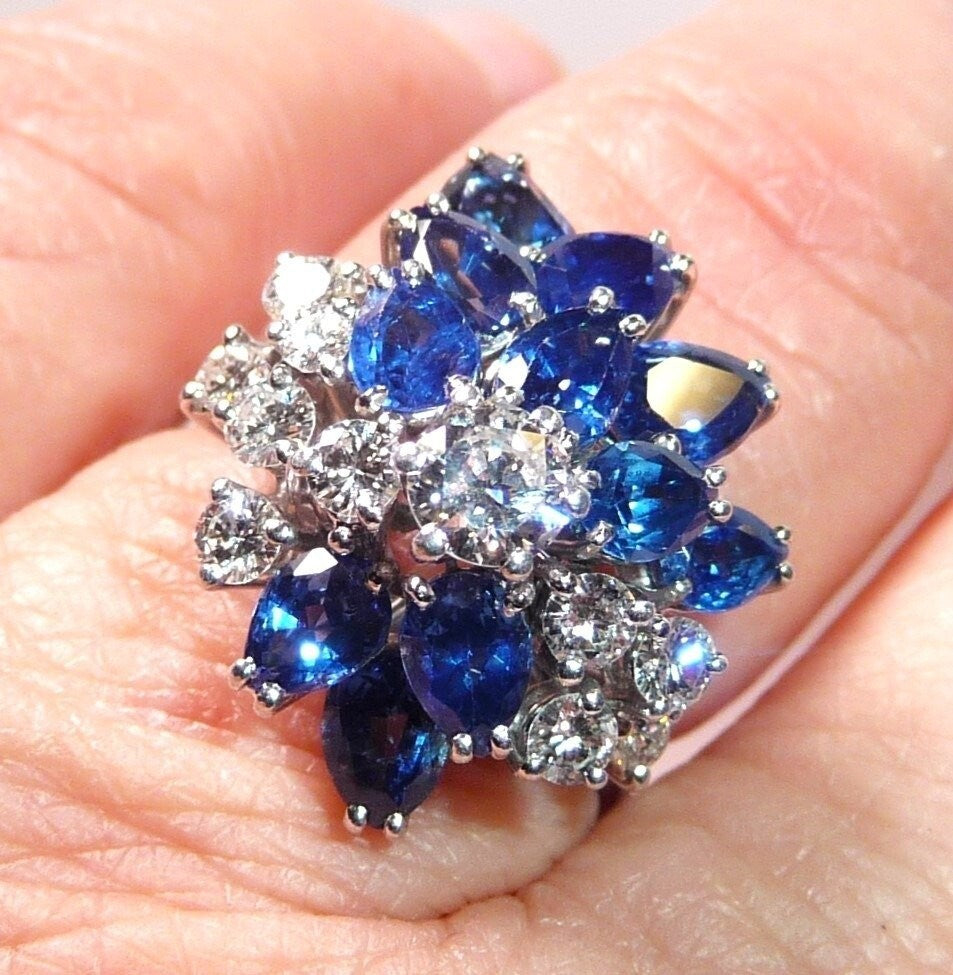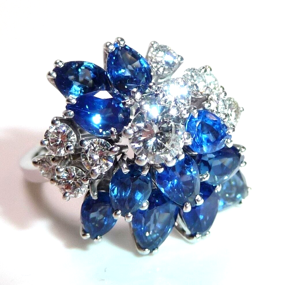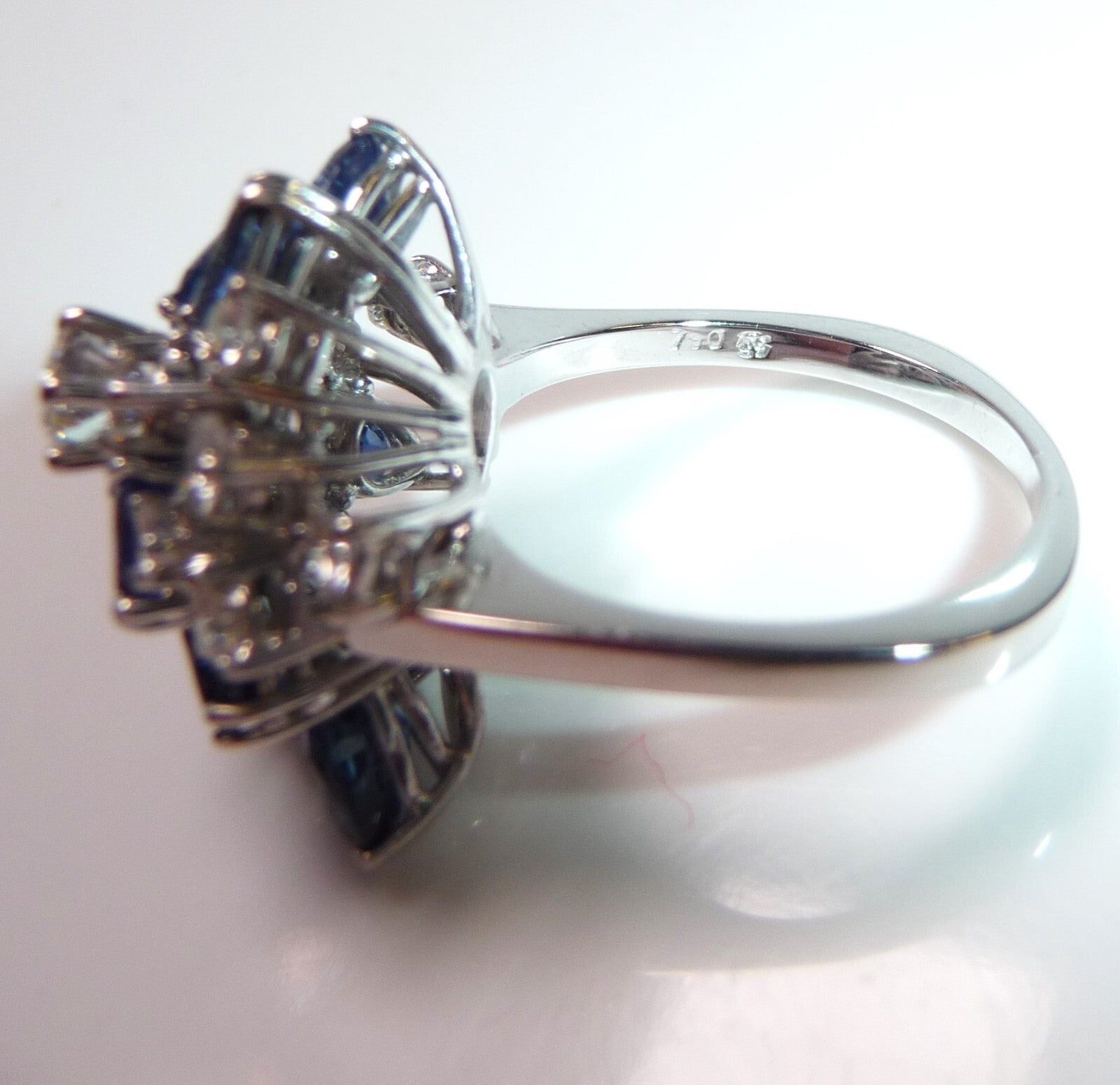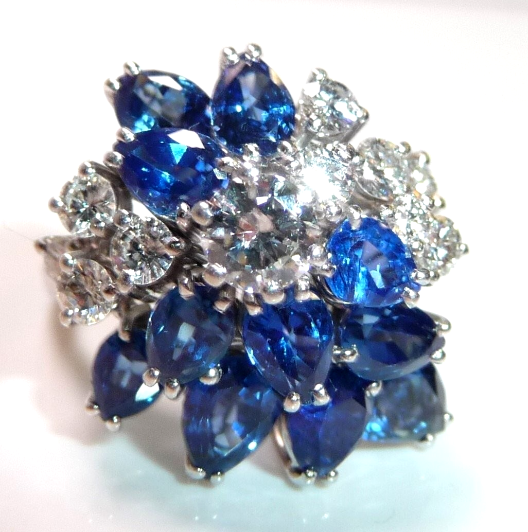 Eleganter Ring in 750 / 18 K Weißgold. Der Ring hat einen großen Ringkopf mit einem Cluster von Saphiren und Diamanten. Die 11 Saphire sind im Tropfen-Schliff (Pear Cut) und haben ein fantastisches mittleres Blau. Die Saphire haben zusammen ca. 2.50 ct. und sind nahezu augenrein und damit von höchster Qualität, was man auch schon auf den Fotos sehen kann. Dazwischen mischen sich 11 Diamanten im Brillantschliff von total ca. 1.00 ct. (G/VS-VVS).