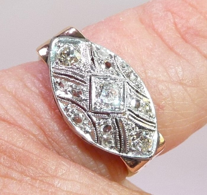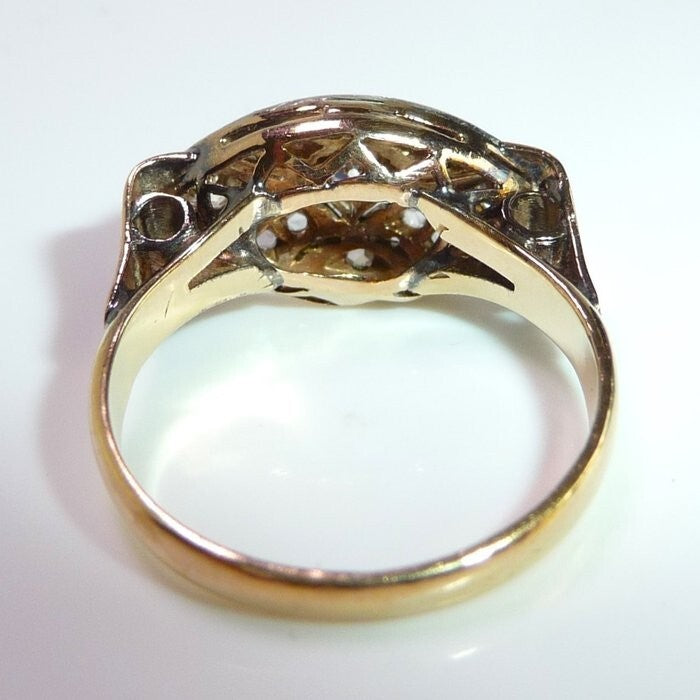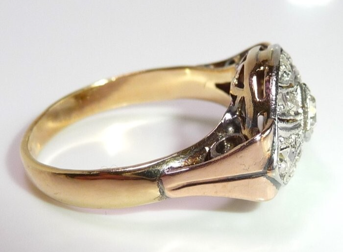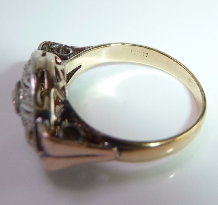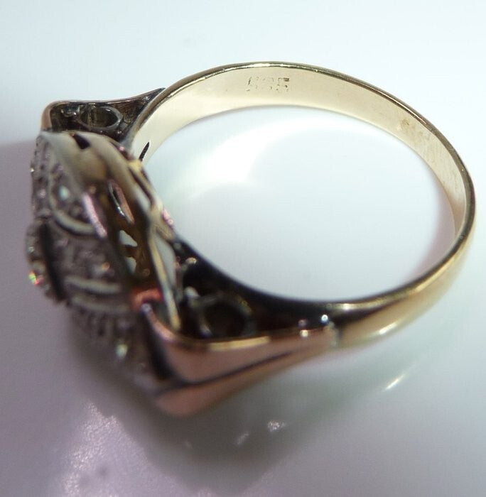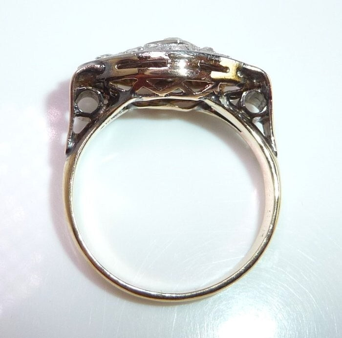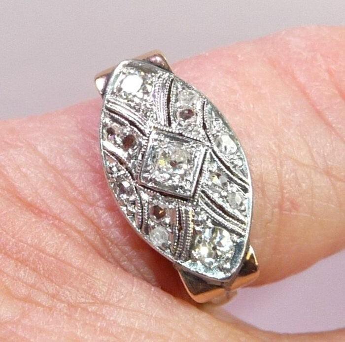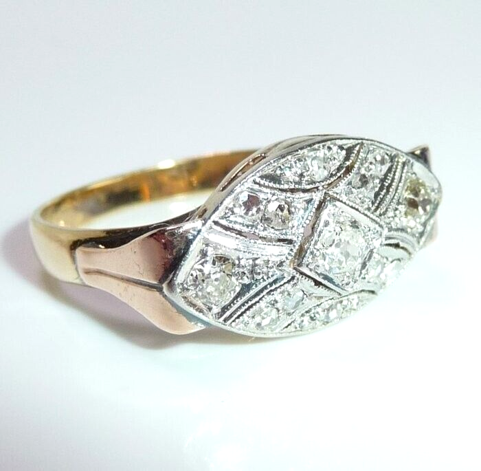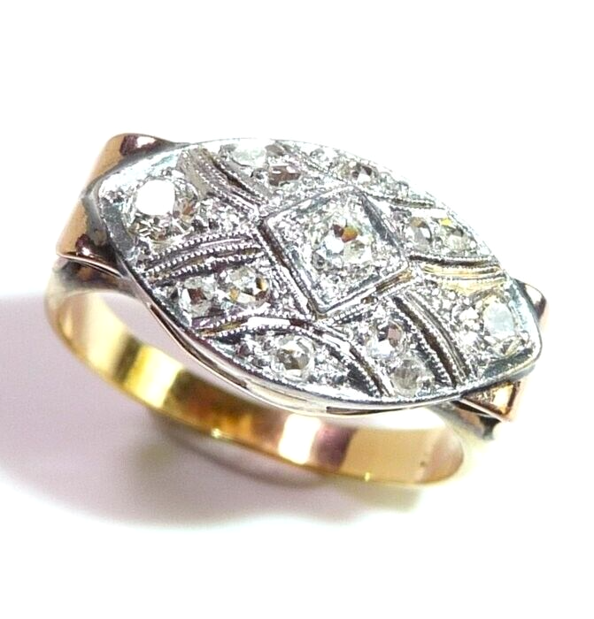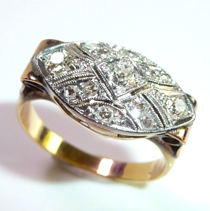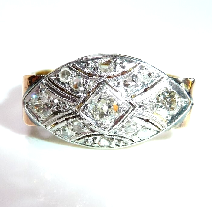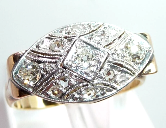 Antiker Ring der Art Deco / Art Nouveau Periode um 1920, gearbeitet in 14 kt. / 585 Gelbgold mit einer Platin-Lage im oberen Bereich der Diamanten. Der Ringkopf ist augenförmig und zeigt eine wundervolle Durchbruch-Ornamentik, Im Zentrum ist ein großer Diamant von ca. 0.15 ct. im antiken Schliff in einer quadratischen Fassung eingefasst. Der große Diamant ist sehr klar mit etwa VS und Farbe G. Zwei Begleit-Diamanten im Antiken Schliff sind in den äußeren Winkeln von jeweils 0.08 ct. Diamanten im Antiken Schliff ca. 0.30 ct. Dazu kommen noch 10 Diamant-Rosen von total 0.20 ct. als Entourage.