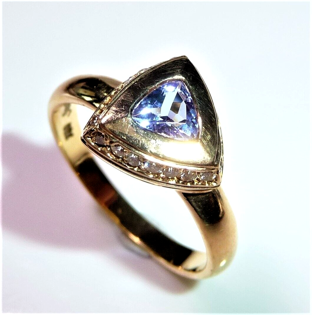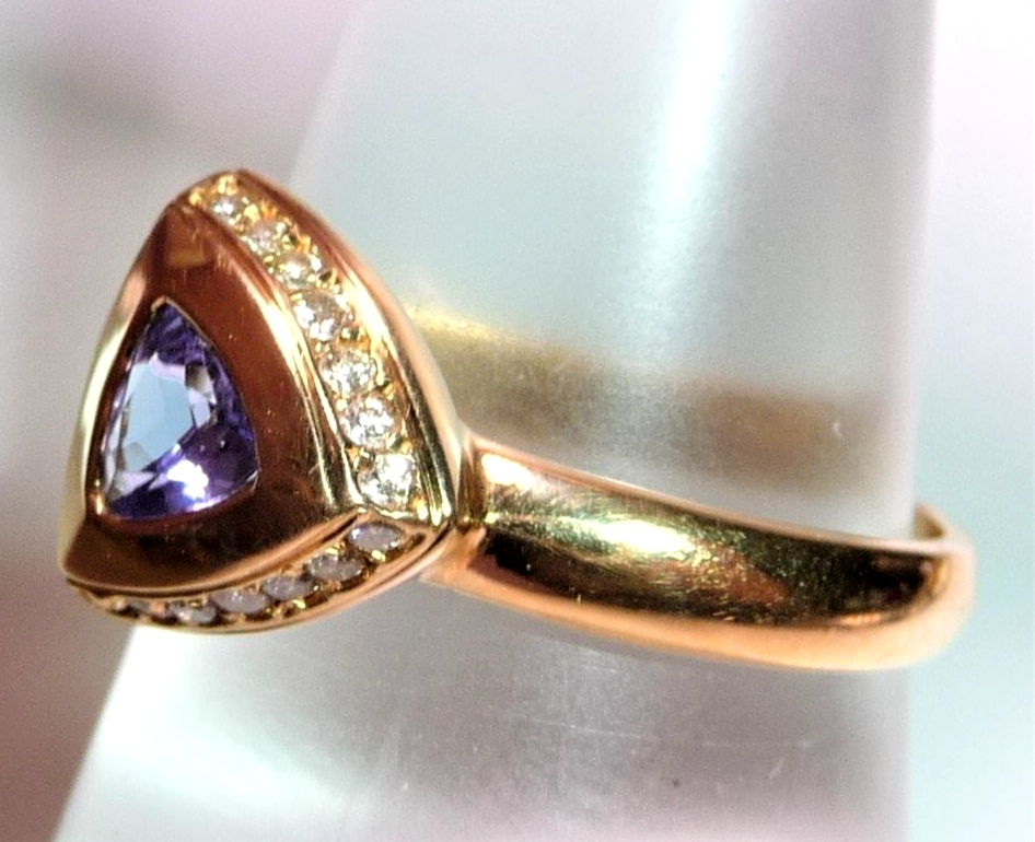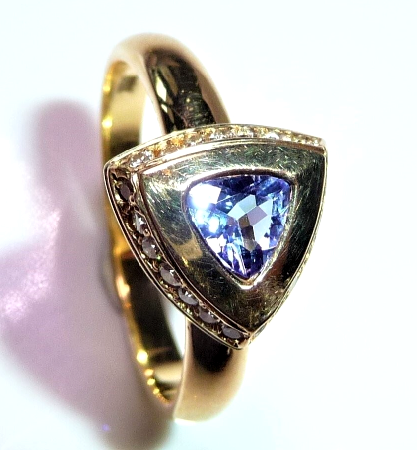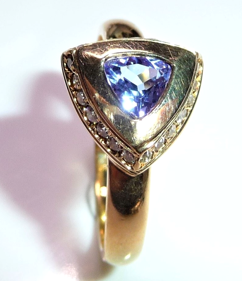 Ring in 18 K / 750 Gelbgold. Der Ring ist eine Goldschmiede-Arbeit der Marke Scala. Der Ringkopf hat die Form eines gleichseitigen Dreiecks. Der Ringkopf folgt damit der Schliff-Form des Tansanit im Zentrum, der im Trillion-Schliff geschliffen ist und etwa 0.75 ct. hat.