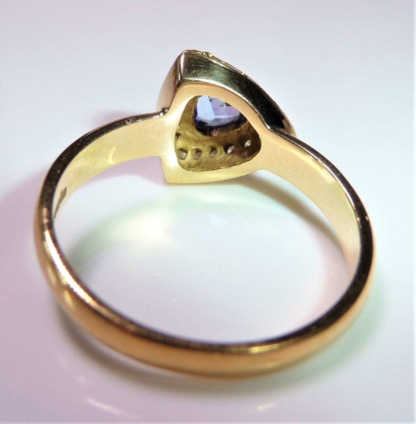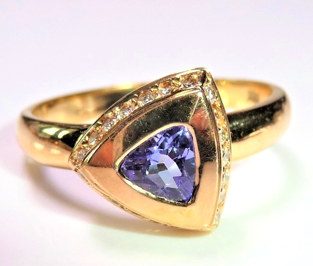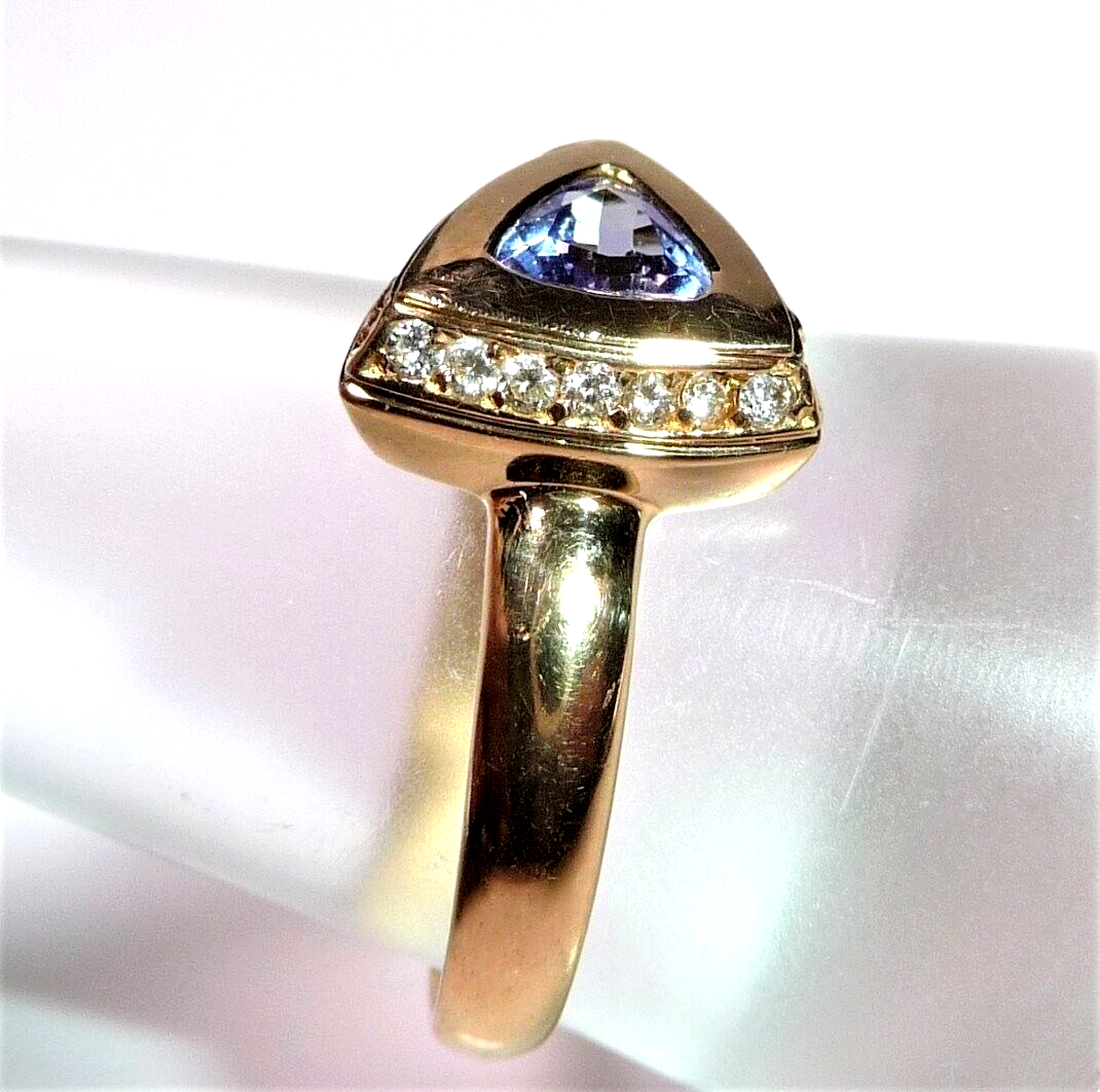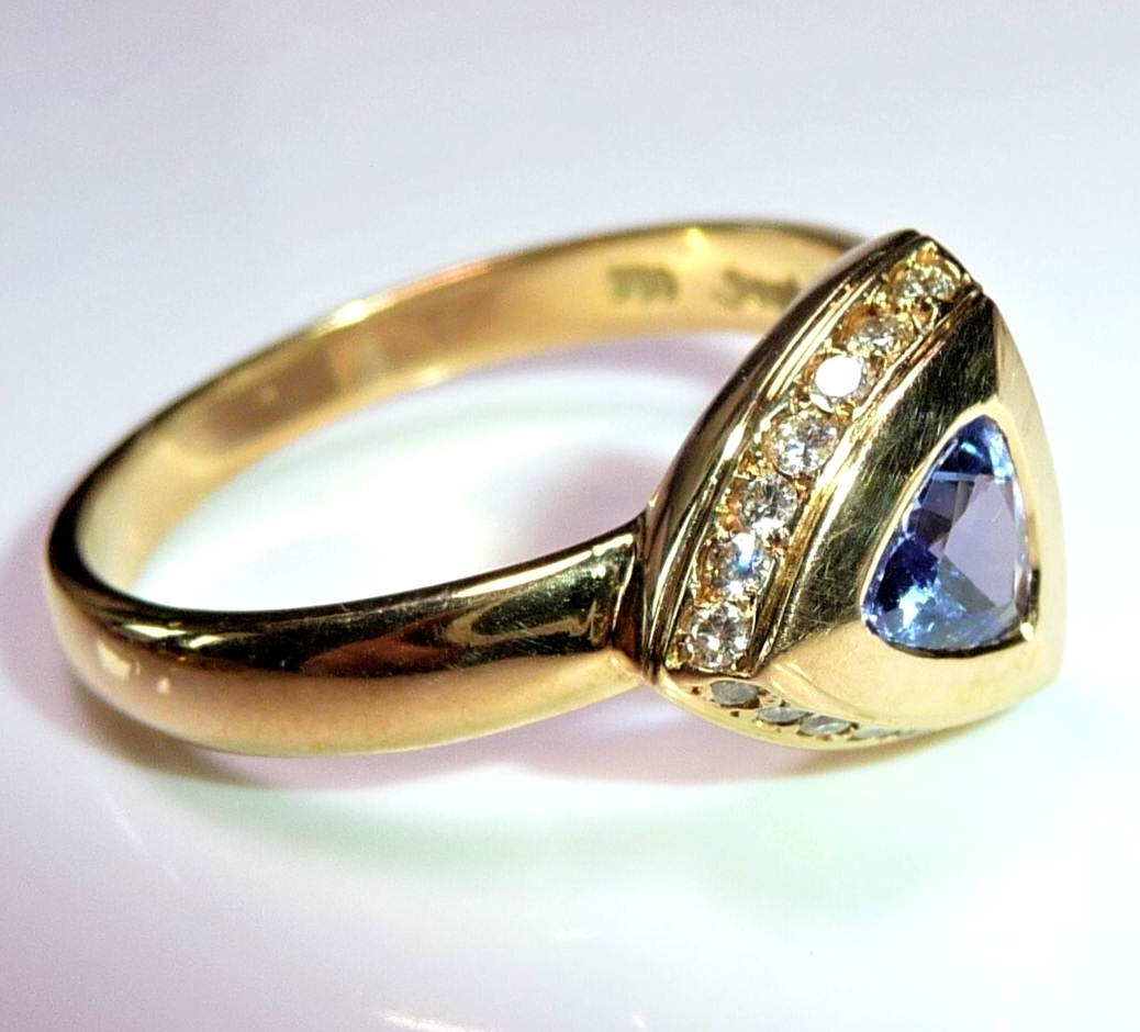 Ring in 18 K / 750 Gelbgold. Der Ring ist eine Goldschmiede-Arbeit der Marke Scala. Der Ringkopf hat die Form eines gleichseitigen Dreiecks. Der Ringkopf folgt damit der Schliff-Form des Tansanit im Zentrum, der im Trillion-Schliff geschliffen ist und etwa 0.75 ct. hat.
