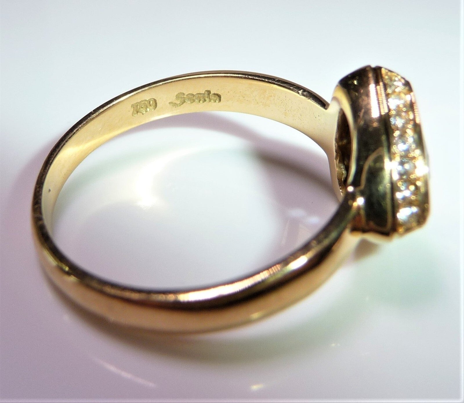 Die Fassung ist rundum noch mit insgesamt 21 Diamanten im Brillantschliff verziert. Die Diamanten haben total ca. 0.30 ct. (F/VS-VVS).