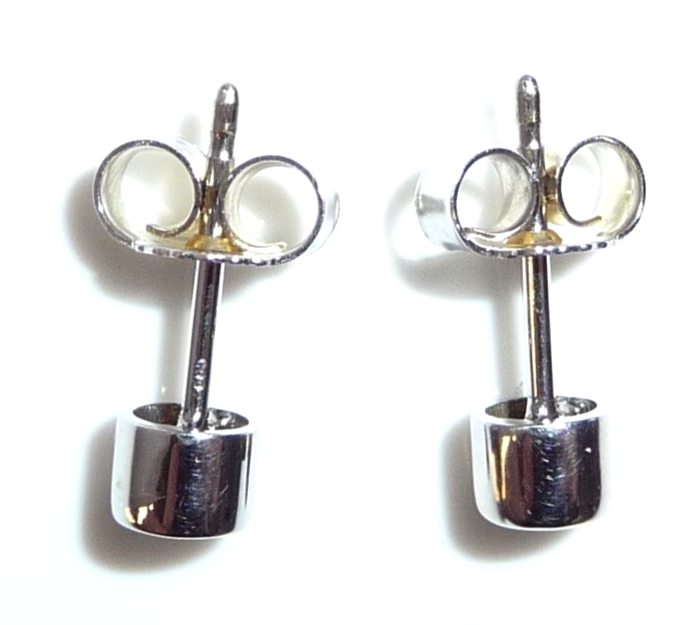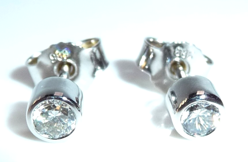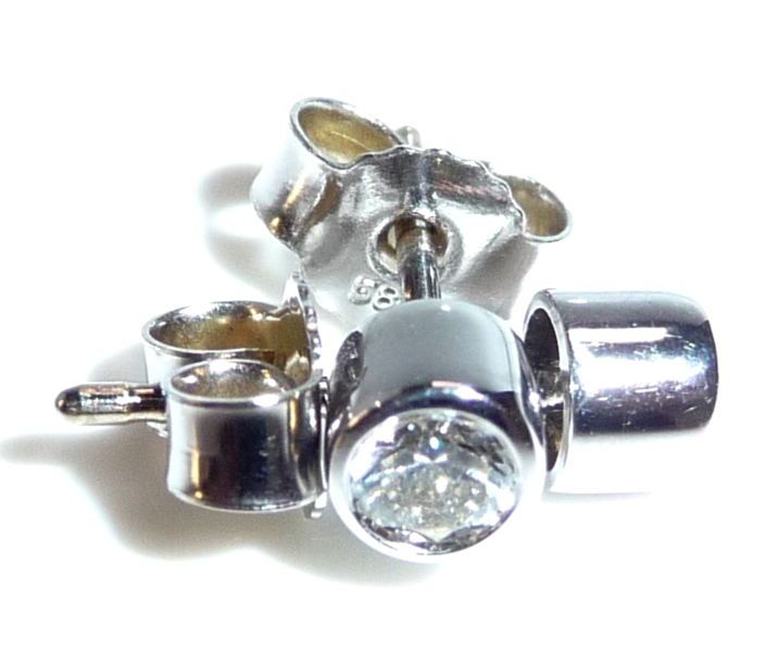 Ohrringe in 14 kt. / 585 Weißgold. Die Ohrringe sind klassische Ohrstecker mit Diamant-Solitären. Die beiden Diamanten sind in einer zylindrischen Zargenfassung, die wie ein kleines Röhrchen gearbeitet ist und rundum schön auf Hochglanz poliert ist.