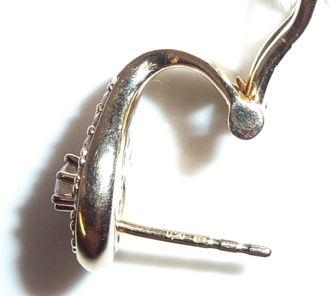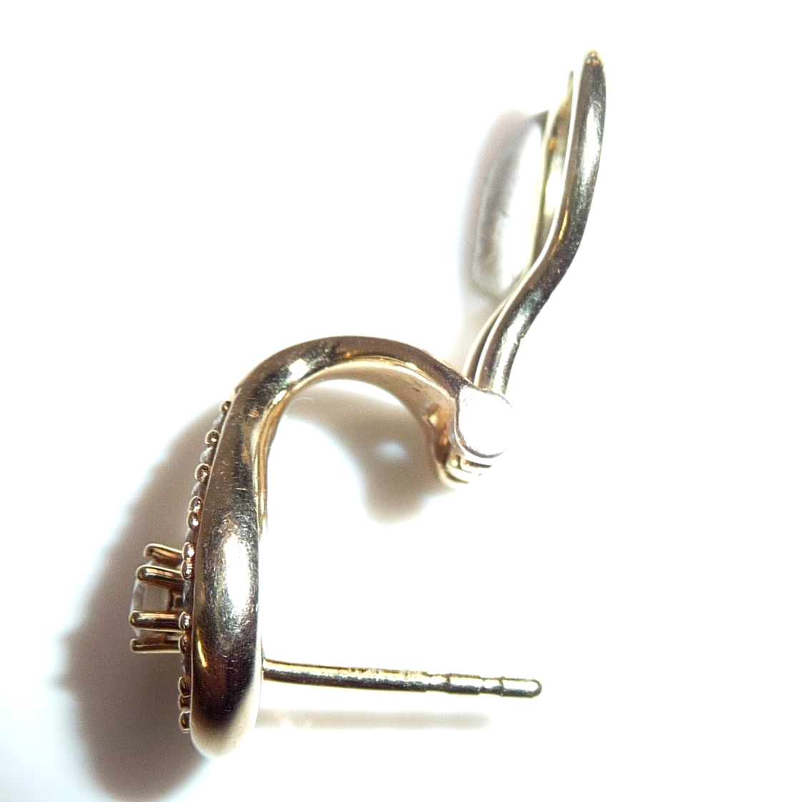 Ohrringe in 585/ 14 K Gelbgold. Die Ohrringe sind ein bisschen wie eine Schnecke geformt. Im Zentrum ist ein größerer Diamant, der von 13 kleineren Diamanten eingekreist wird. Insgesamt haben die 28 Diamanten 0.40 ct. Auf jedem Ohrring-Stift ist "0.20" mit Laser-Gravur eingepunzt. Alle Diamanten sind im Brillantschliff mit Farbe F und Reinheit VS-VVS. Die zentralen Diamanten haben jeweils etwa 0,07 ct.