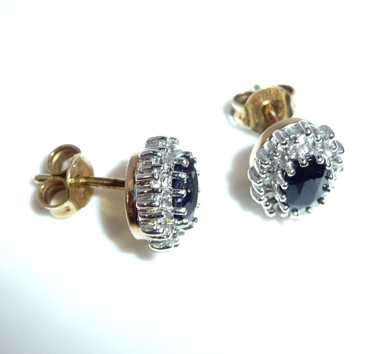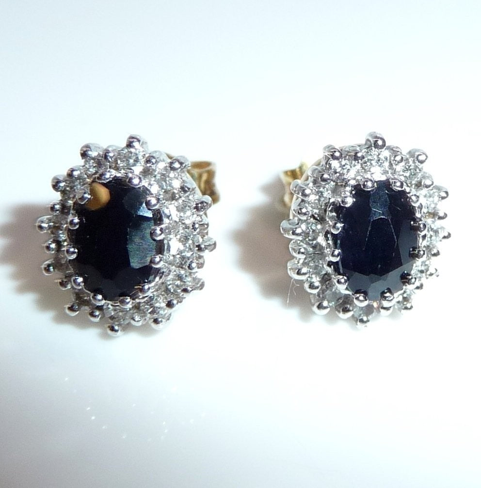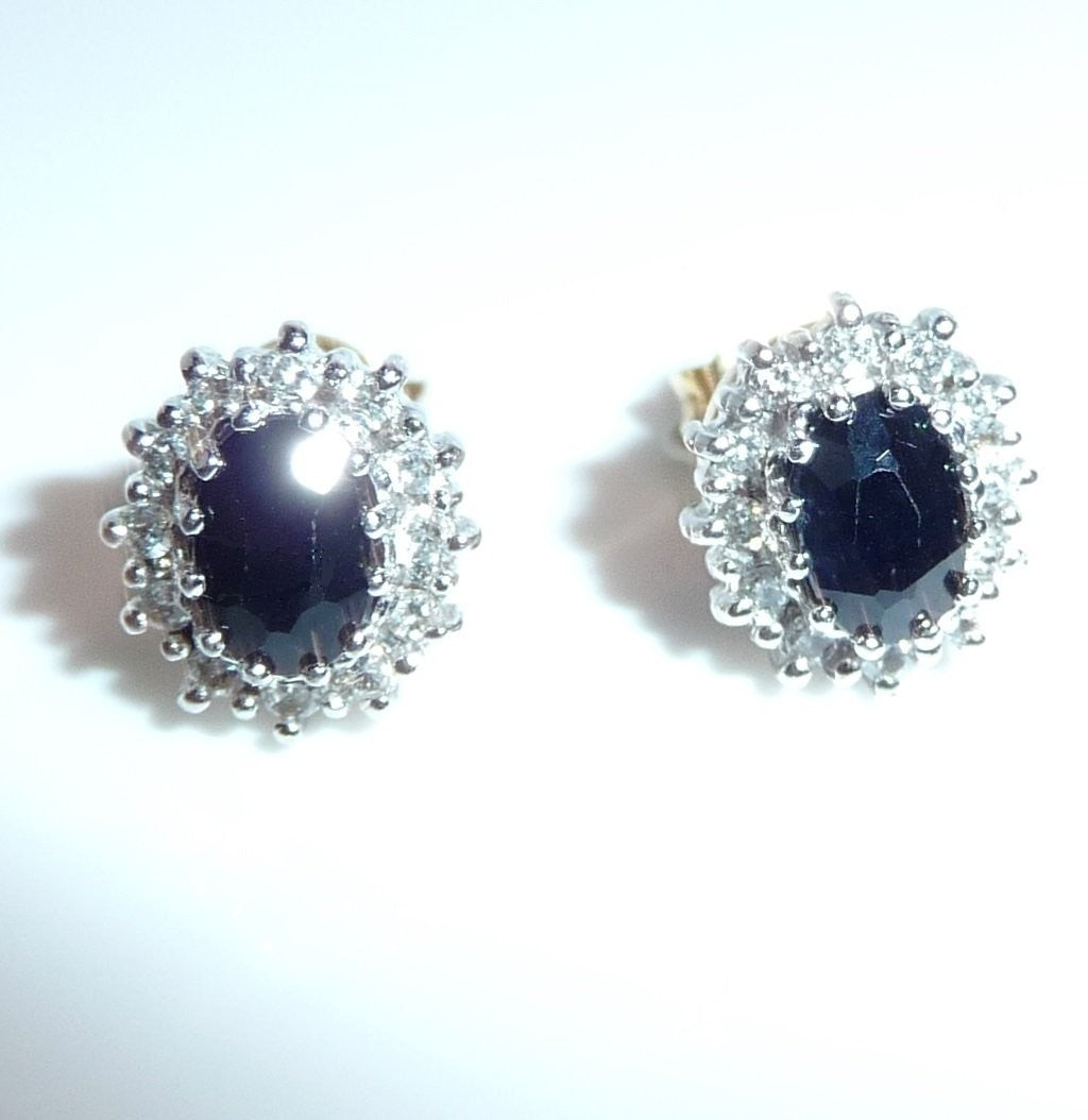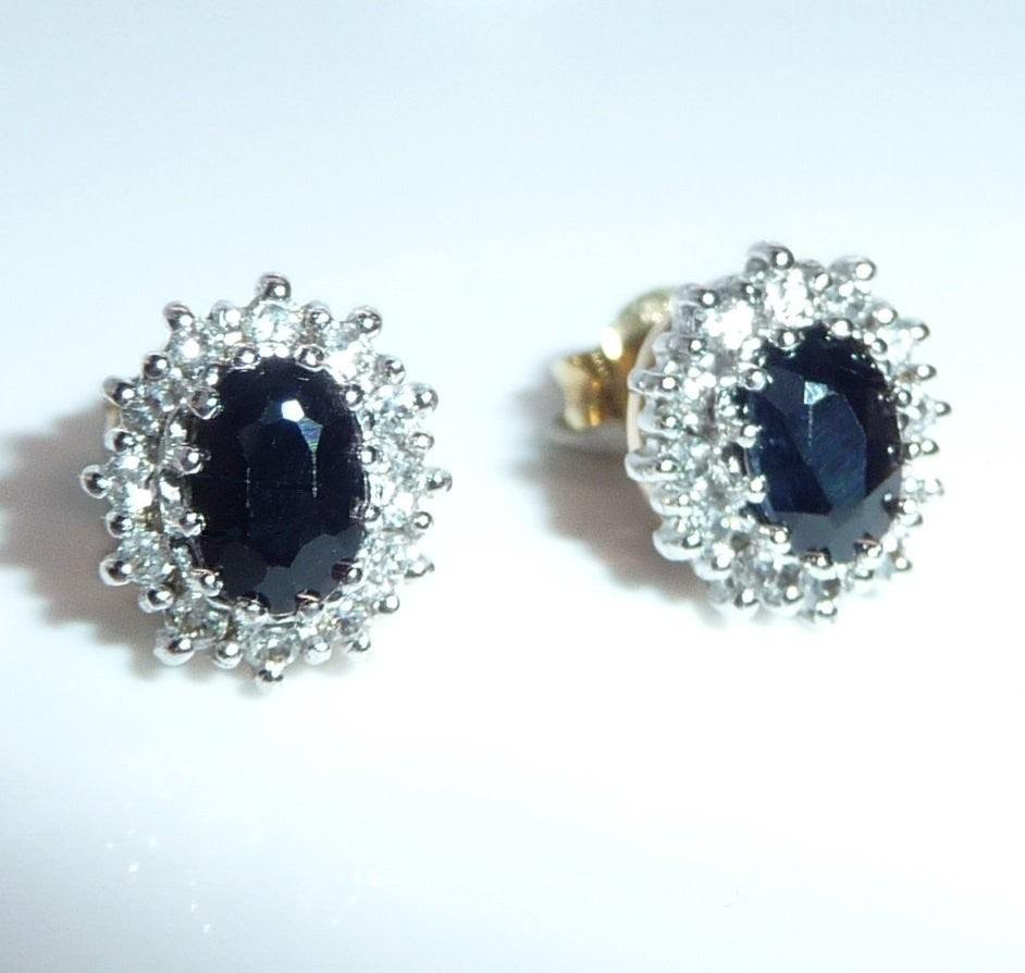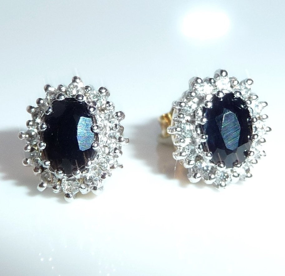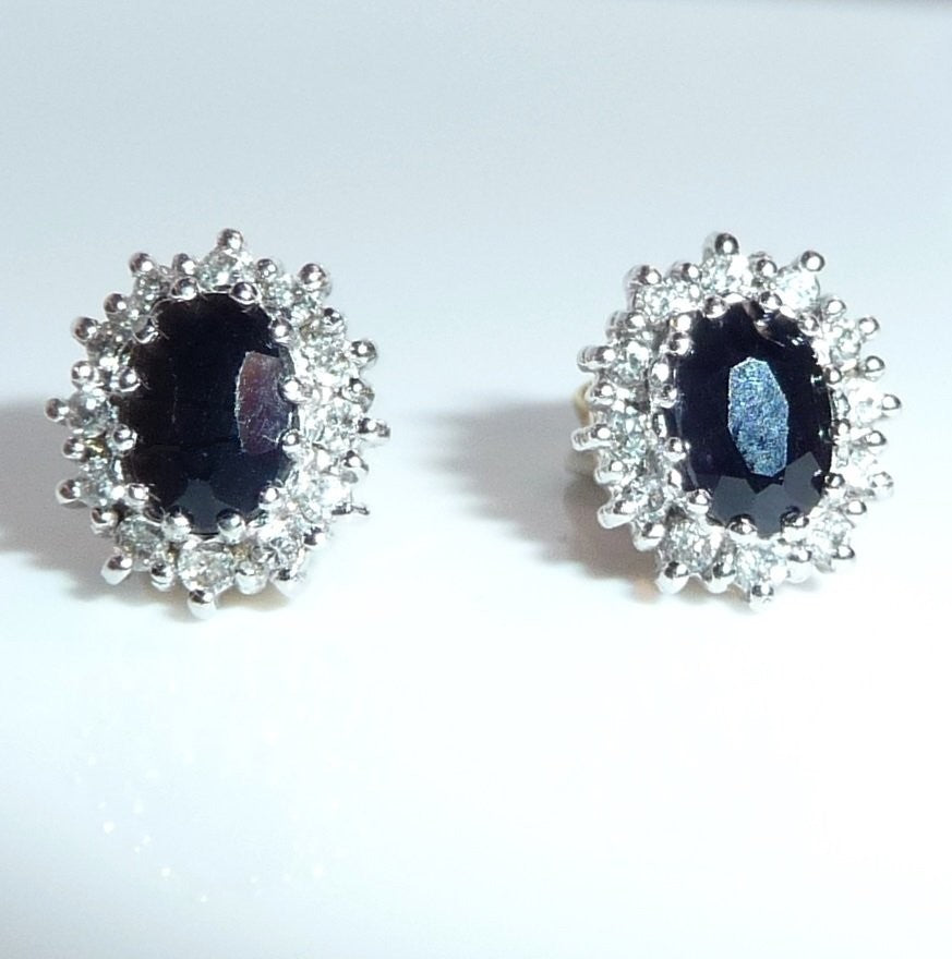 Ohrringe in 585/ 14 K Weißgold mit Gelbgold. Die Ohrringe sind wie kleine ovale Blüten gearbeitet. Im Zentrum ist ein ovaler, facettierter Saphir von jeweils 0.50 ct. Saphire total: 1.00 ct. Die beiden Saphire haben ein feines Dunkelblau. Die Saphire werden umrundet von 24 Diamanten im Brillantschliff von total 0.48 ct. (G-F/SI).