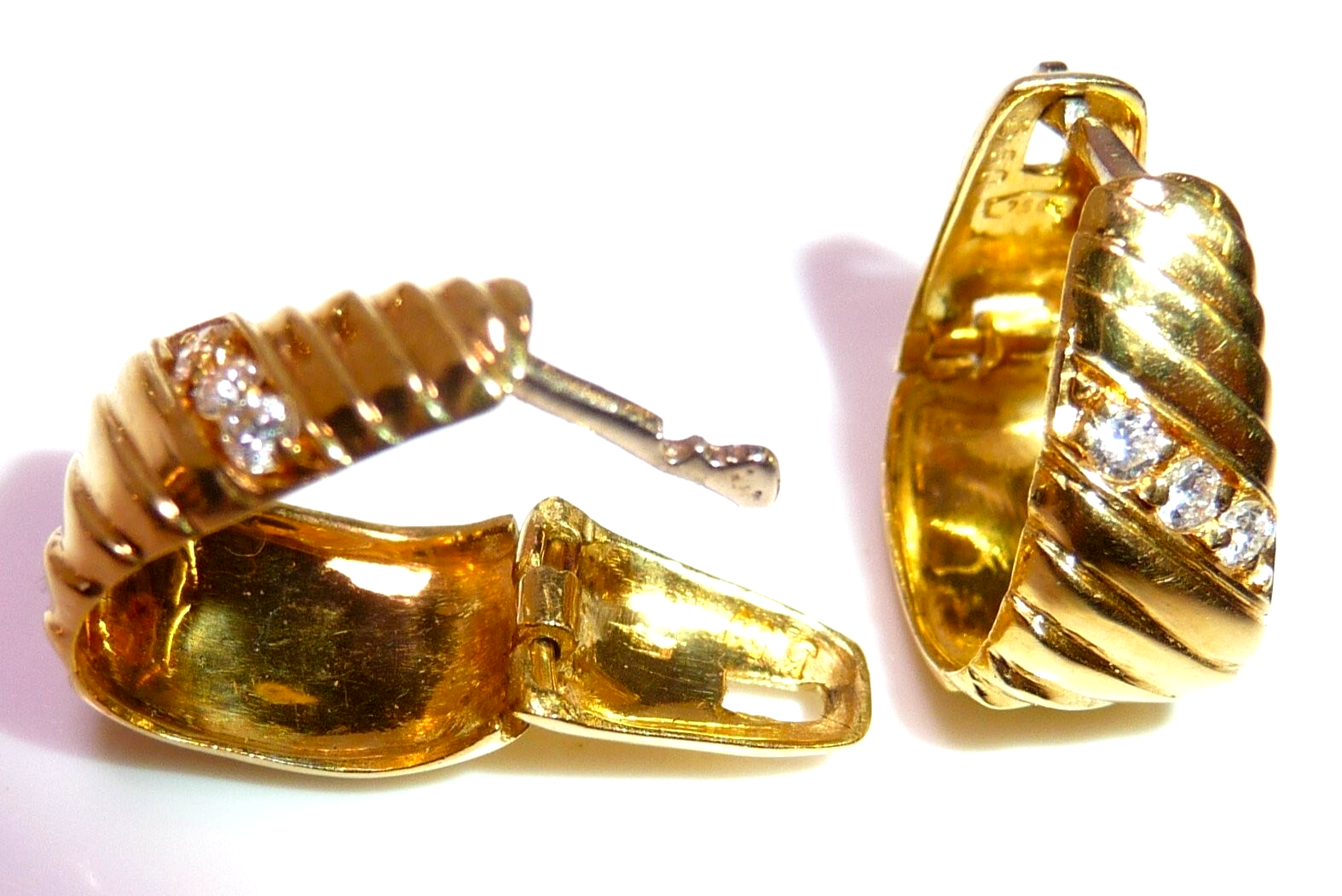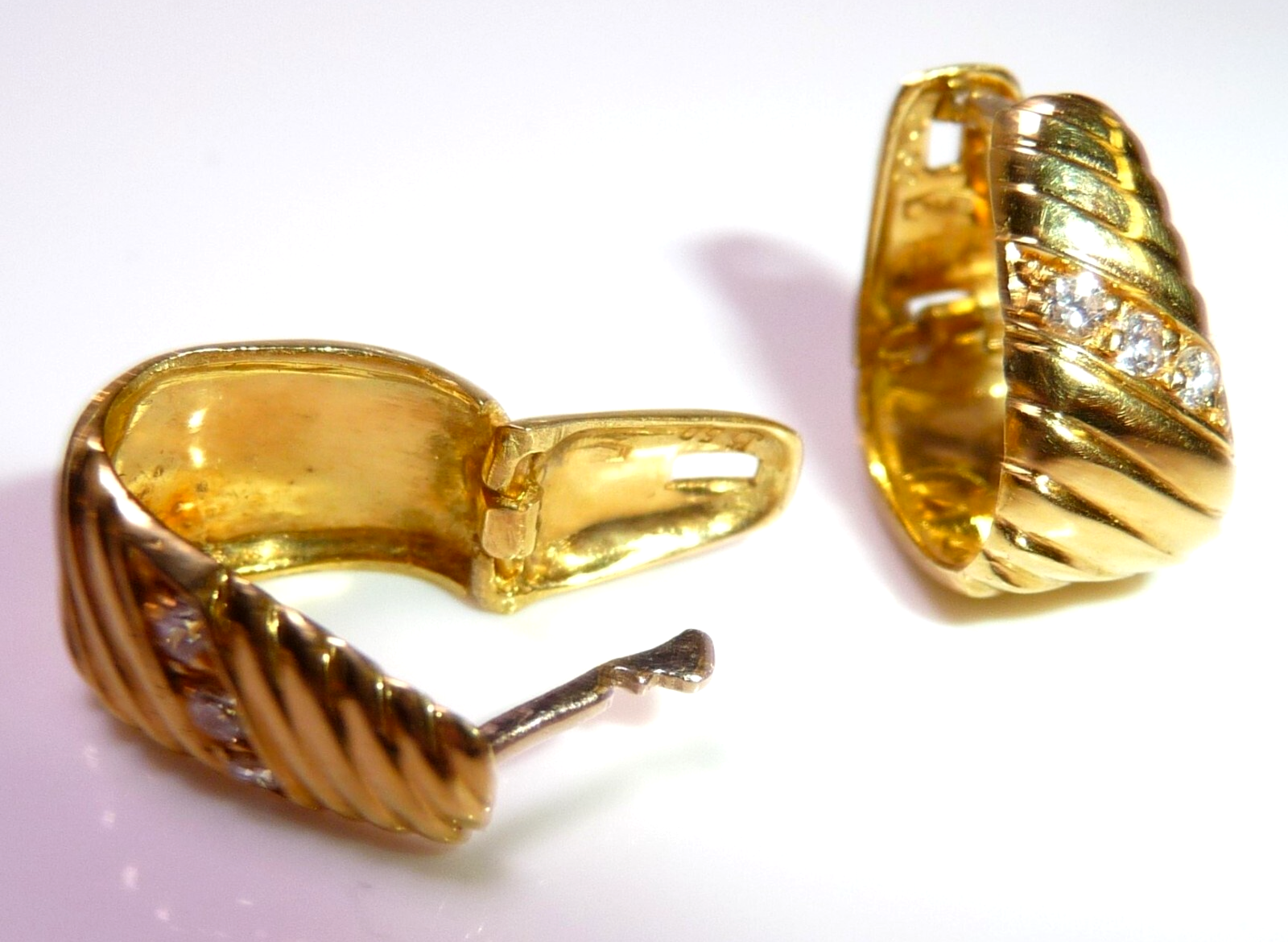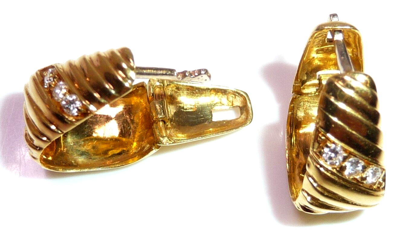 Ohrringe in 750 / 18 K Gelb-Gold. Die Ohrringe sind wie eine Art Creolen gearbeitet, wobei der hintere Bereich zum Aufklappen ist. Die Vorderseite ist mit diagonalen Streifen strukturiert. Ein diagonaler Streifen ist besetzt mit jeweils 3 Diamanten im Brillantschliff von total 0.15 ct. (F/VVS).