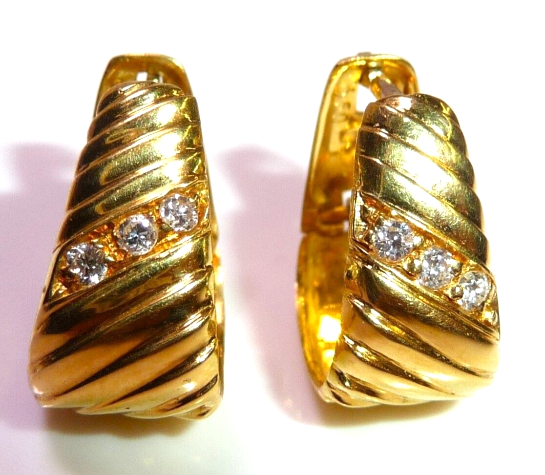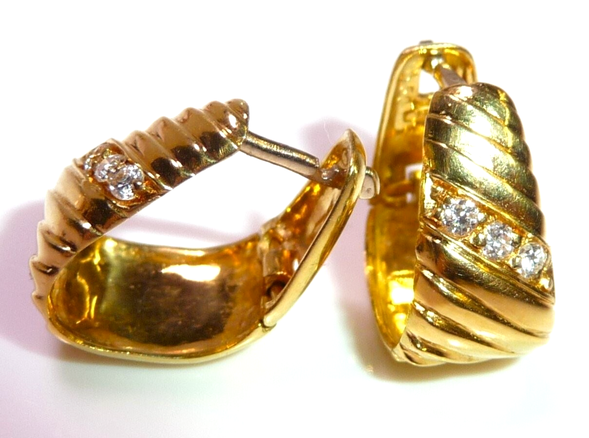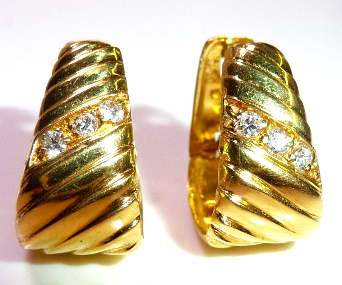 Ohrringe in 750 / 18 K Gelb-Gold. Die Ohrringe sind wie eine Art Creolen gearbeitet, wobei der hintere Bereich zum Aufklappen ist. Die Vorderseite ist mit diagonalen Streifen strukturiert. Ein diagonaler Streifen ist besetzt mit jeweils 3 Diamanten im Brillantschliff von total 0.15 ct. (F/VVS).
