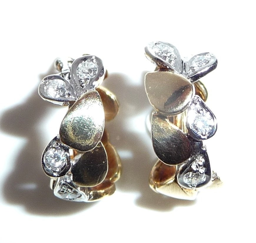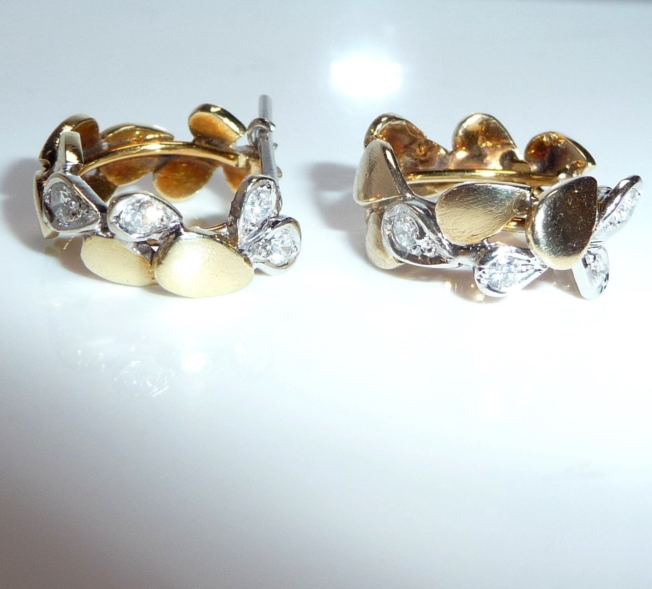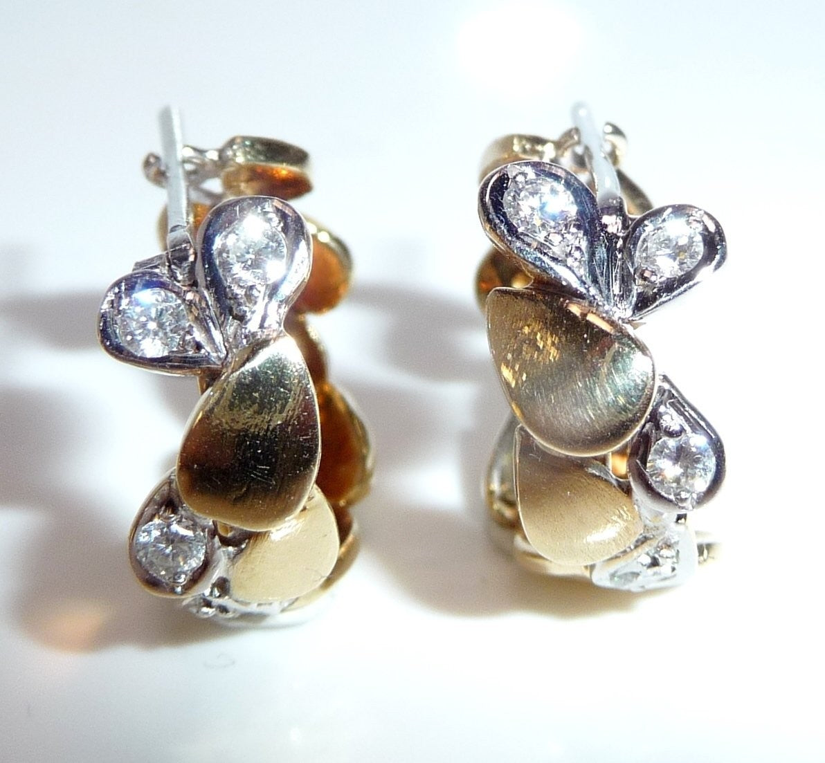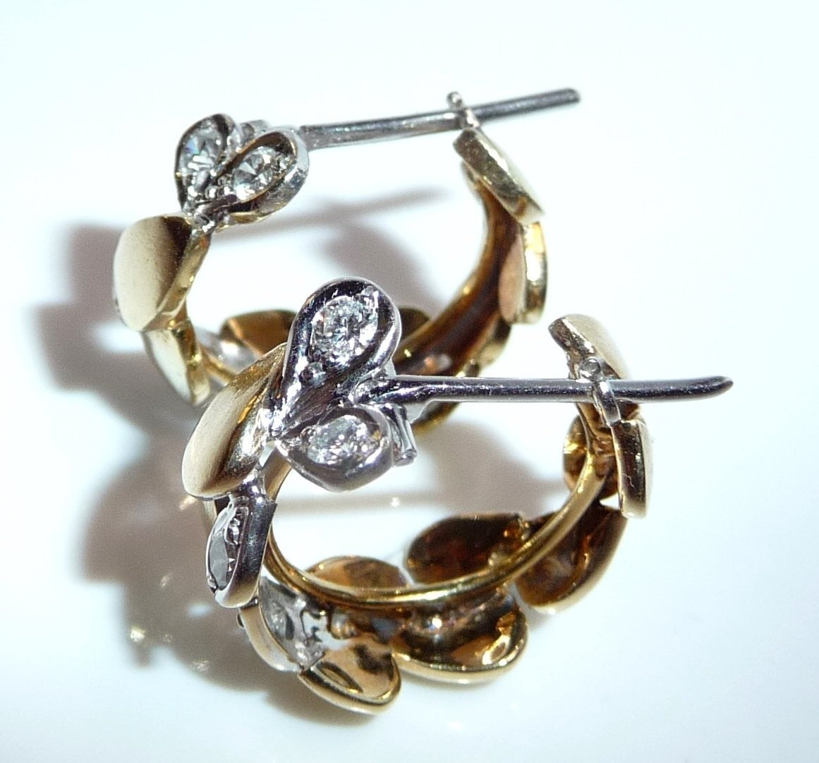 Ohrringe in 585/ 14 K Gelbgold mit Elementen in Weißgold. Die Ohrringe sind als Creolen gearbeitet. Die Creolen setzen sich aus kleinen Blättern zusammen, die sich zu einem Kreis formieren. Im vorderen Bereich sind je Ohrringe 4 Weißgold-Blätter eingearbeitet, die jeweils einen Diamanten im Brillantschliff von 0.05 ct. eingefasst haben. Zusammen haben die 8 Diamanten 0.40 ct. mit Farbe F und Reinheit VVS. Sehr exquisite Diamanten von großer Brillanz.