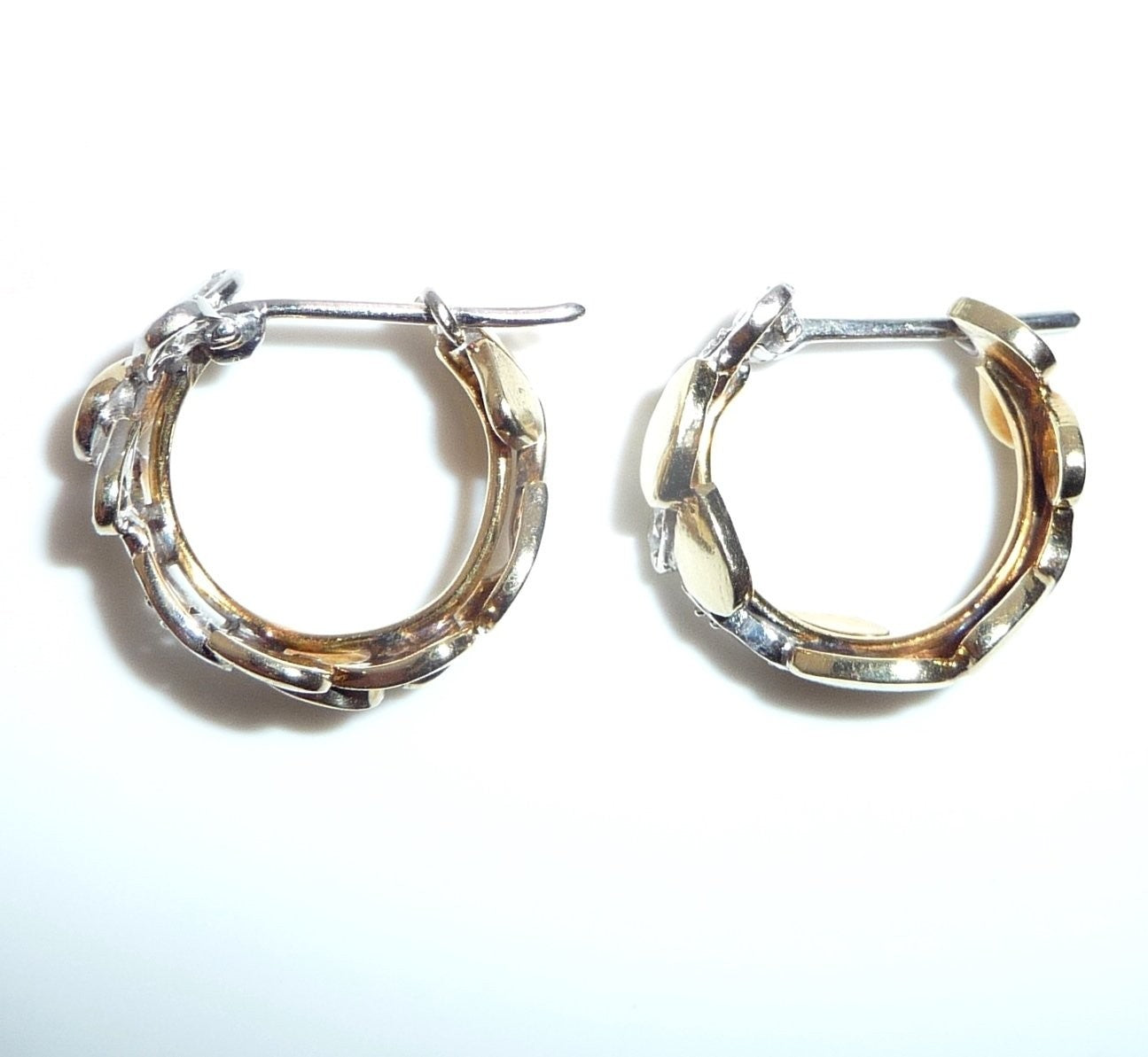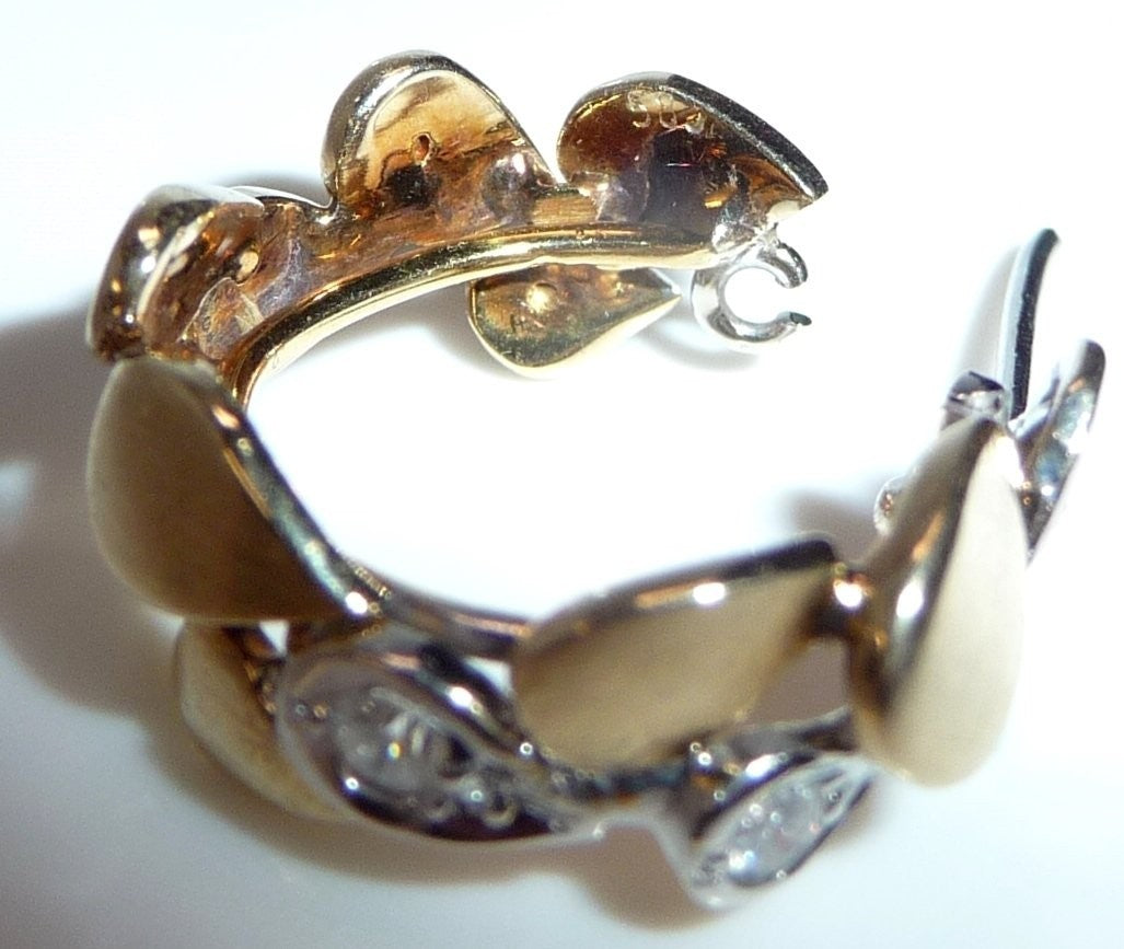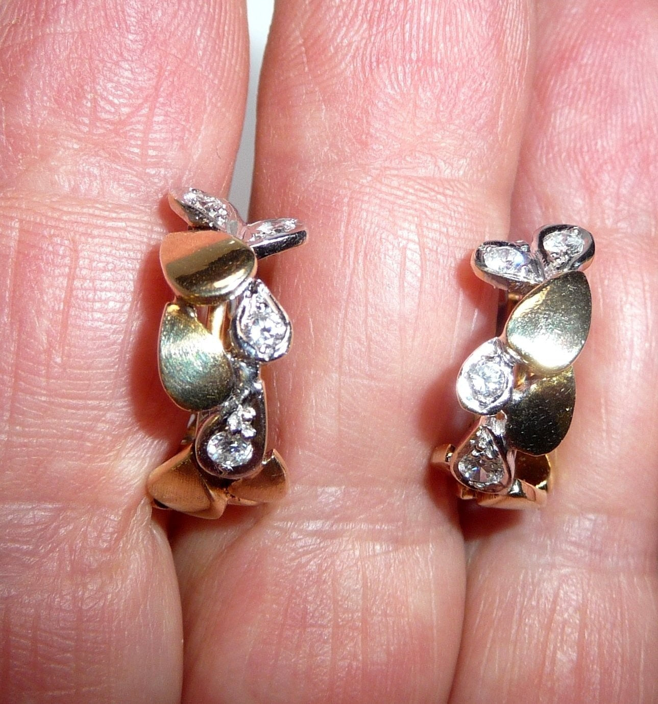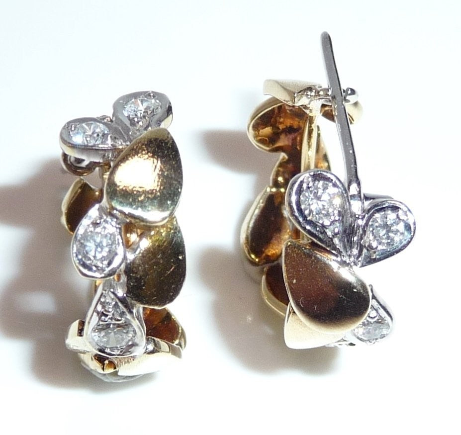 Ohrringe in 585/ 14 K Gelbgold mit Elementen in Weißgold. Die Ohrringe sind als Creolen gearbeitet. Die Creolen setzen sich aus kleinen Blättern zusammen, die sich zu einem Kreis formieren. Im vorderen Bereich sind je Ohrringe 4 Weißgold-Blätter eingearbeitet, die jeweils einen Diamanten im Brillantschliff von 0.05 ct. eingefasst haben. Zusammen haben die 8 Diamanten 0.40 ct. mit Farbe F und Reinheit VVS. Sehr exquisite Diamanten von großer Brillanz.