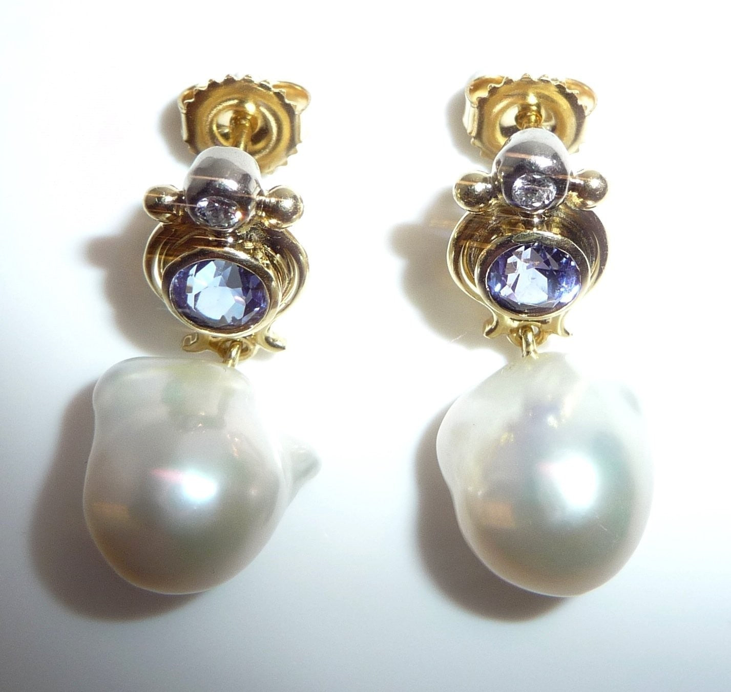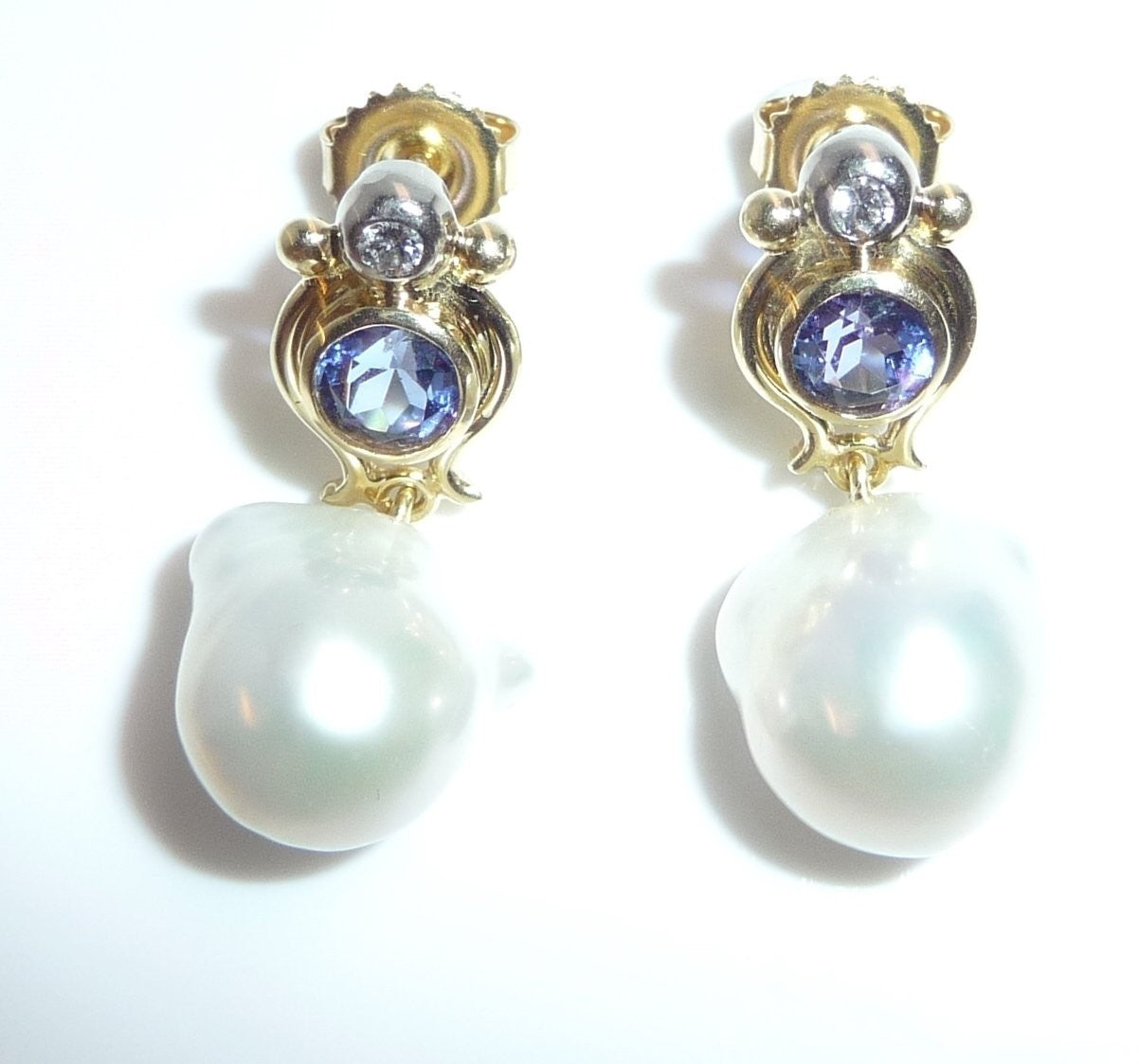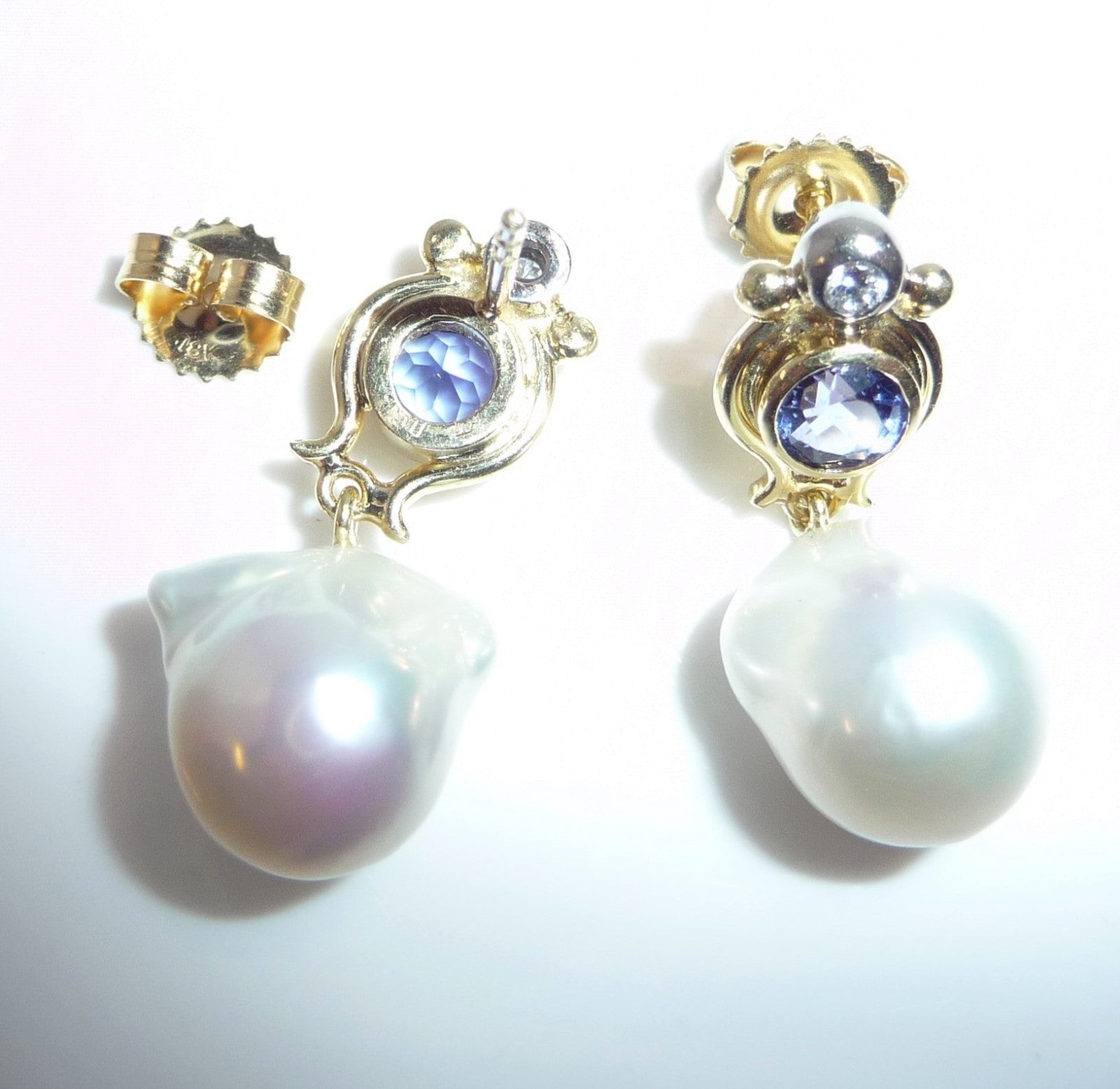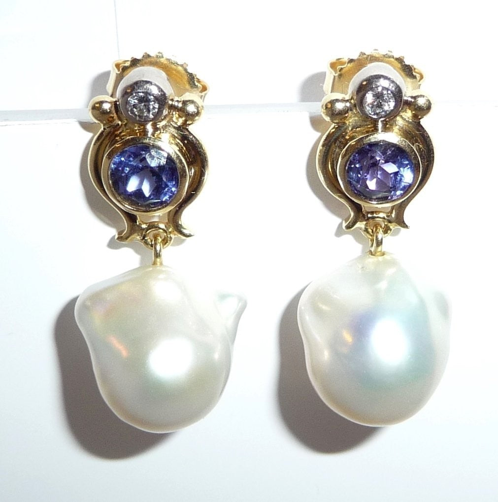 Ohrringe in 750 Gelbgold Südsee Perlen 2.0ct Tansanite Diamanten 27,6 mm lang