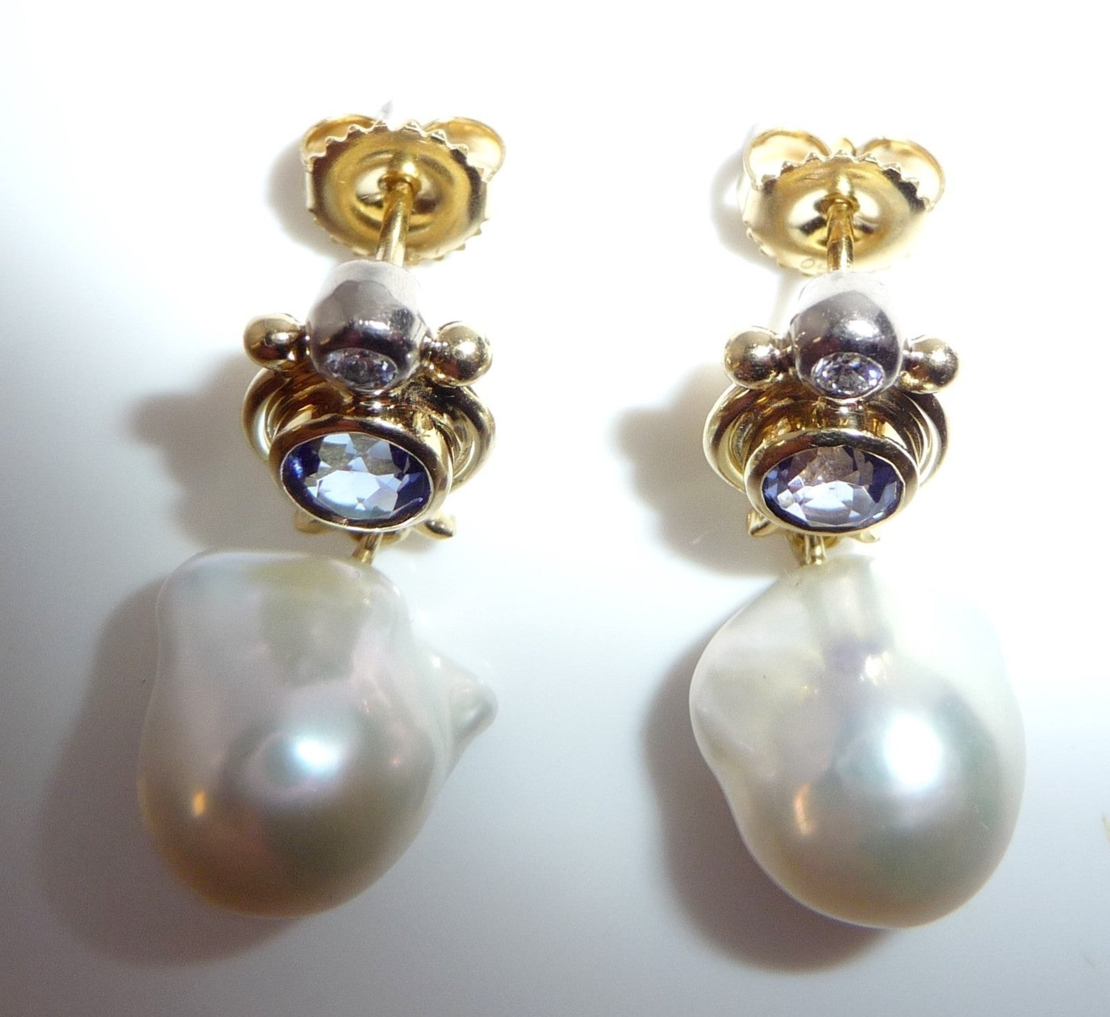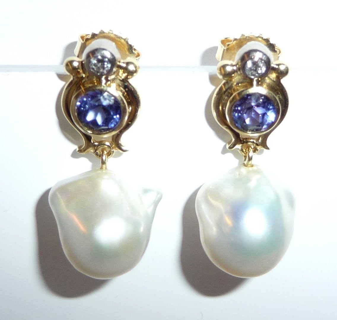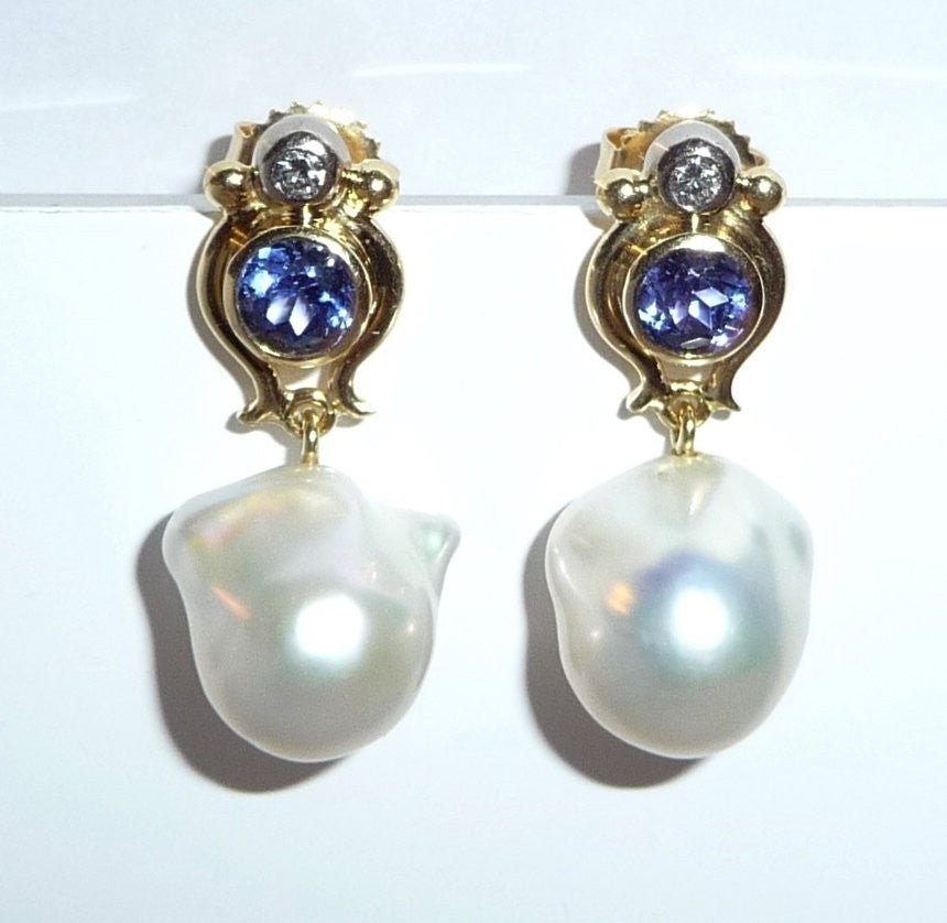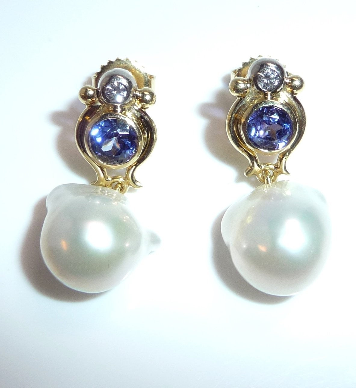 Ohrringe in 750 Gelbgold Südsee Perlen 2.0ct Tansanite Diamanten 27,6 mm lang