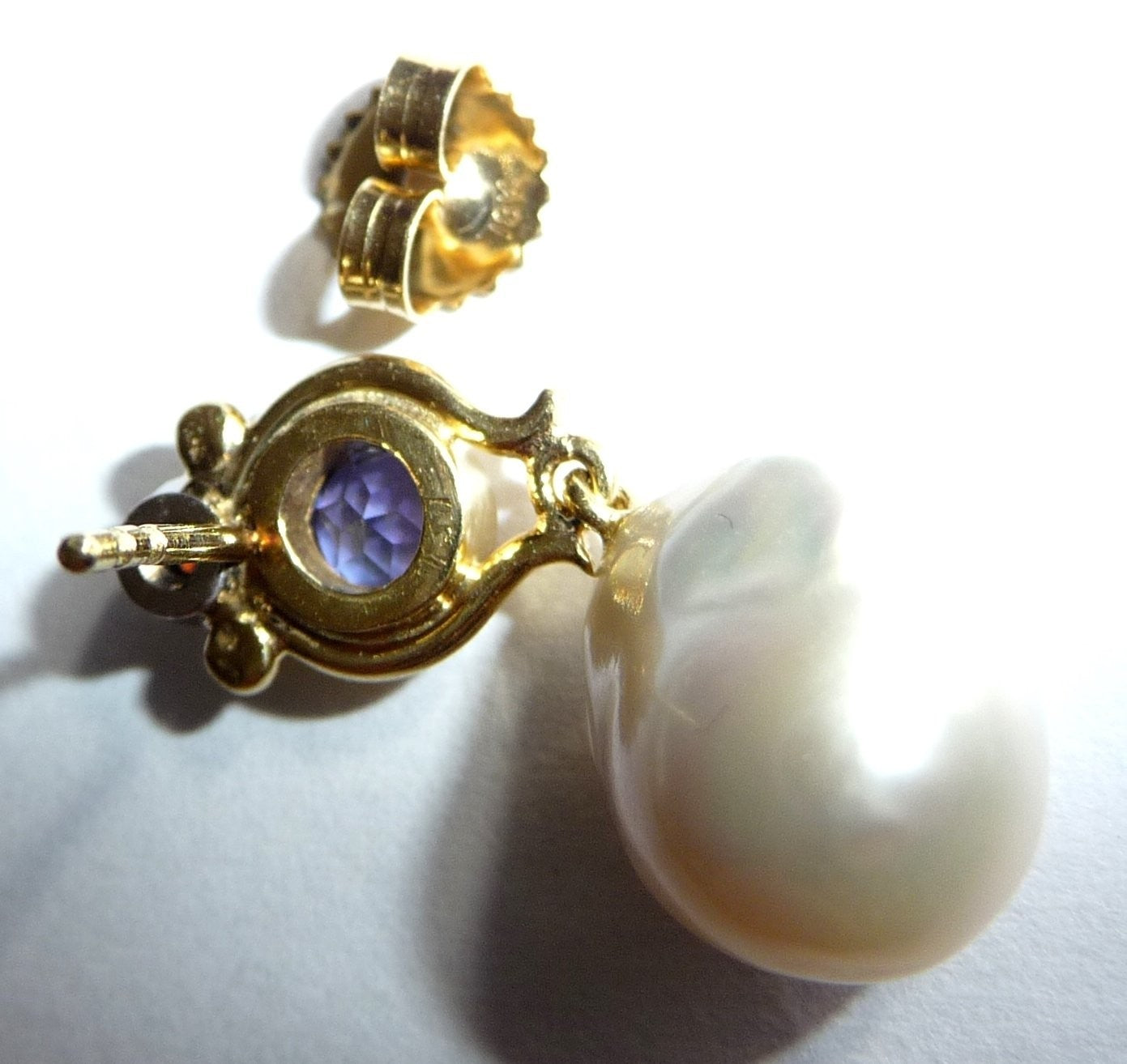 Die Ohrringe bestehen aus 2 Komponenten: einem Gold-Element und einer barocken Südsee-Perle die frei beweglich verbunden ist. Die beiden Südsee-Perlen haben einen feinen hell-silbrigen Lüster und einen maximalen Durchmesser von zwischen 11,5-12,5 mm.