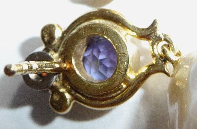 Im oberen Teil ist je ein facettierter runder Tansanit von sehr guter Farb-Qualität eingefasst. Zusammen haben die beiden Tansanite ca. 0.80 ct. Darüber ist jeweils ein Diamant im Brillantschliff in eine Weißgold-Zarge eingefasst. Die beiden Diamanten haben zusammen 0.08 ct. (G/VS) mit Durchmesser von 2,2 mm.