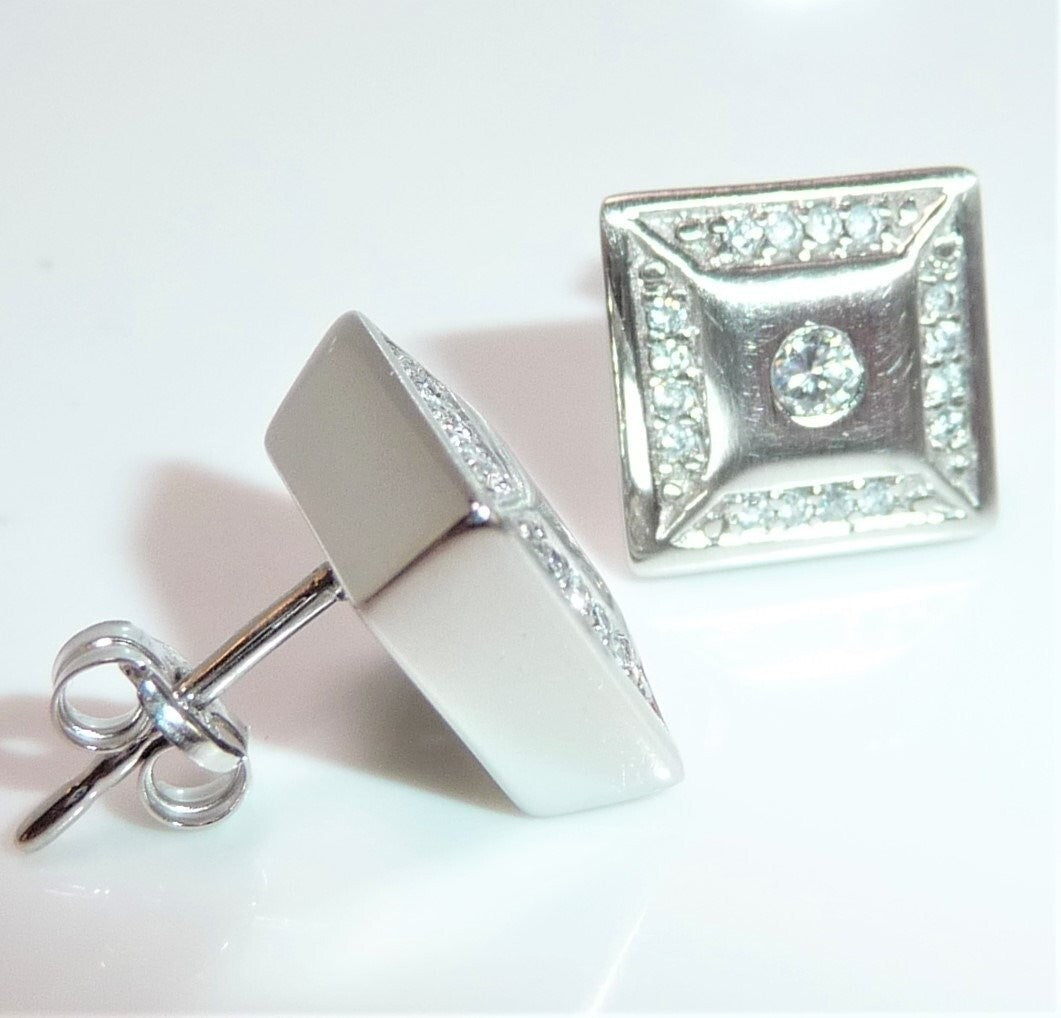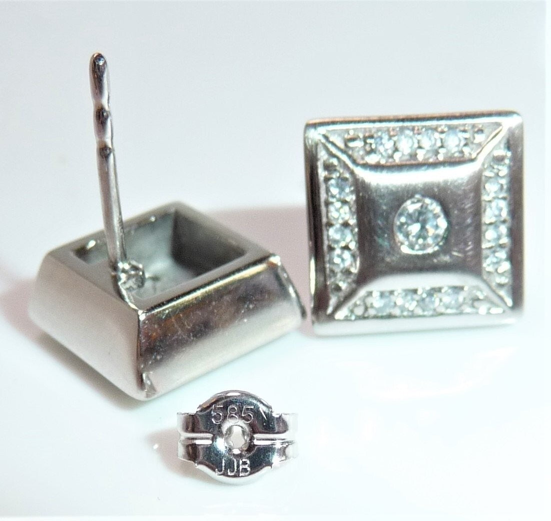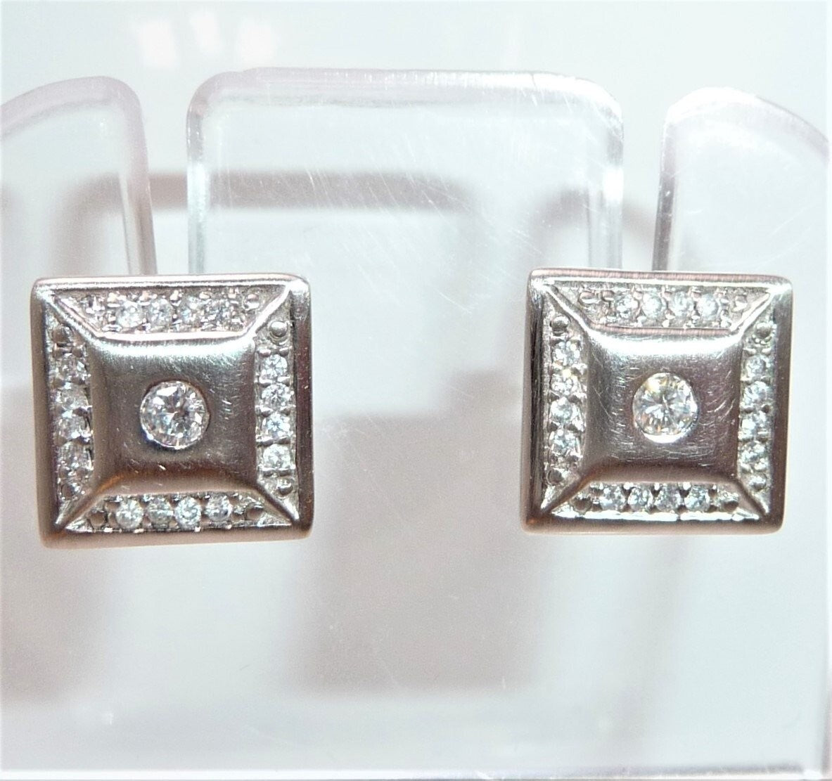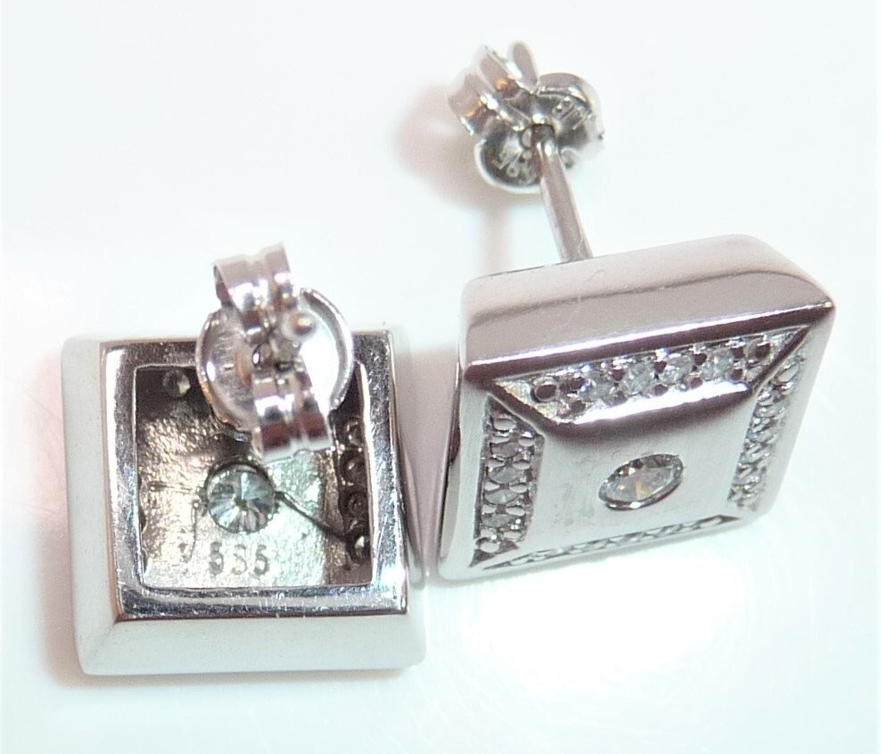 Ohrringe in 585 / 14 K Weißgold. Die Ohrringe sind quadratisch gearbeitet und heben sich durch den angeschrägten seitlichen Rahmen etwas vom Ohr ab. Die Vorderseite ist edel mattiert. Ein Rahmen von jeweils 16 Diamanten im Brillantschliff lässt die Außenbereiche funkeln. Im Zentrum ist je ein Diamant im Brillantschliff von 0.04 ct. (G/VS). Diamanten total ca. 0.40 ct. G/VS-SI.