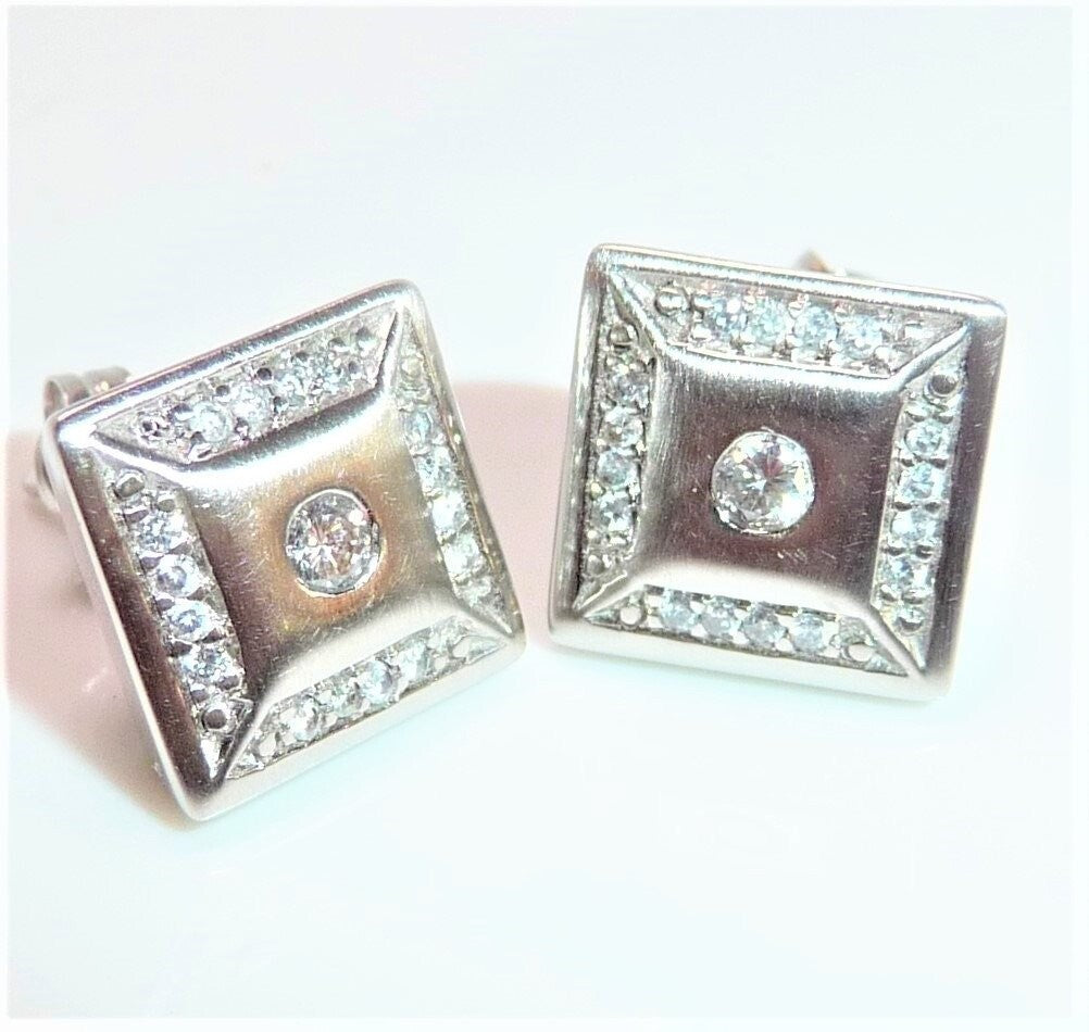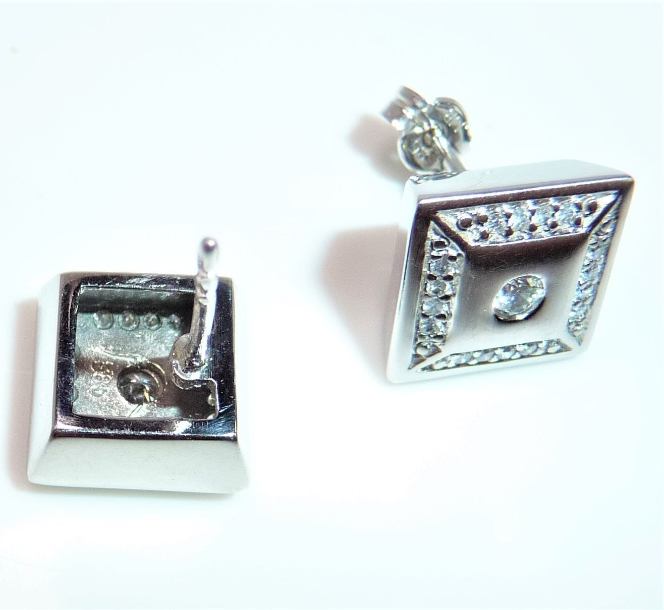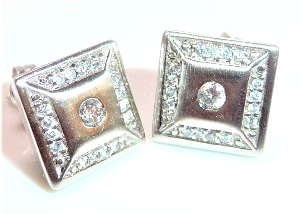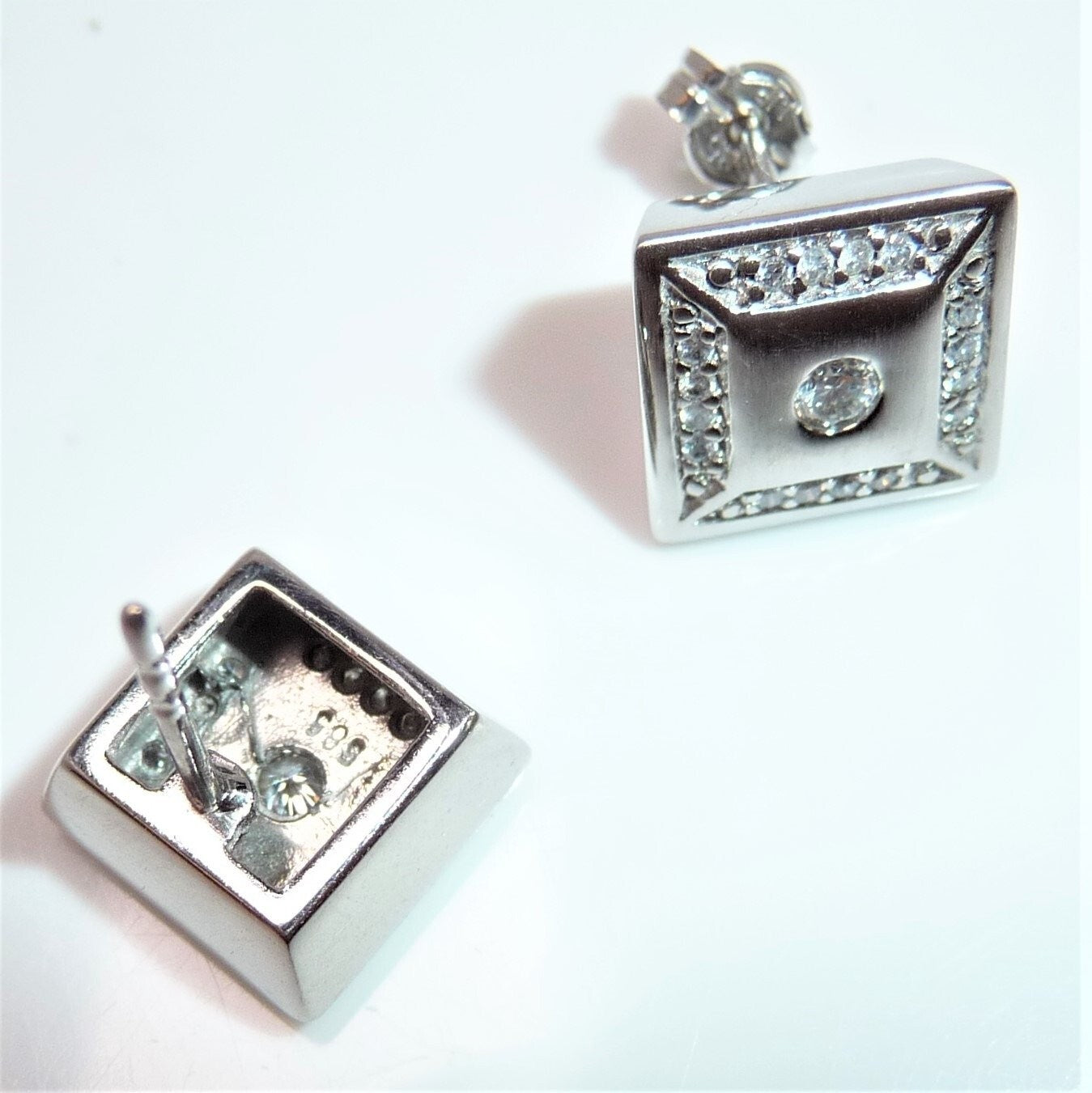 Ohrringe in 585 / 14 K Weißgold. Die Ohrringe sind quadratisch gearbeitet und heben sich durch den angeschrägten seitlichen Rahmen etwas vom Ohr ab. Die Vorderseite ist edel mattiert. Ein Rahmen von jeweils 16 Diamanten im Brillantschliff lässt die Außenbereiche funkeln. Im Zentrum ist je ein Diamant im Brillantschliff von 0.04 ct. (G/VS). Diamanten total ca. 0.40 ct. G/VS-SI.