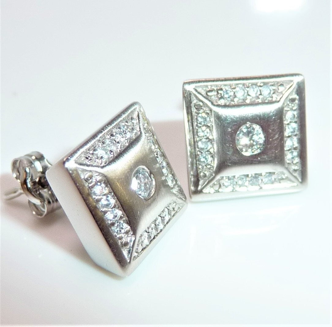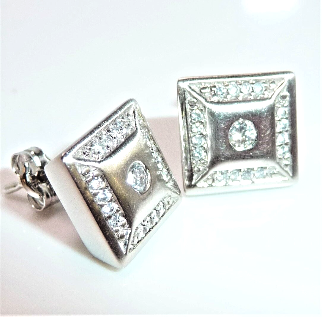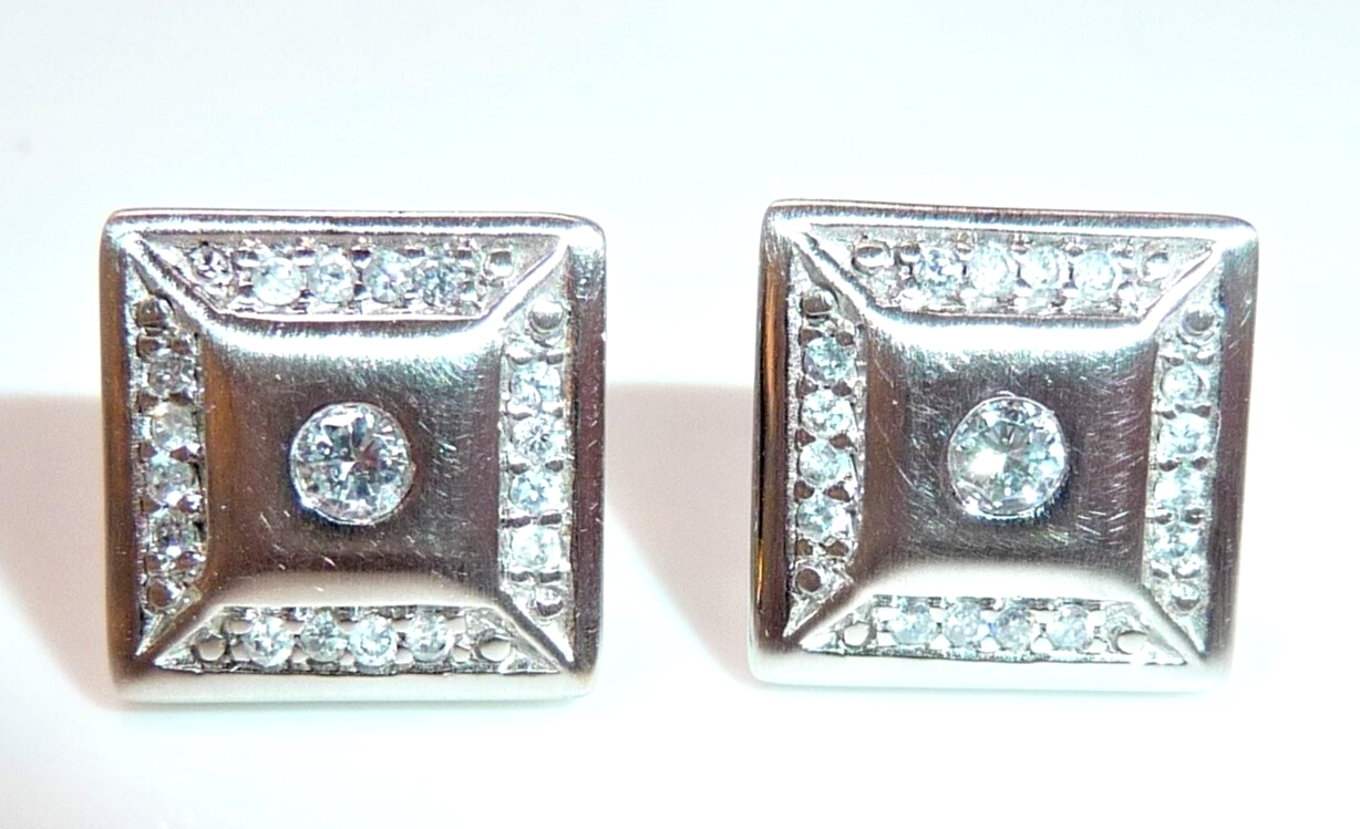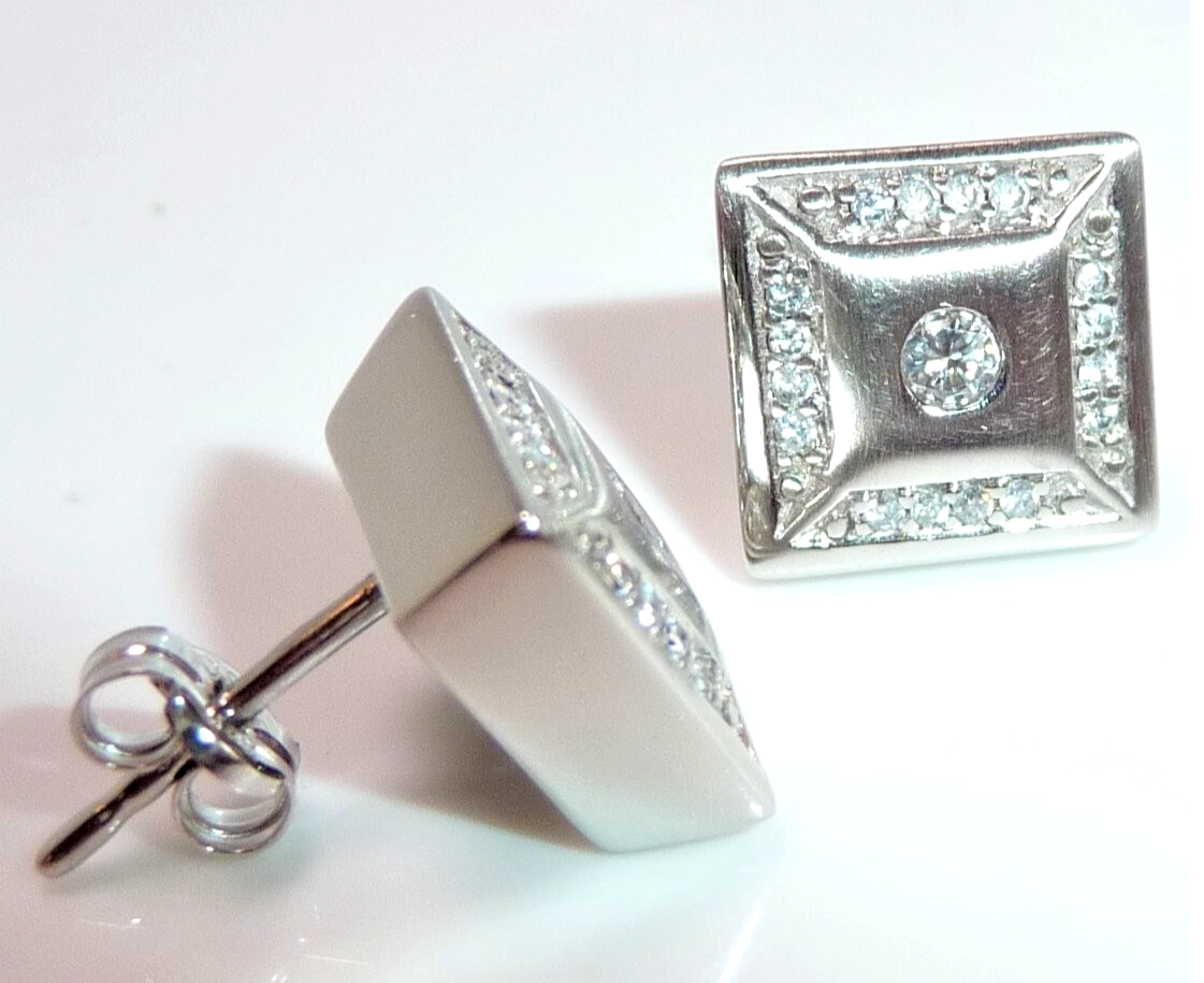 Ohrringe in 585 / 14 K Weißgold. Die Ohrringe sind quadratisch gearbeitet und heben sich durch den angeschrägten seitlichen Rahmen etwas vom Ohr ab. Die Vorderseite ist edel mattiert. Ein Rahmen von jeweils 16 Diamanten im Brillantschliff lässt die Außenbereiche funkeln. Im Zentrum ist je ein Diamant im Brillantschliff von 0.04 ct. (G/VS). Diamanten total ca. 0.40 ct. G/VS-SI.