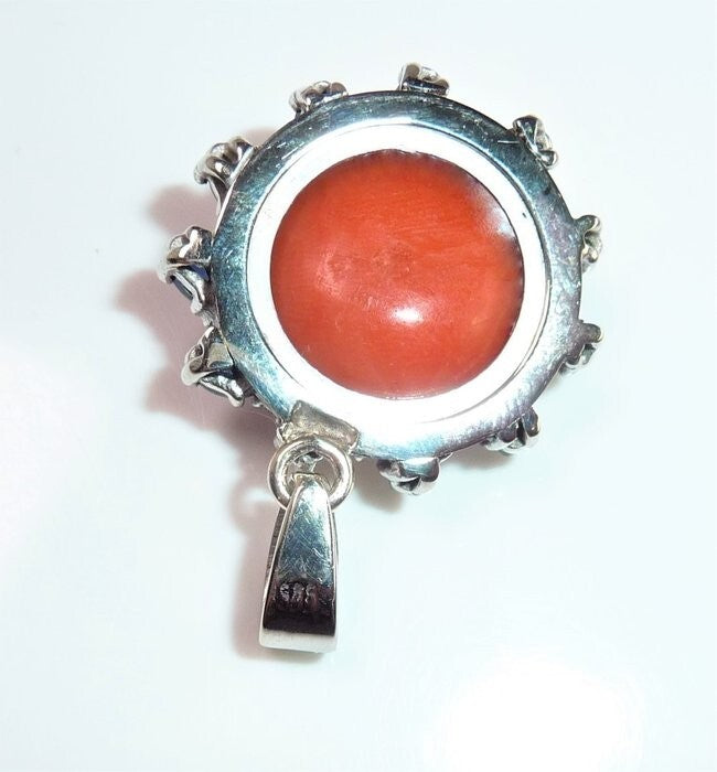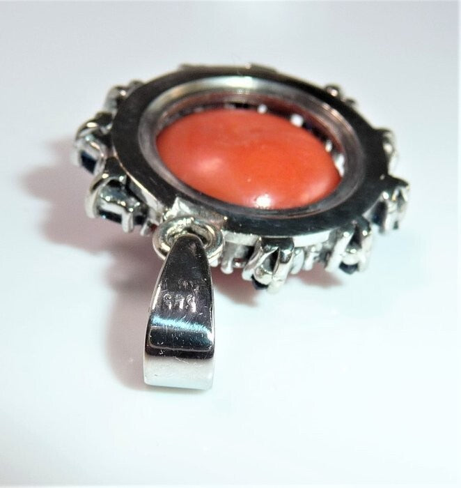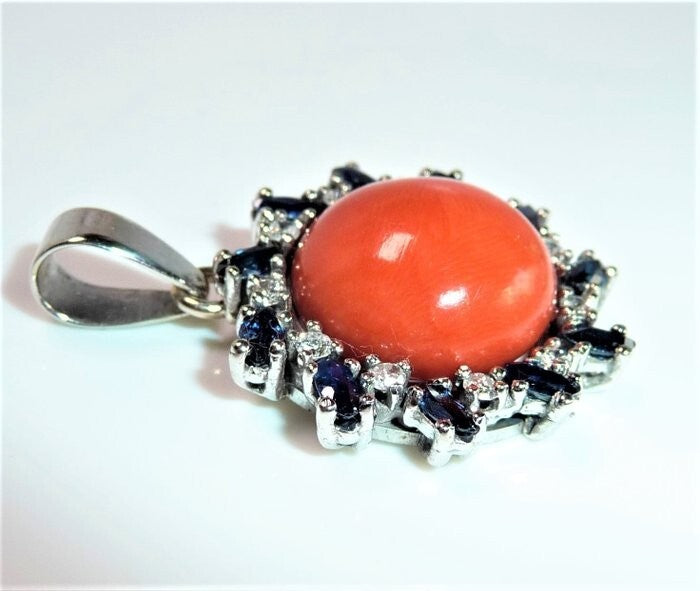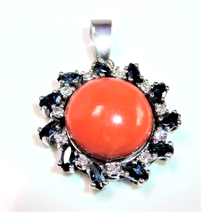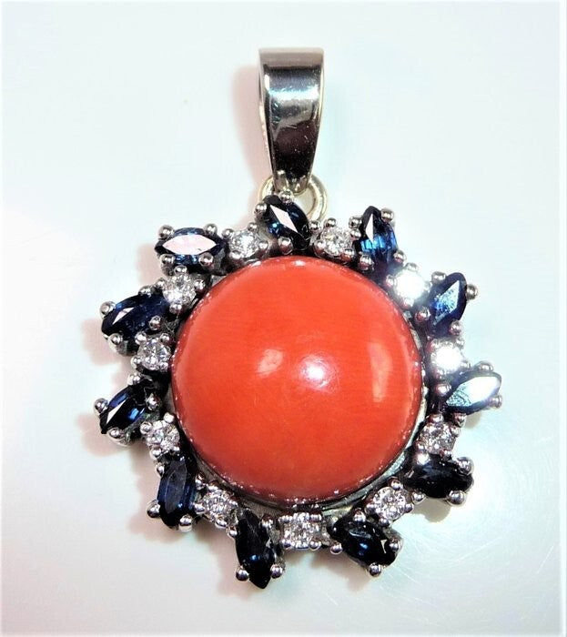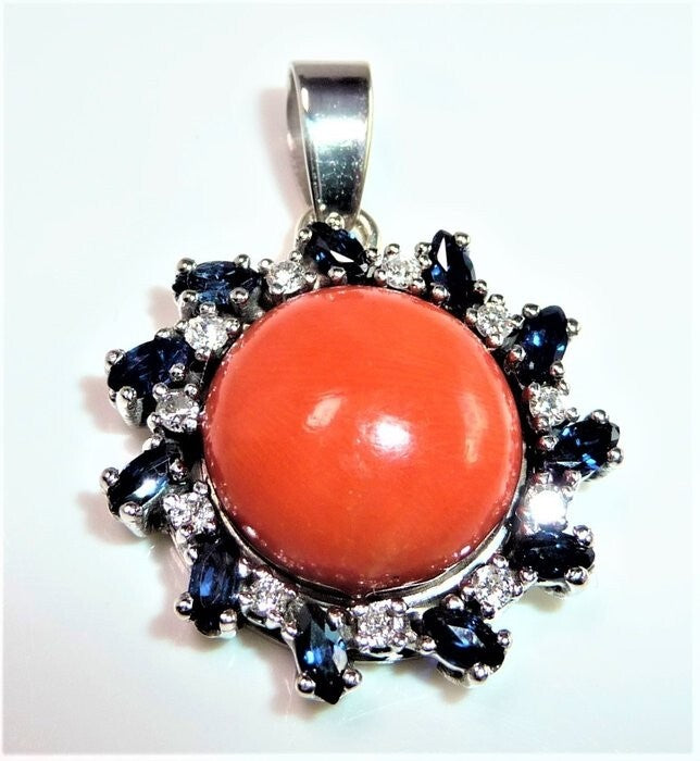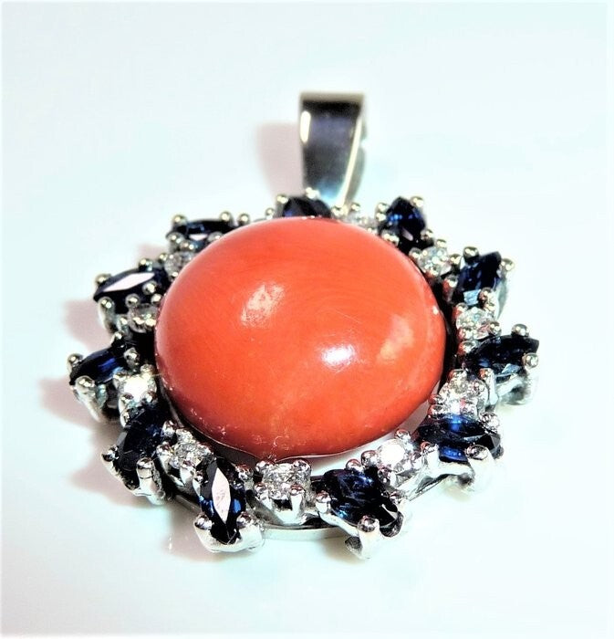 Anhänger in 14 K / 585 Weißgold. Der Anhänger hat einen Kranz von Edelsteinen und im Zentrum ist eine antike Mittelmeer-Koralle von spektakulären 15 mm Durchmesser. Die Koralle ist als Button geschliffen. Der äußere Weißgold-Kranz ist besetzt mit 11 Saphiren im Marquise-Schliff von total 1.50 ct. und 11 Diamanten im Brillantschliff von total 0.33 ct. (H/SI).