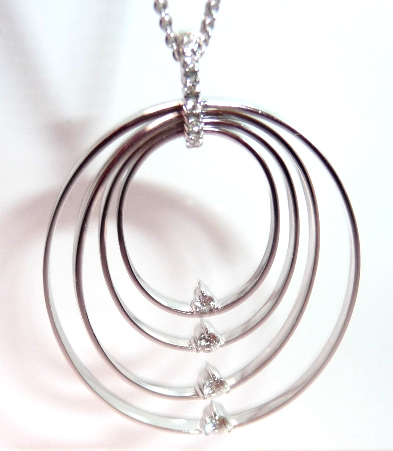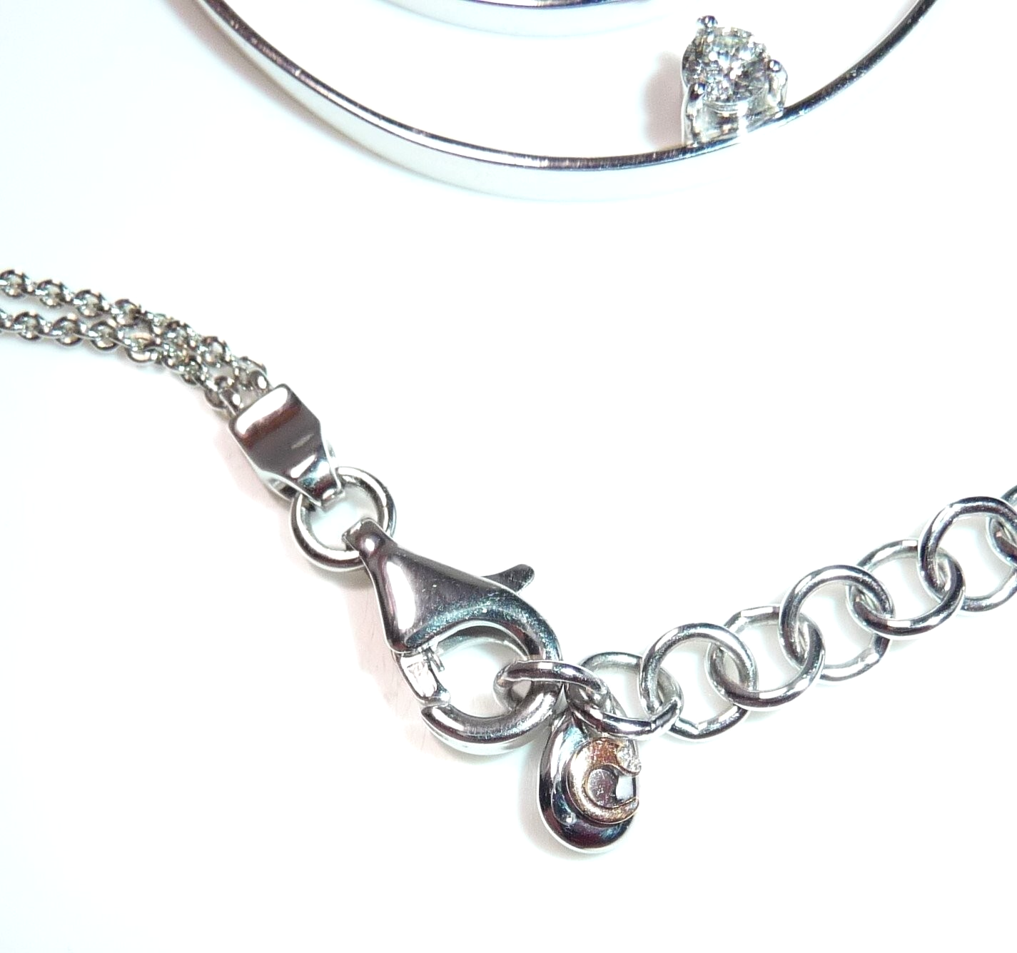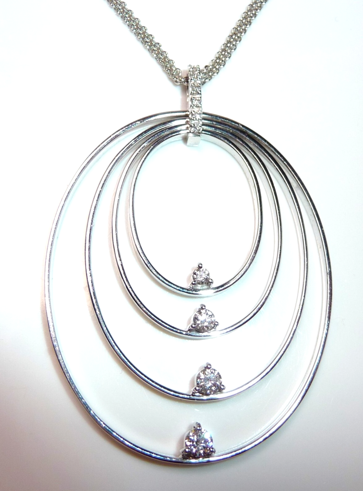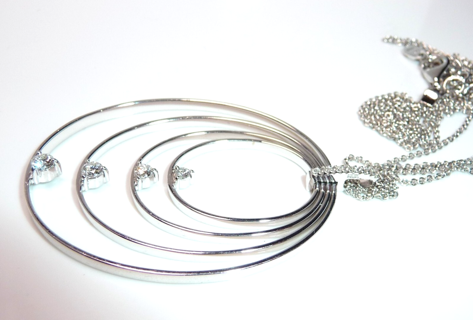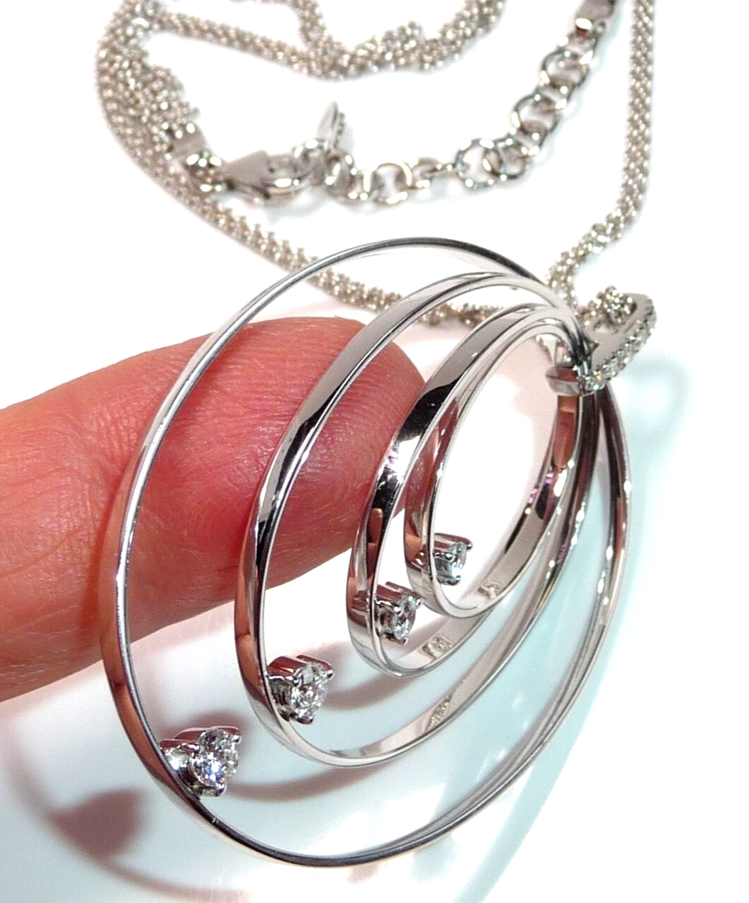 Kreativer Anhänger in 585 / 14 kt Weißgold. Der Anhänger hat eine italienische Eich-Punze aus Allessandria und eine Herstellermarke ("C") mit kleinem Diamanten darin. Das Design des Anhängers besteht aus 4 ovalen Spiralen, die nach innen kontinuierlich kleiner werden. Die 4 Ovale sind unabhängig voneinander beweglich und haben einen eingeschränkten Bewegungsradius nach vorne, hinten und zu beiden Seiten. Gehalten werden sie von einer länglichen Schlaufe, die mit Diamanten besetzt ist.