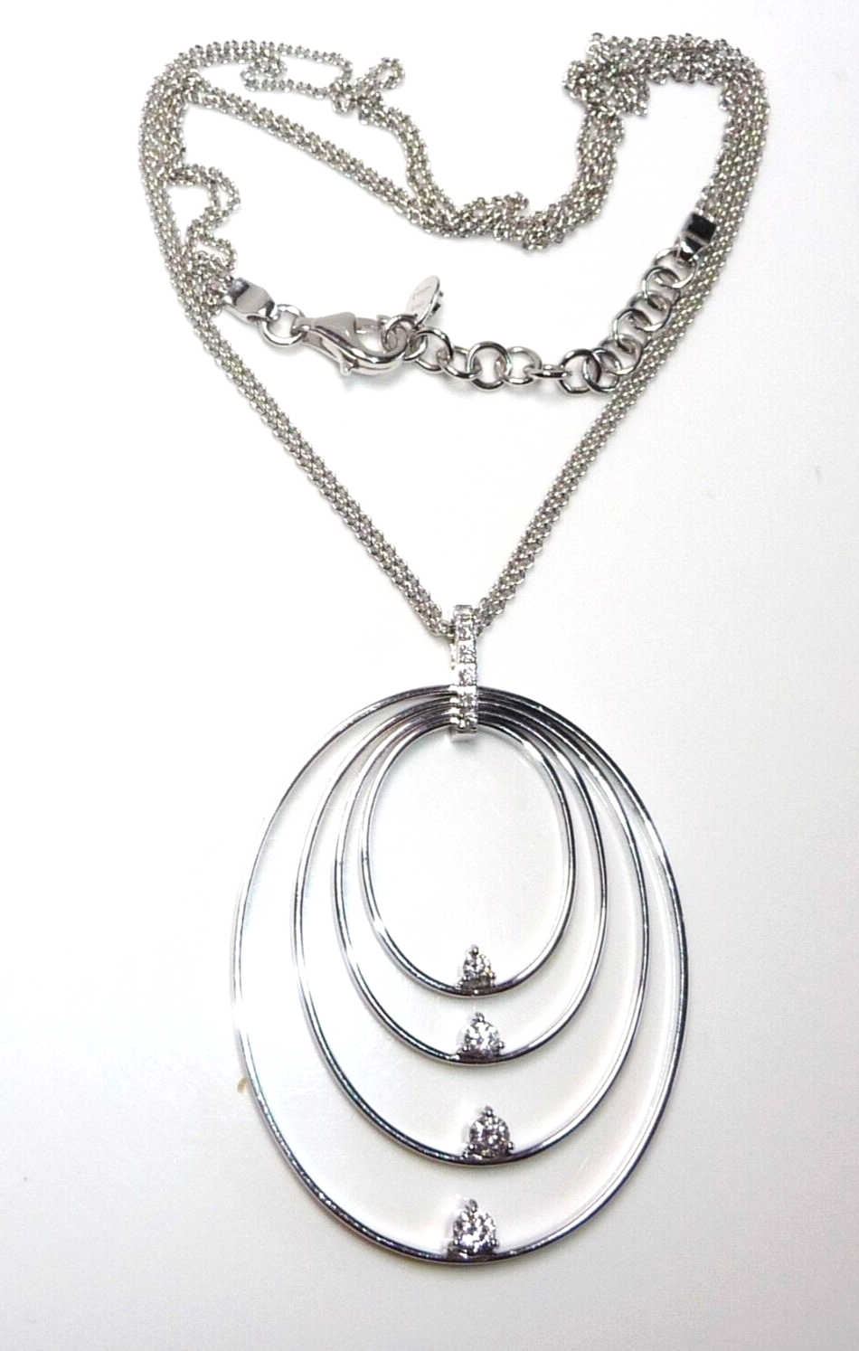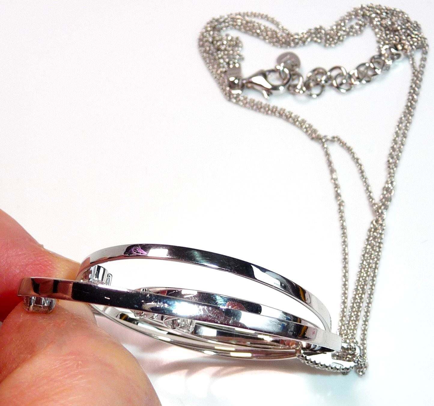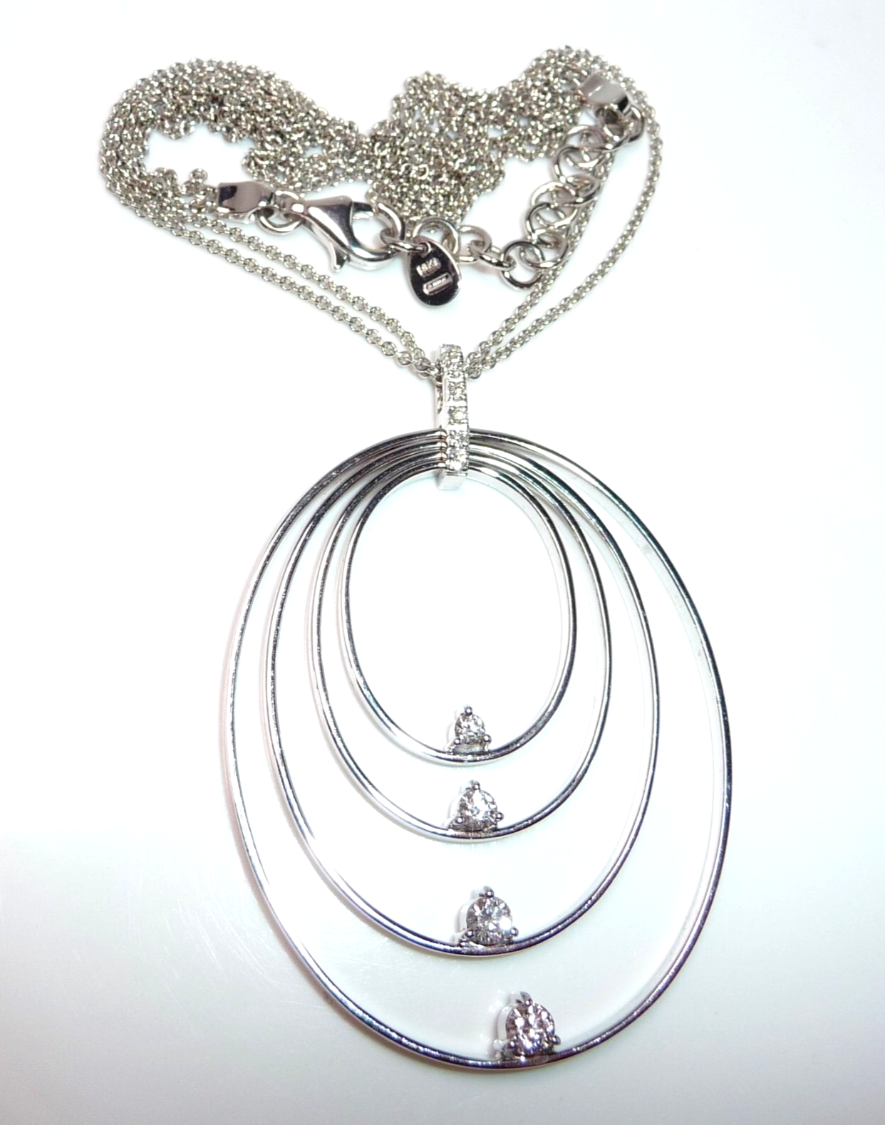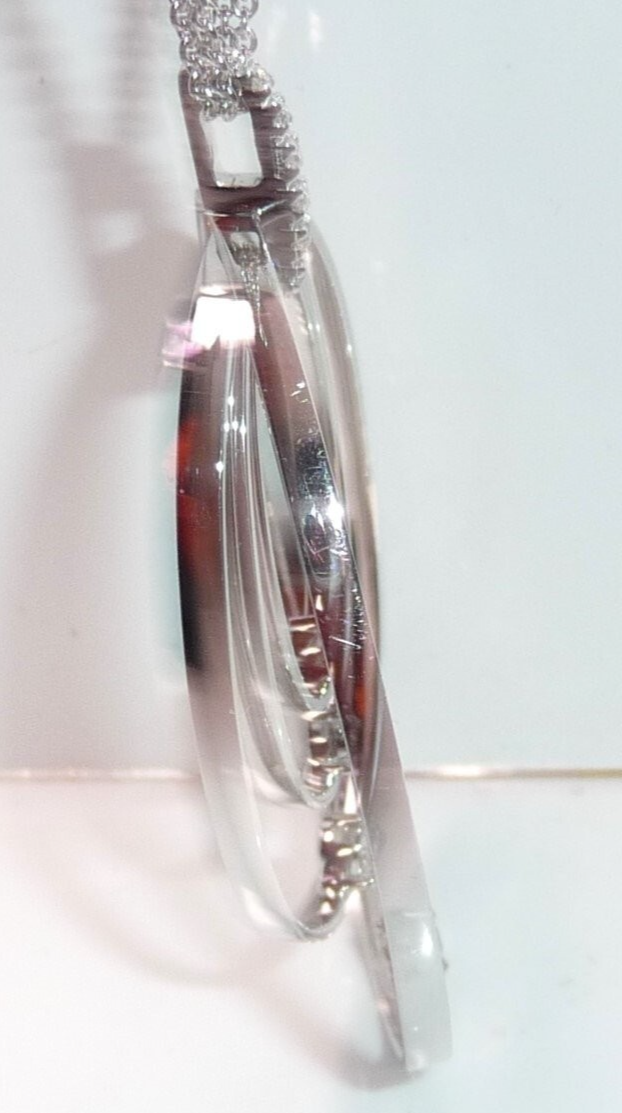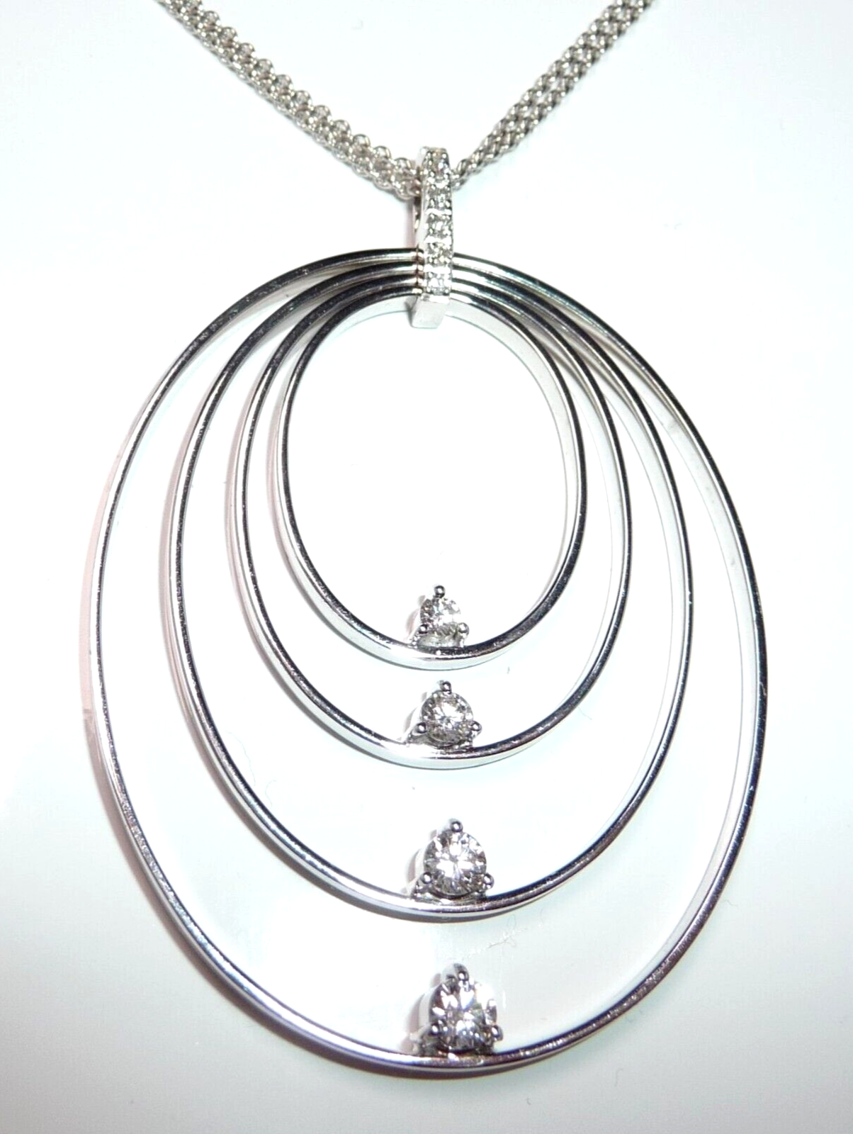 Kreativer Anhänger in 585 / 14 kt Weißgold. Der Anhänger hat eine italienische Eich-Punze aus Allessandria und eine Herstellermarke ("C") mit kleinem Diamanten darin. Das Design des Anhängers besteht aus 4 ovalen Spiralen, die nach innen kontinuierlich kleiner werden. Die 4 Ovale sind unabhängig voneinander beweglich und haben einen eingeschränkten Bewegungsradius nach vorne, hinten und zu beiden Seiten. Gehalten werden sie von einer länglichen Schlaufe, die mit Diamanten besetzt ist.