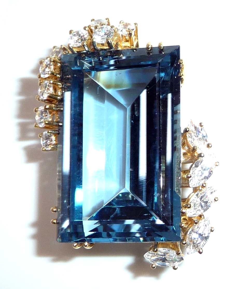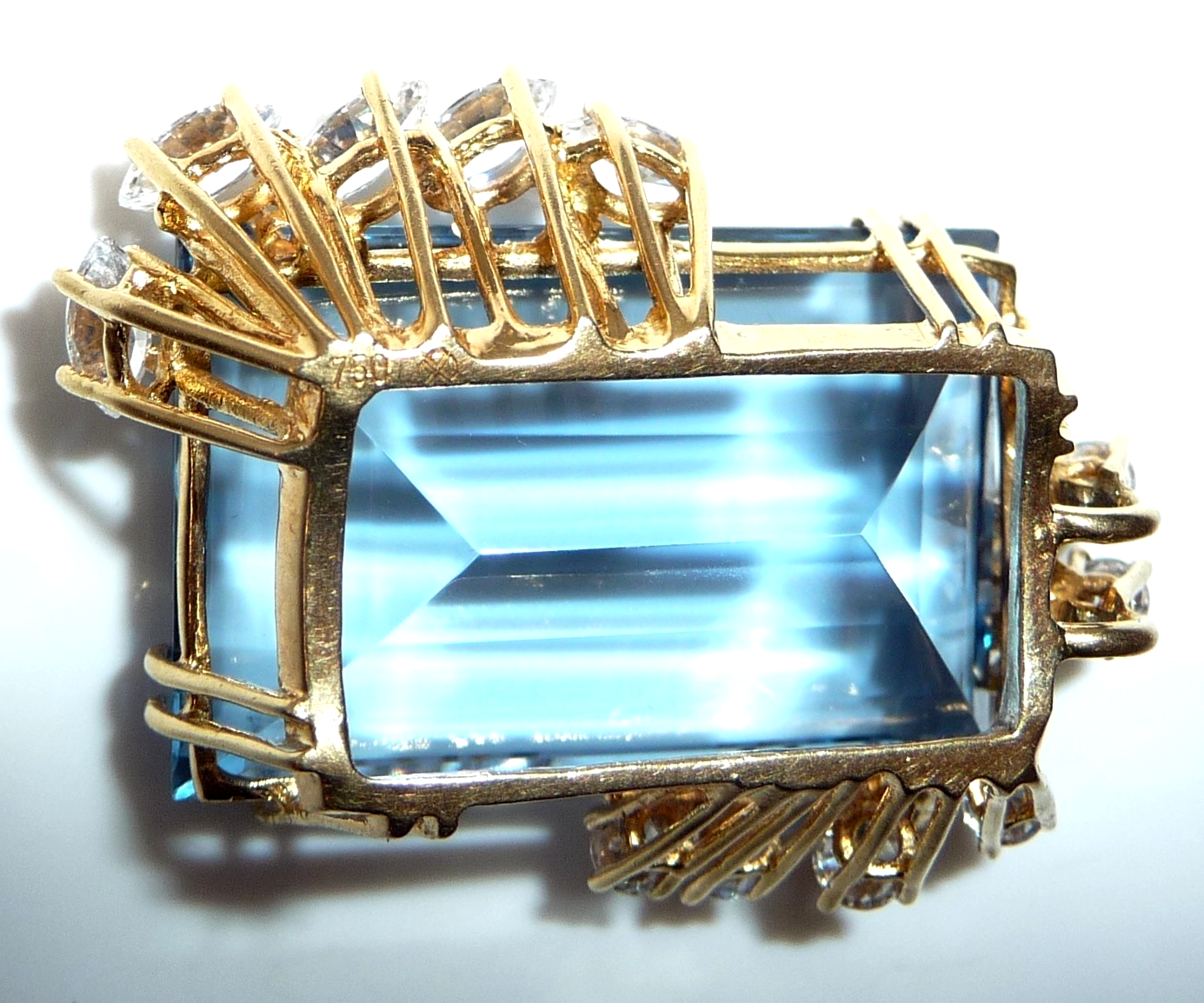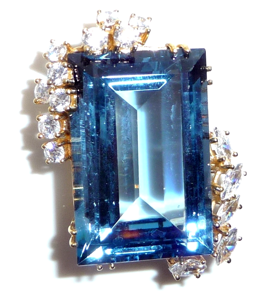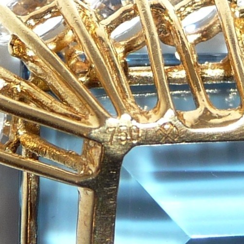 Der Schöne klare Blautopas ist im Treppenschliff facettiert und wird eingerahmt von brillant funkelnden weißen Steinen. Es handelt sich um Zirkonia im Brillantschliff und im Navette-Schliff von zusammen ca. 1,50 ct.