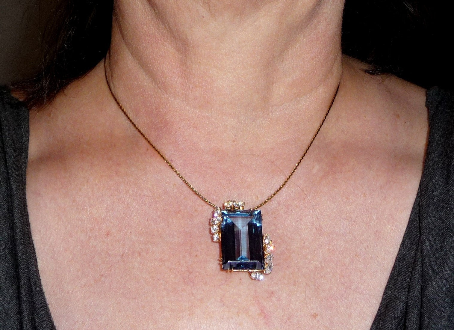 Kreativer Anhänger in 18 K / 750 Gelbgold. Der fantasievolle Anhänger hat einen außerordentlich großen Blautopas in der intensiven Farbe London Blue eingefasst. Der Blautopas hat die Maße 29 x 19 x 10,6 mm, was einem Karat-Gewicht von ca. 53,60 ct.