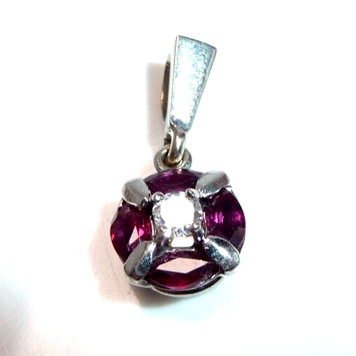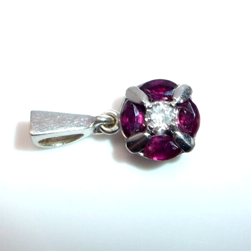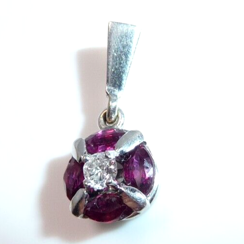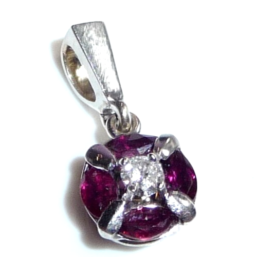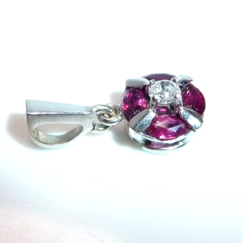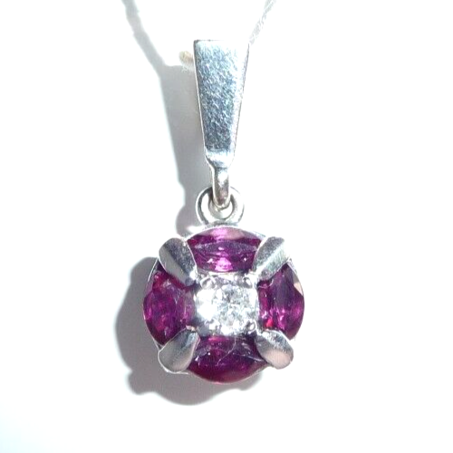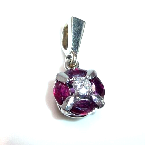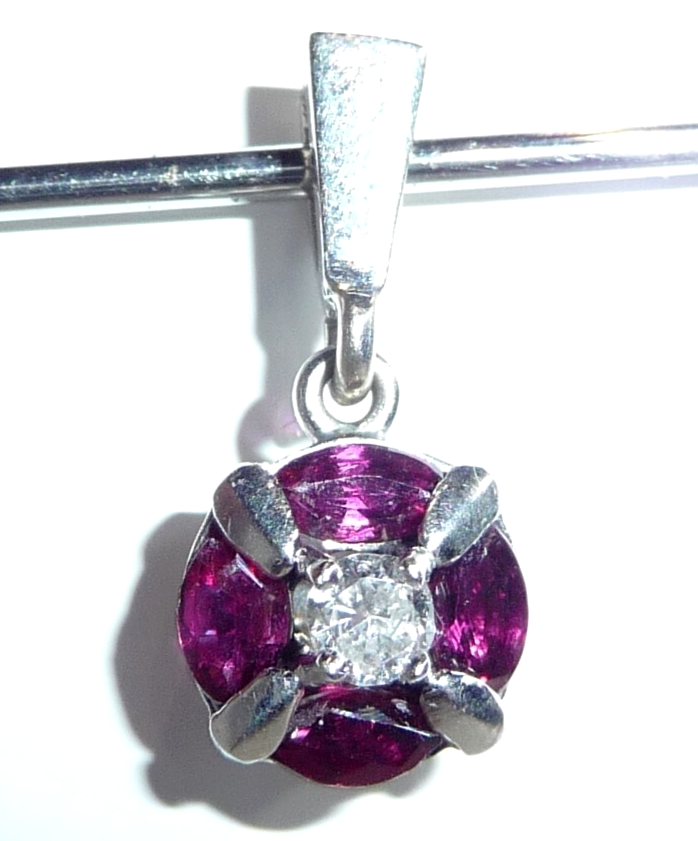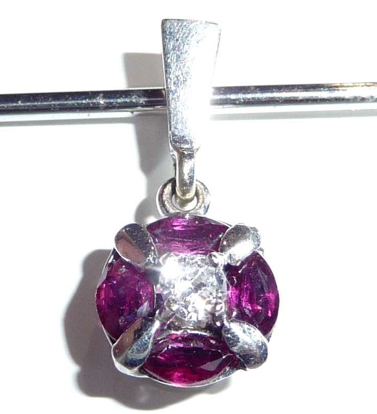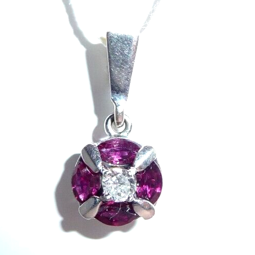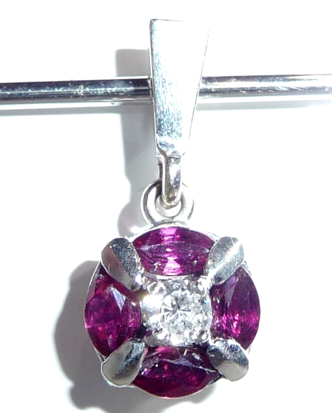 Anhänger in 750 / 18 K Weißgold. Der Anhänger hat eine runde Form. Im Zentrum ist ein Diamant im Brillantschliff von 0.08ct. (H/SI) mit einem Durchmesser von 2,85 mm. Der zentrale Diamant wird umrundet von 4 blutroten Rubinen, die im Navette-Schliff geschliffen sind. Durch die geschickte Einfassung legen sie sich wie ein Kreis um den Diamanten in der Mitte. Das ist eine sehr interessante Einfassung und dadurch ein originelles Design.