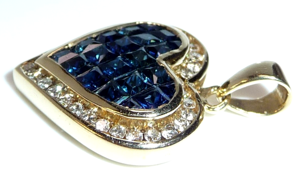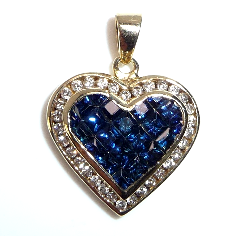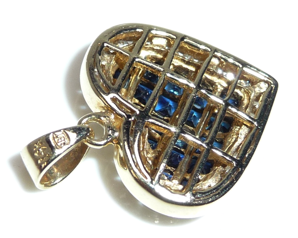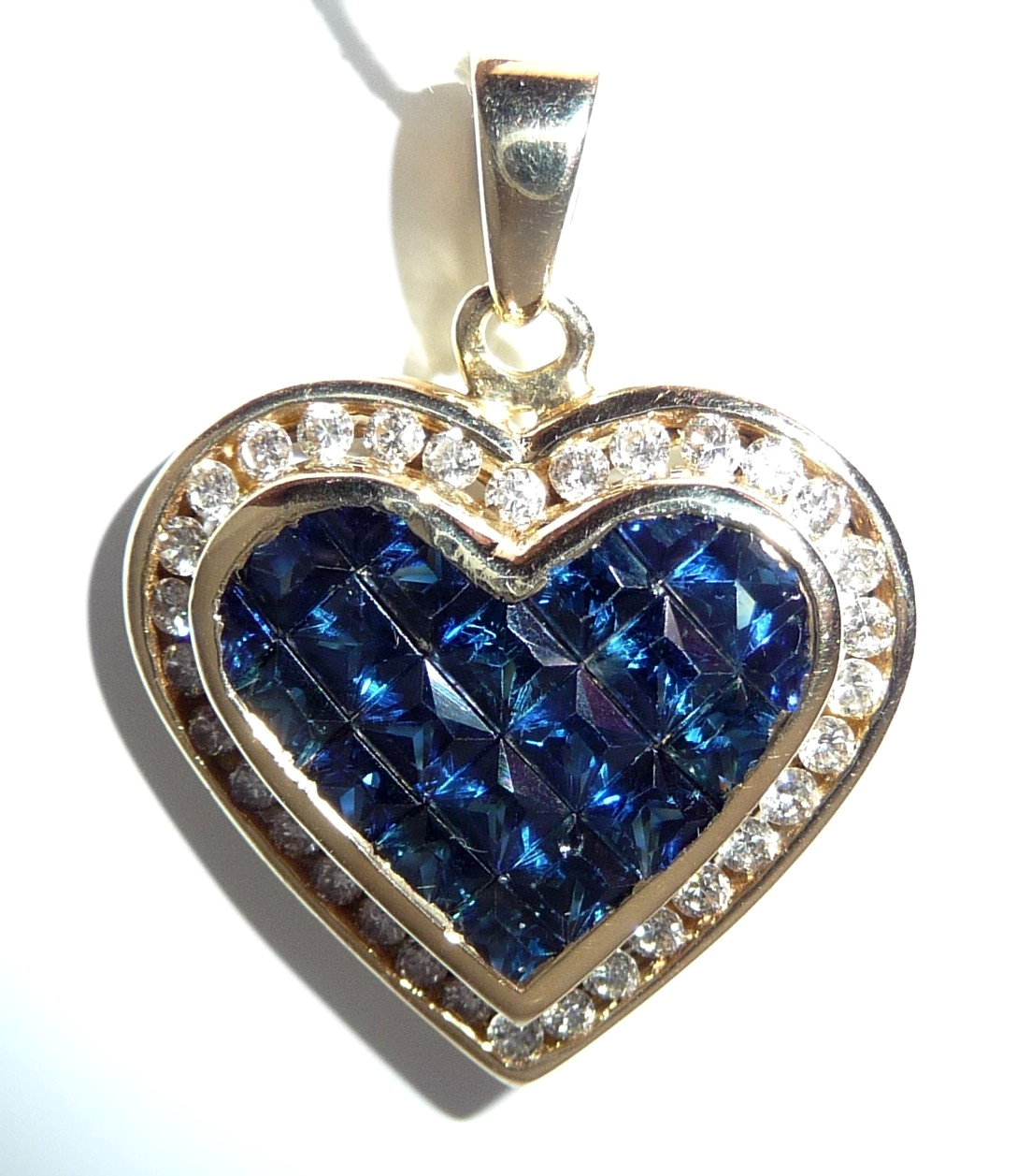 Anhänger in 14 K / 585 Gelbgold. Der Anhänger hat eine romantische Herz-Form. Das Herz ist sehr kontrastreich gestaltet durch die Verwendung der dunkelblauen Saphire im Kontrast zu den hell funkelnden Diamanten im Außenkreis.