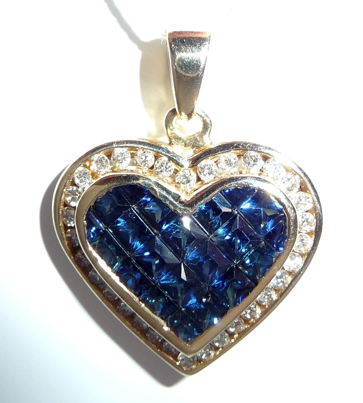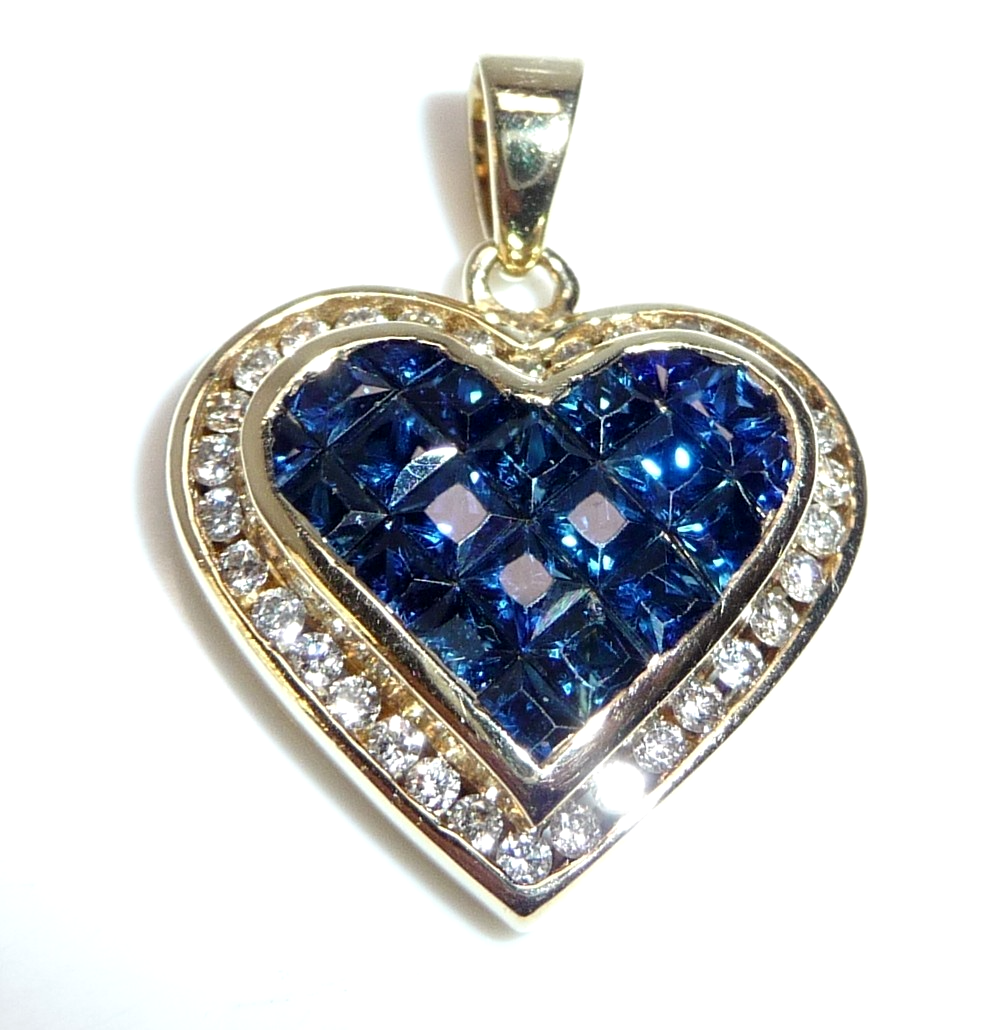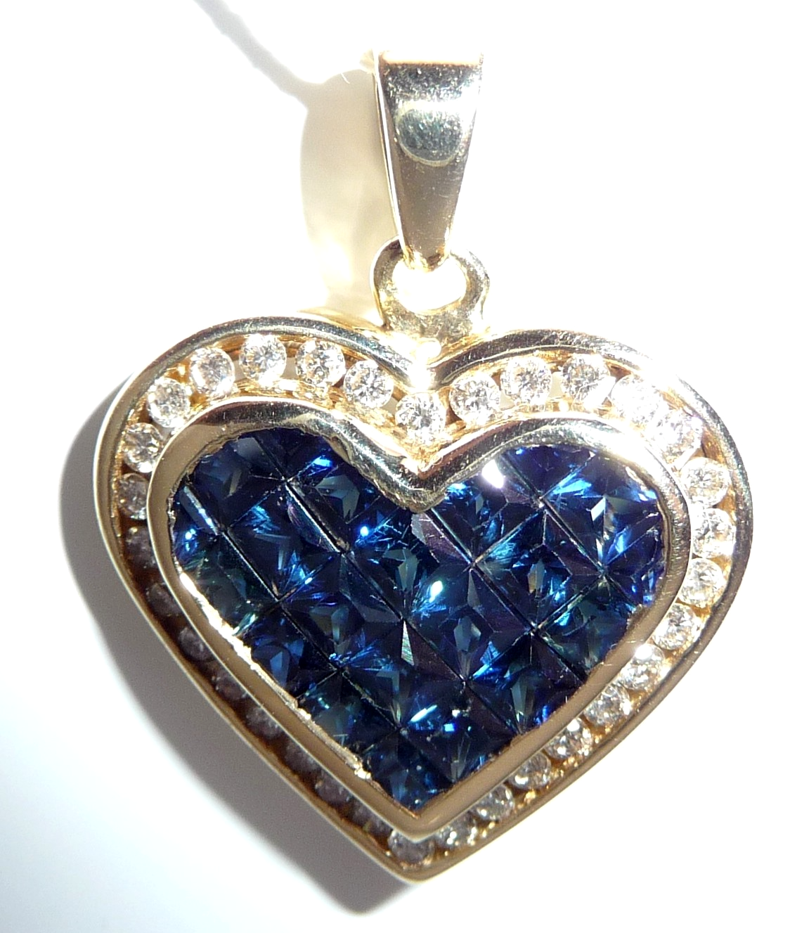 Anhänger in 14 K / 585 Gelbgold. Der Anhänger hat eine romantische Herz-Form. Das Herz ist sehr kontrastreich gestaltet durch die Verwendung der dunkelblauen Saphire im Kontrast zu den hell funkelnden Diamanten im Außenkreis.