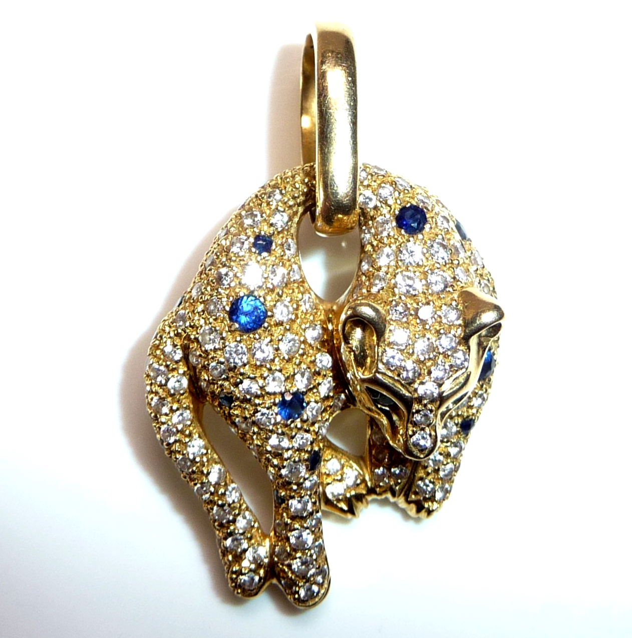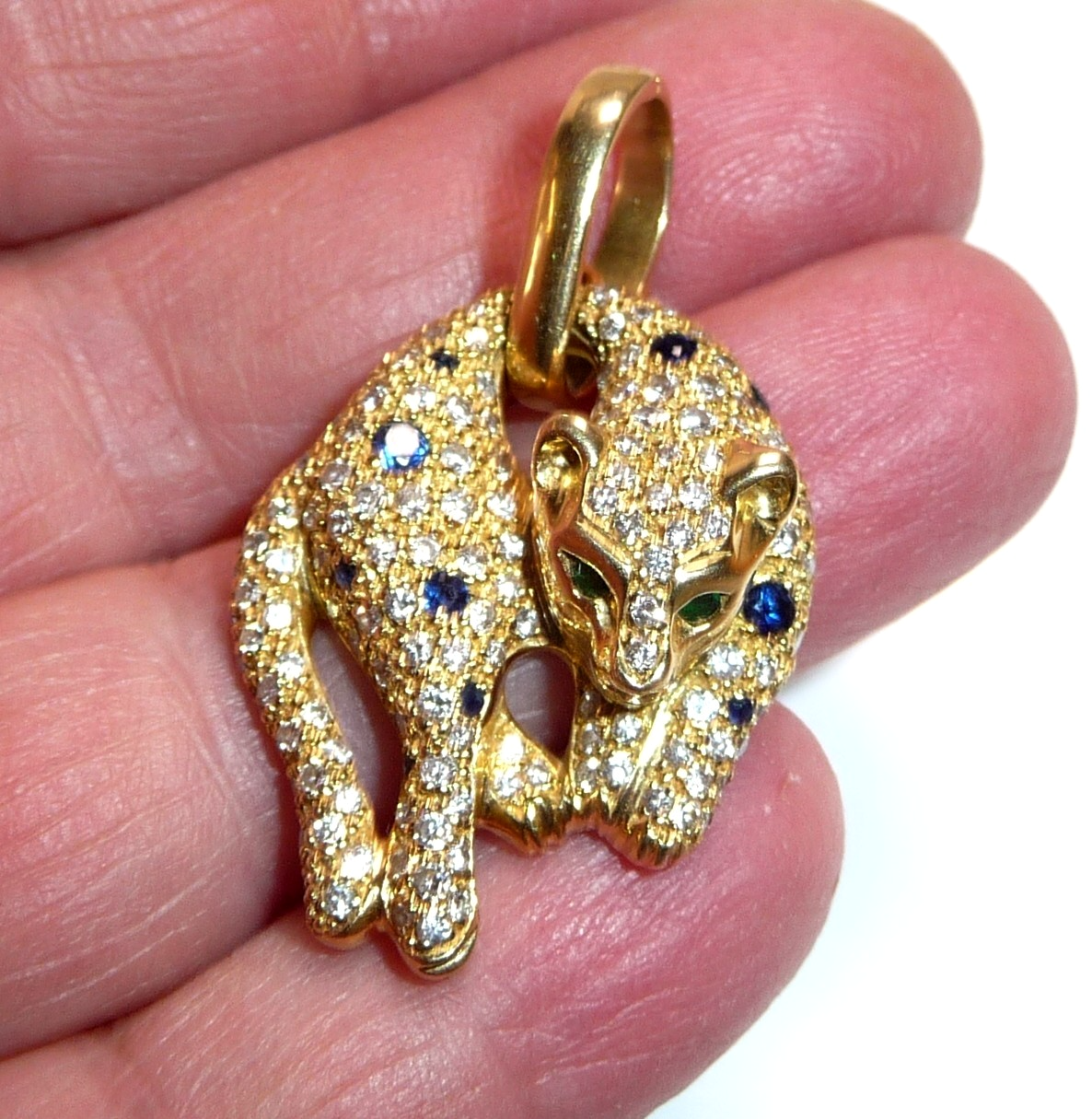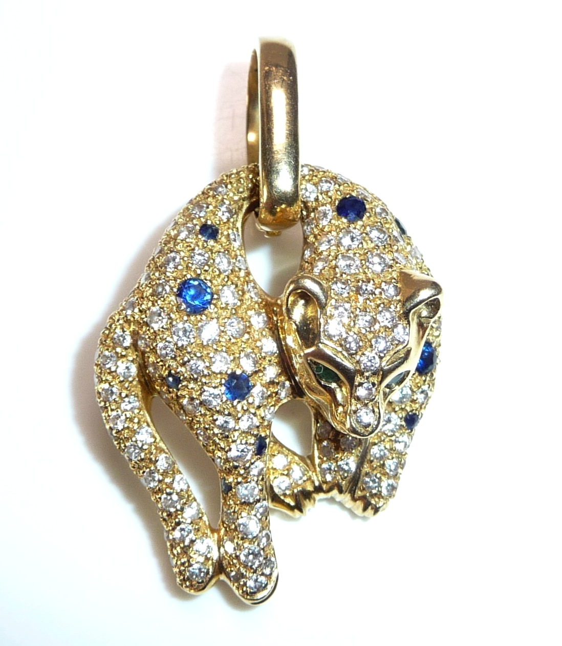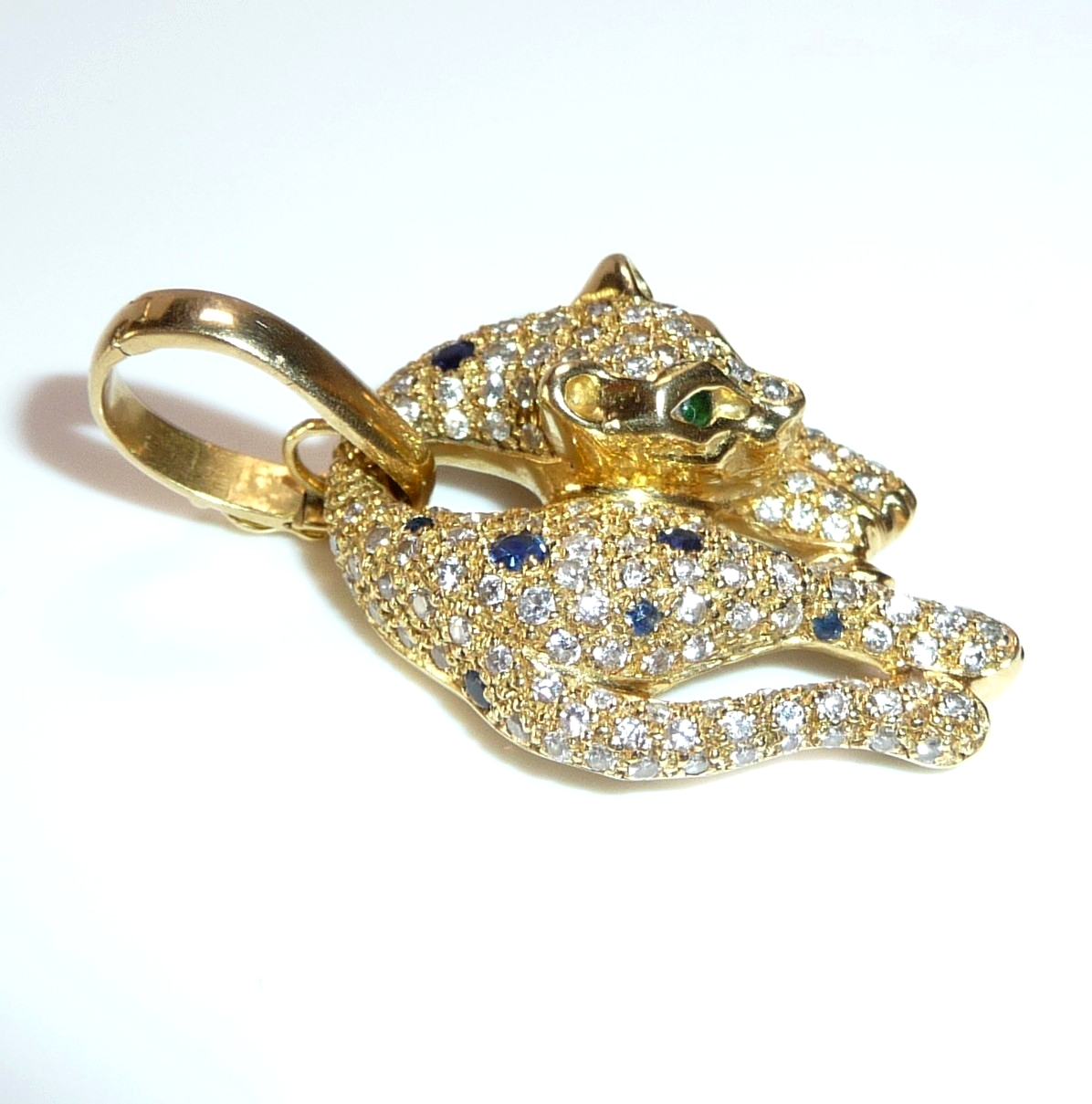 Anhänger in 750 / 18 K Gelbgold. Der extravagante Anhänger stellt eine Katze oder einen Panther dar. Die komplette Oberfläche ist mit insgesamt 160 Diamanten im Brillantschliff von total 1.80 ct. (F/VVS) ausgefüllt, so dass der ganze Körper bei jeder Bewegung funkelt. Zwischen die Diamanten mischen sich insgesamt 11 Saphire von total ca. 0.20 ct.. Zwei Smaragde bilden die Augen.