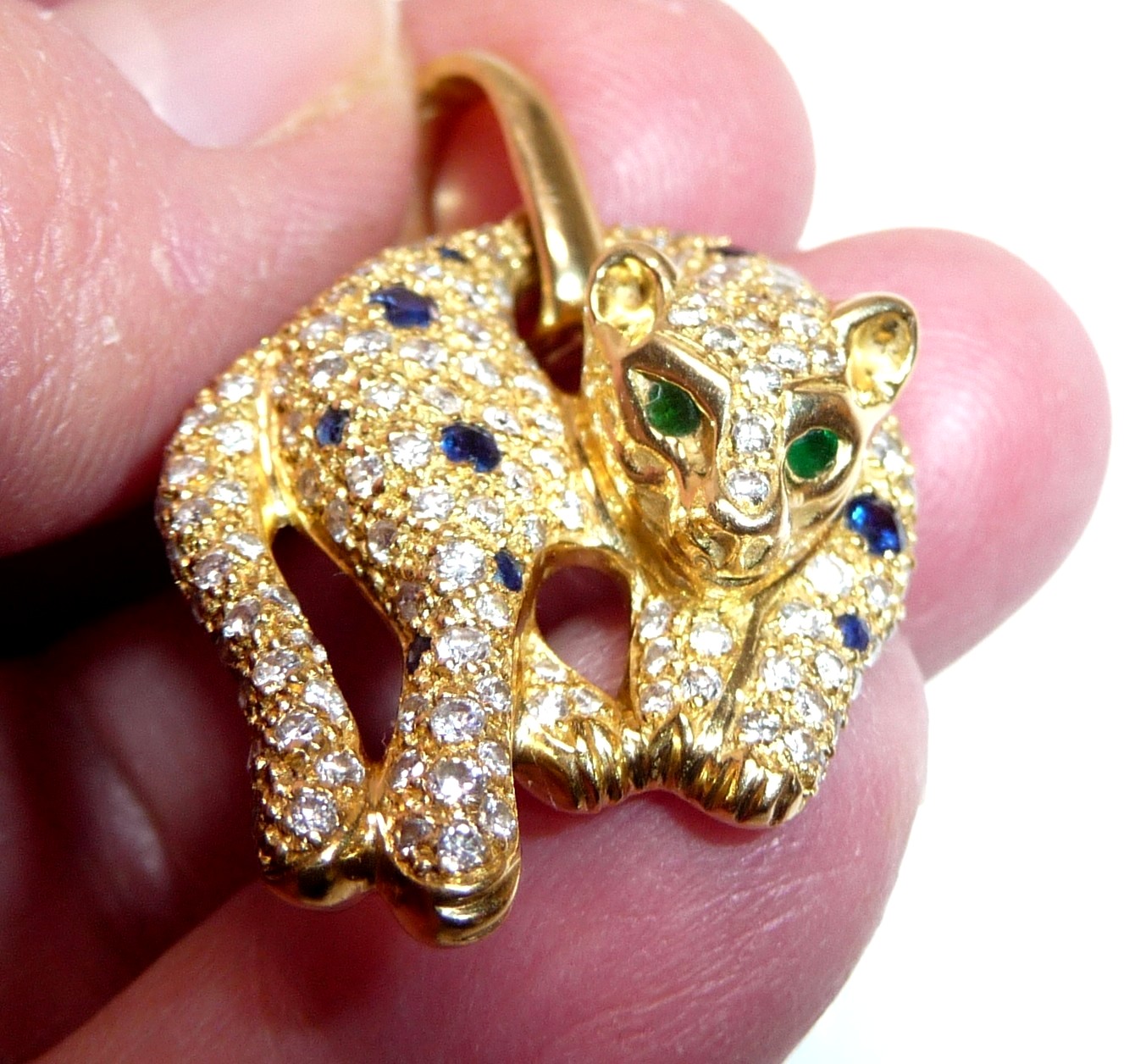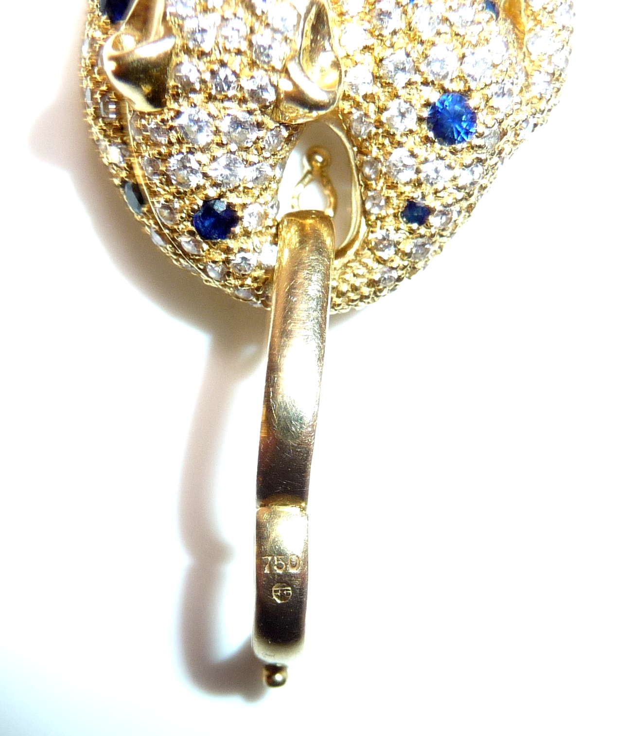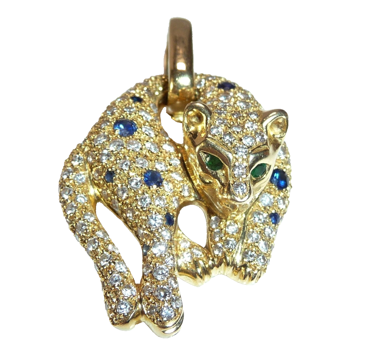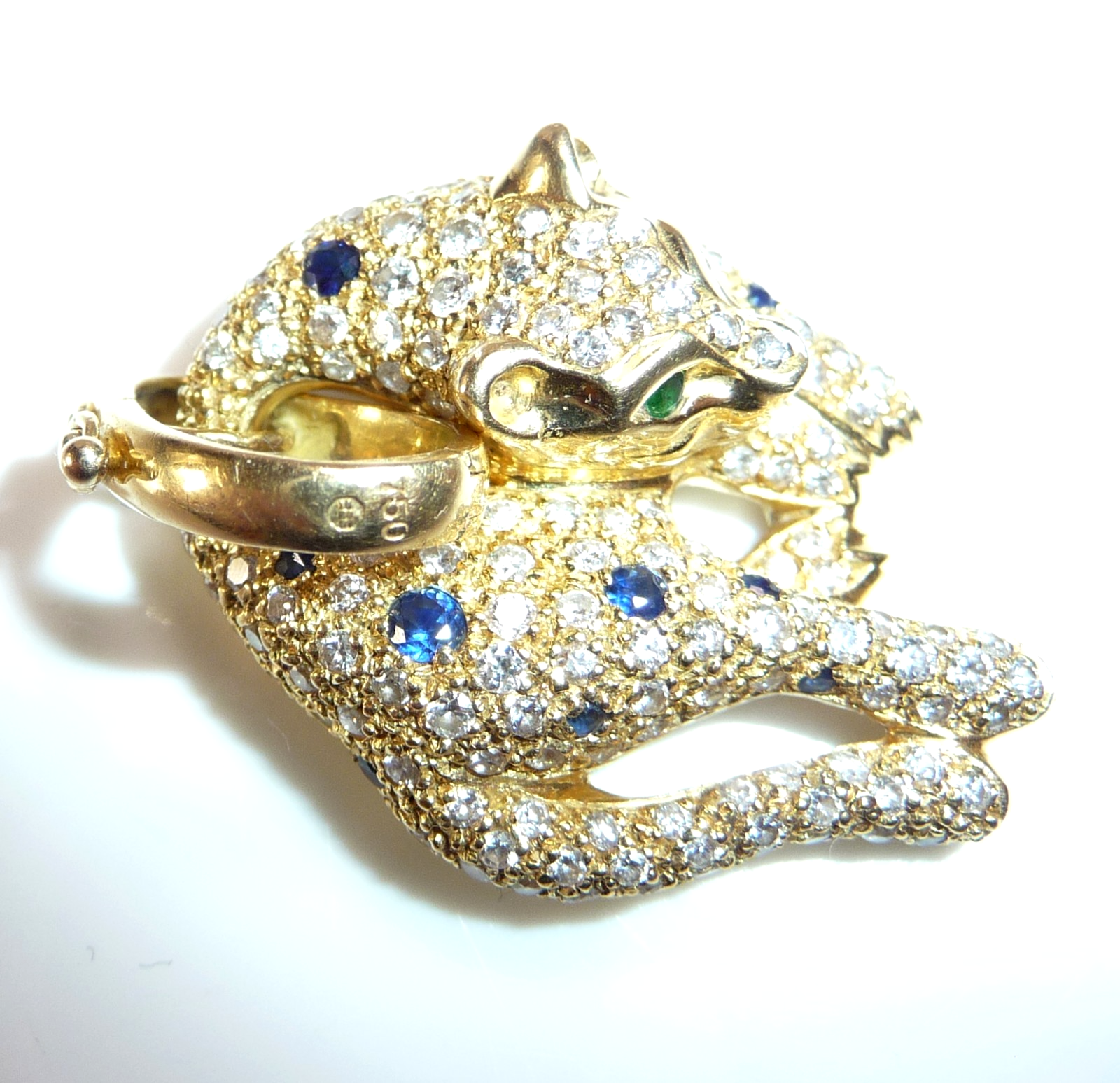 Anhänger in 750 / 18 K Gelbgold. Der extravagante Anhänger stellt eine Katze oder einen Panther dar. Die komplette Oberfläche ist mit insgesamt 160 Diamanten im Brillantschliff von total 1.80 ct. (F/VVS) ausgefüllt, so dass der ganze Körper bei jeder Bewegung funkelt. Zwischen die Diamanten mischen sich insgesamt 11 Saphire von total ca. 0.20 ct.. Zwei Smaragde bilden die Augen.