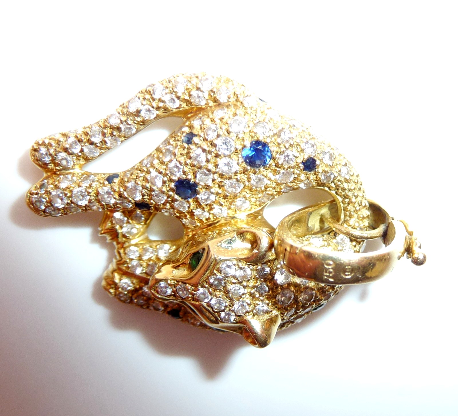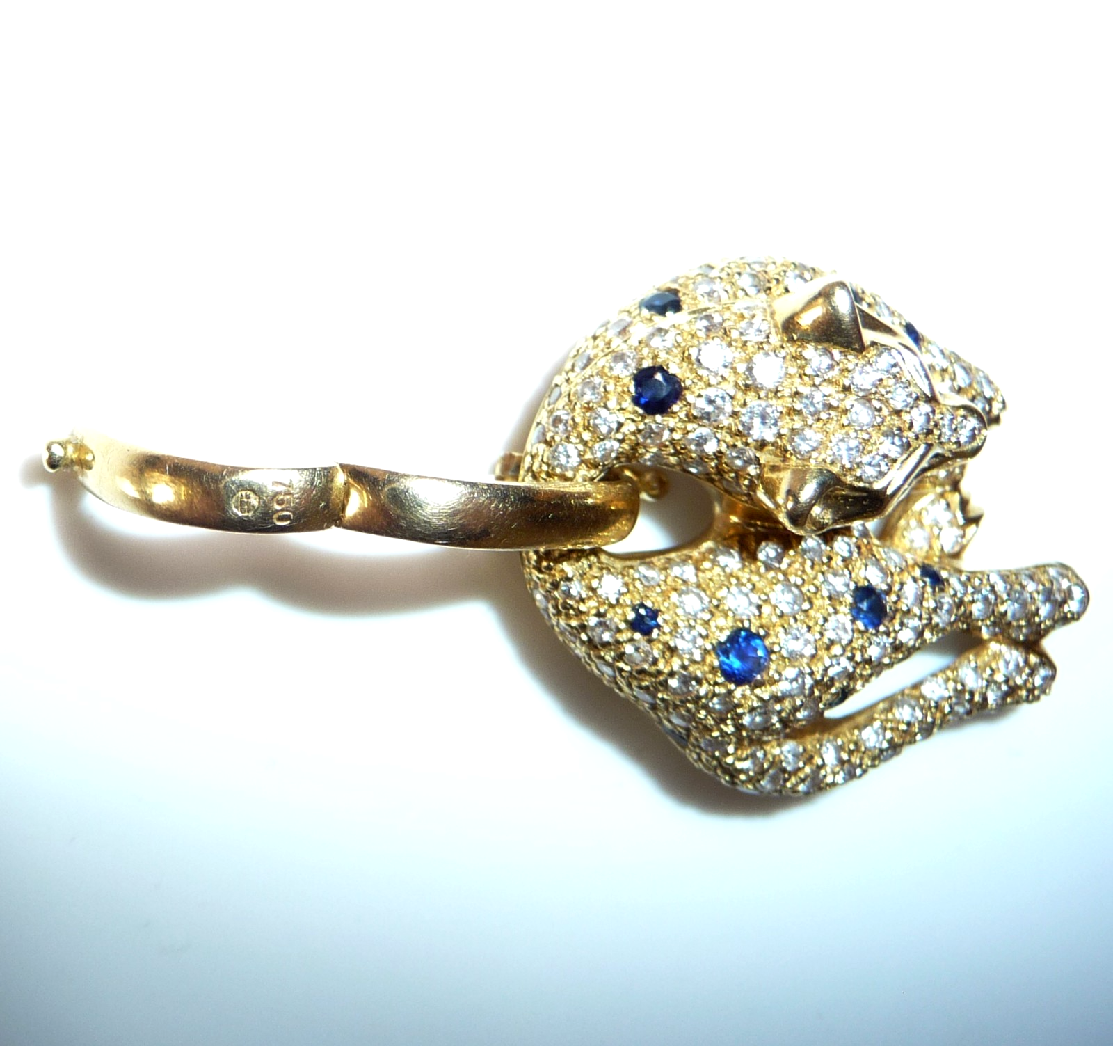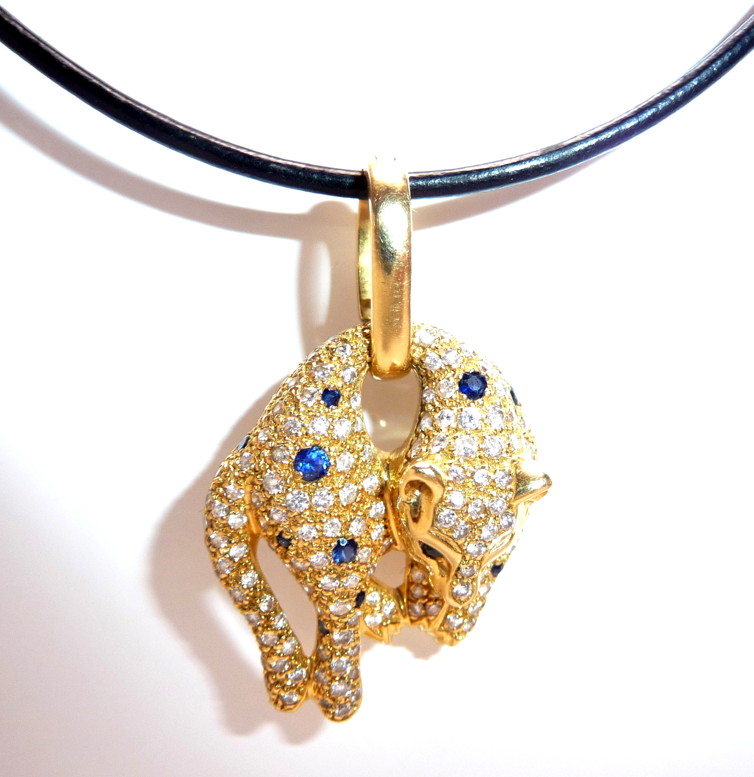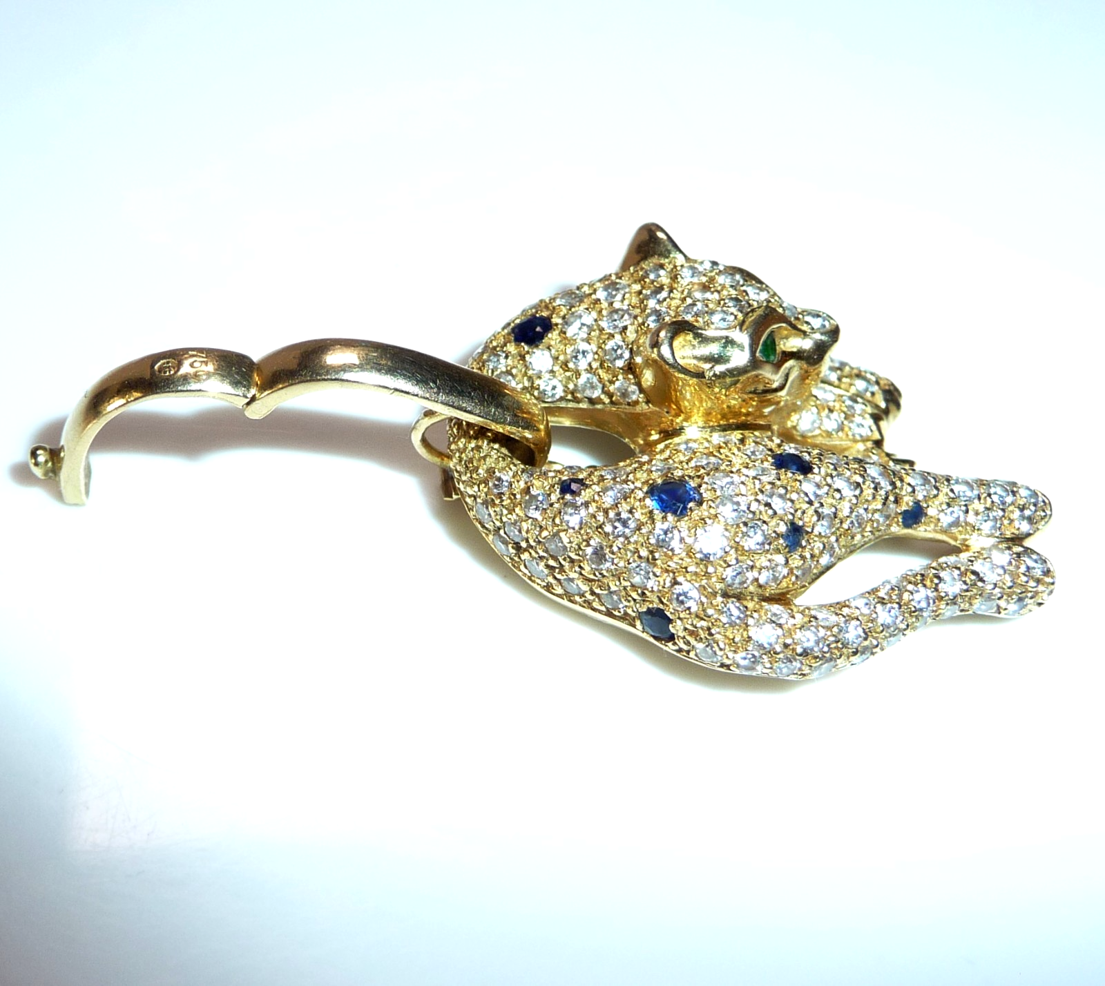 Anhänger in 750 / 18 K Gelbgold. Der extravagante Anhänger stellt eine Katze oder einen Panther dar. Die komplette Oberfläche ist mit insgesamt 160 Diamanten im Brillantschliff von total 1.80 ct. (F/VVS) ausgefüllt, so dass der ganze Körper bei jeder Bewegung funkelt. Zwischen die Diamanten mischen sich insgesamt 11 Saphire von total ca. 0.20 ct.. Zwei Smaragde bilden die Augen.