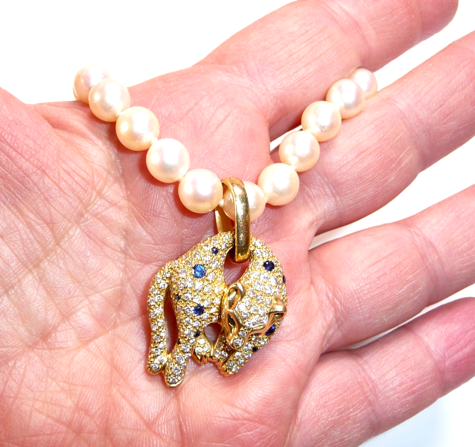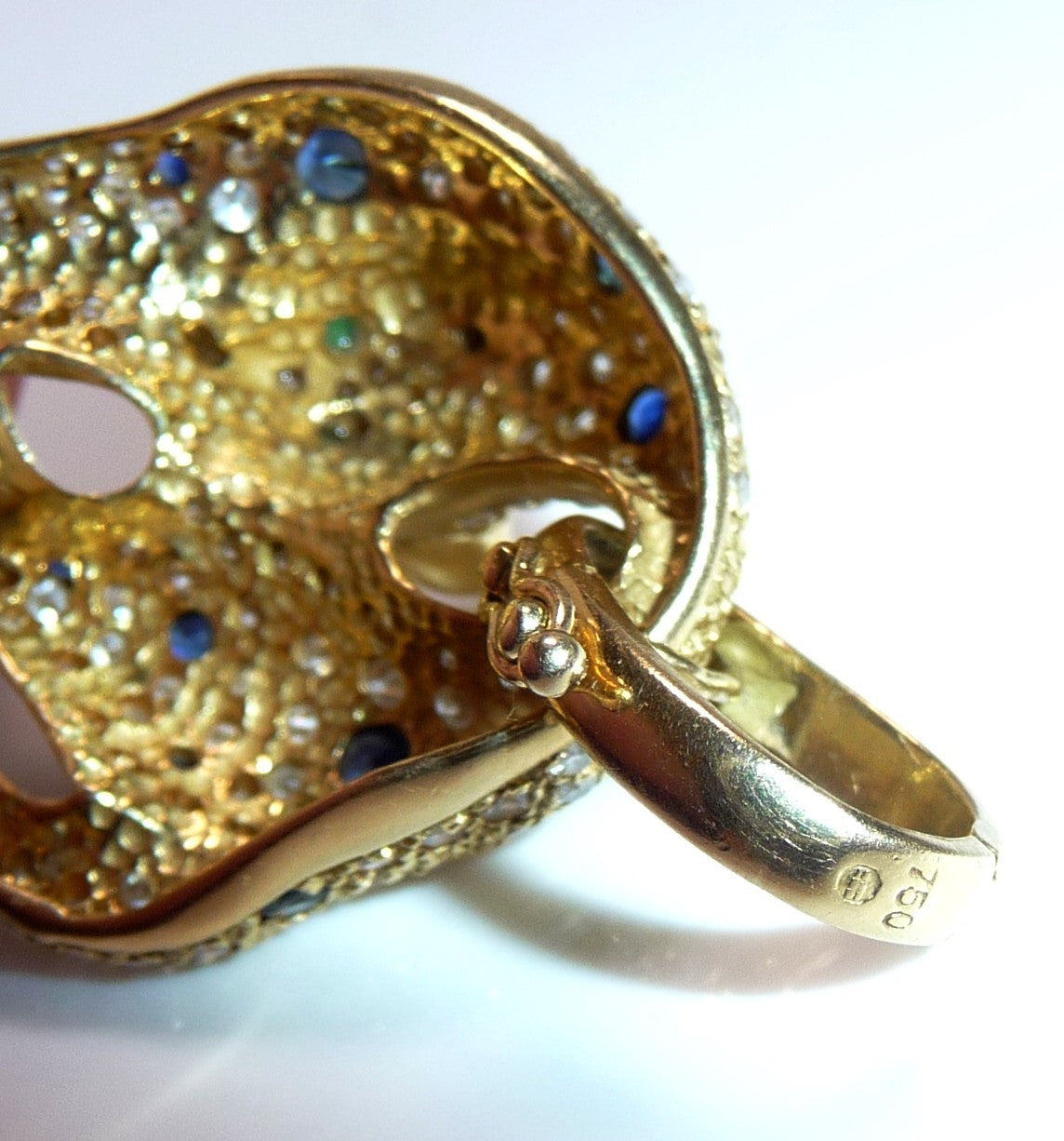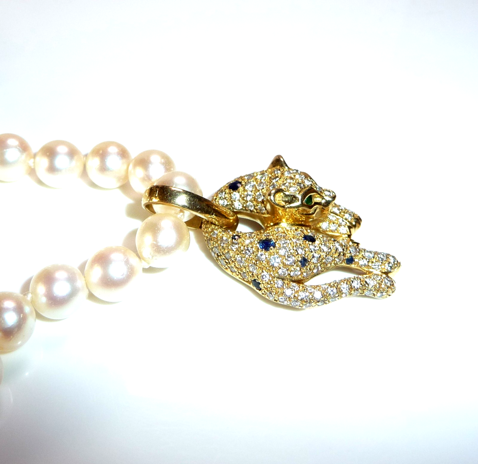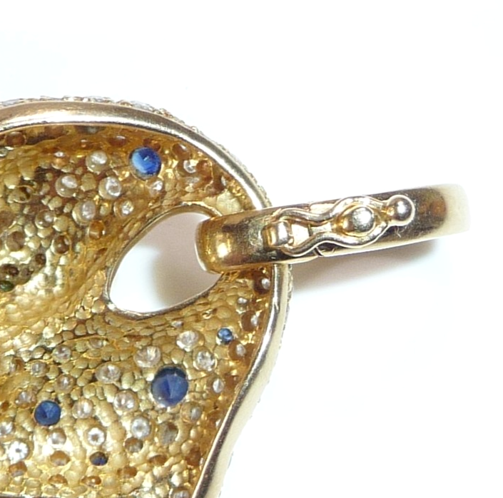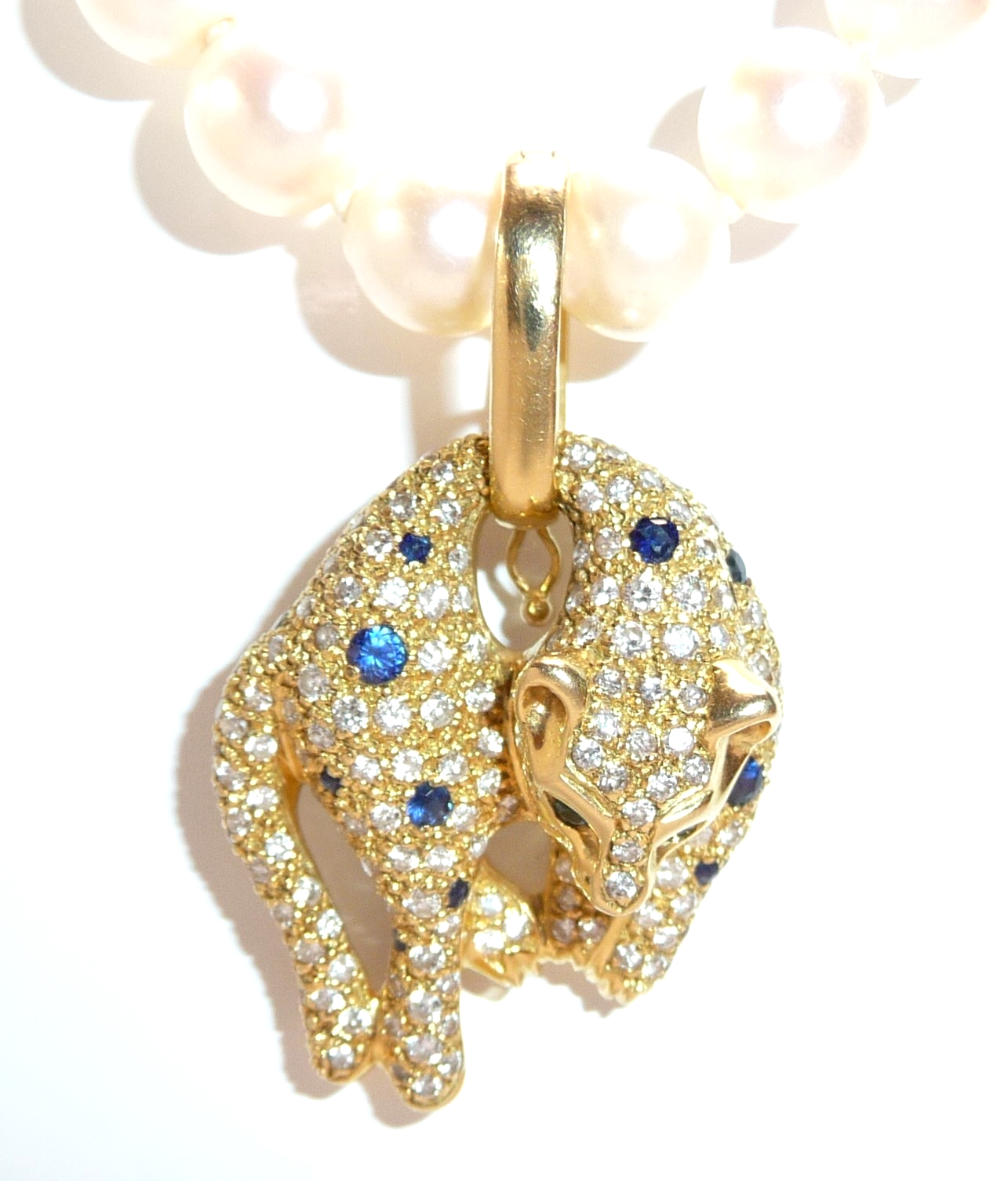 Anhänger in 750 / 18 K Gelbgold. Der extravagante Anhänger stellt eine Katze oder einen Panther dar. Die komplette Oberfläche ist mit insgesamt 160 Diamanten im Brillantschliff von total 1.80 ct. (F/VVS) ausgefüllt, so dass der ganze Körper bei jeder Bewegung funkelt. Zwischen die Diamanten mischen sich insgesamt 11 Saphire von total ca. 0.20 ct.. Zwei Smaragde bilden die Augen.