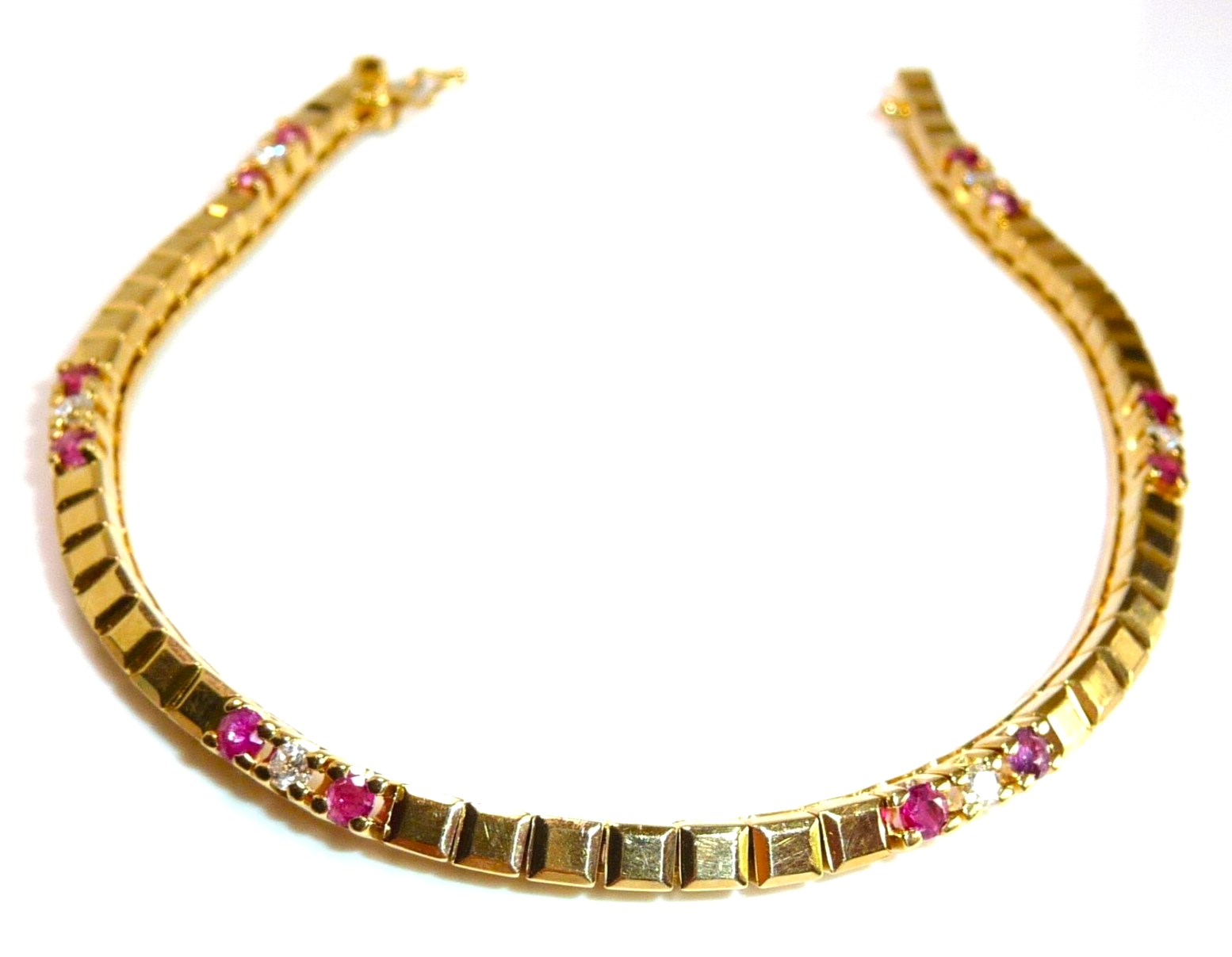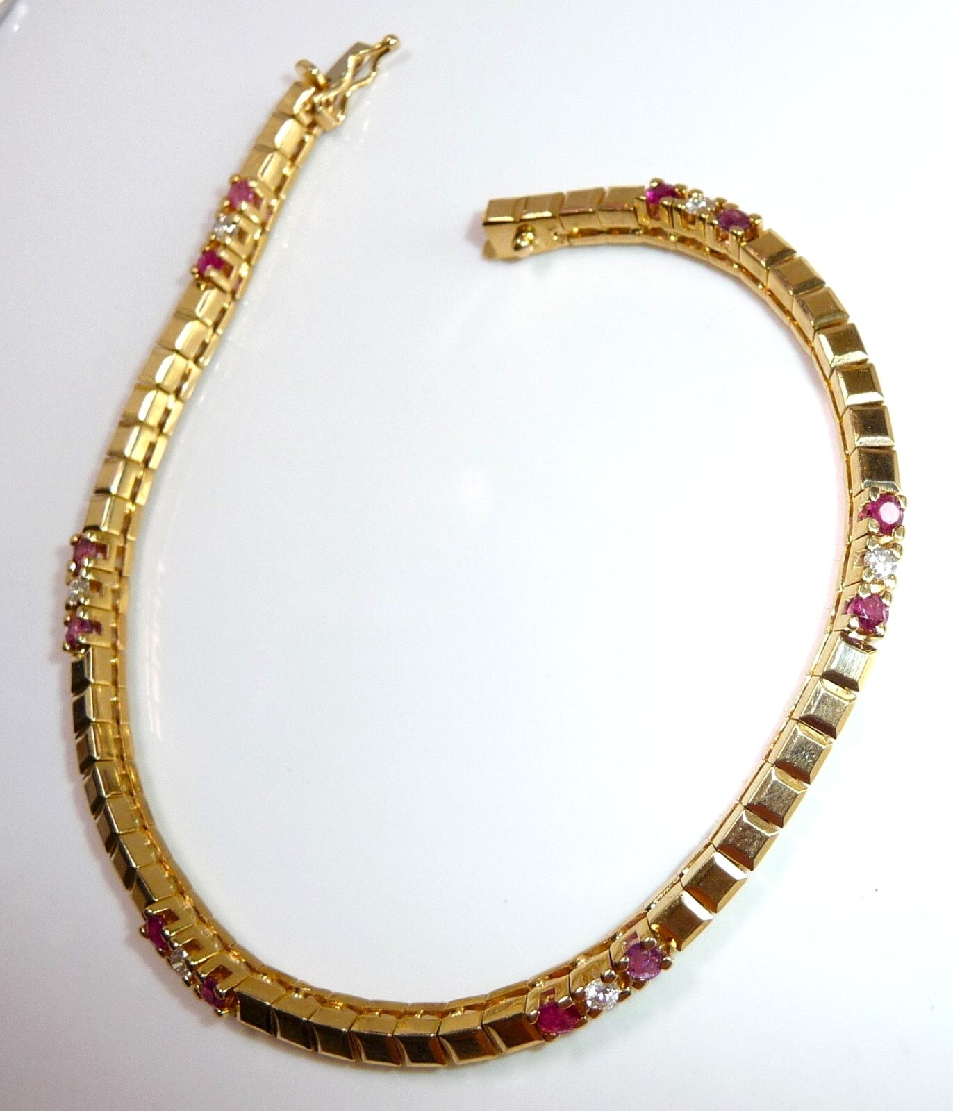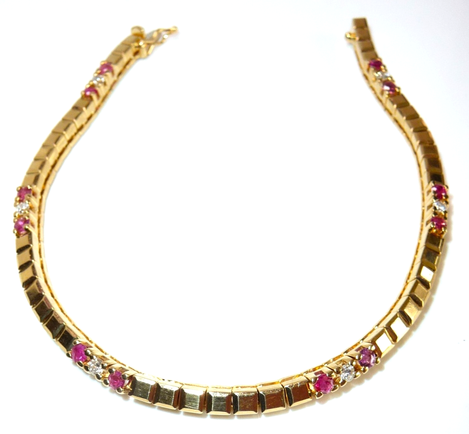 Armband in 585 / 14 K Gelbgold. Das Armband hat 60 kleine quadratische Glieder, die sich sehr präzise aneinander reihen und eine feine Beweglichkeit haben. Etwa alle 7 Glieder sind drei Glieder eingefügt, die mit Edelsteinen besetzt sind. Insgesamt sind 12 runde Rubine von total 1.20 ct. eingefasst. Ferner sind 6 Diamanten im Brillantschliff von total 0.30 ct. (G-F/SI-SI2) eingefasst.