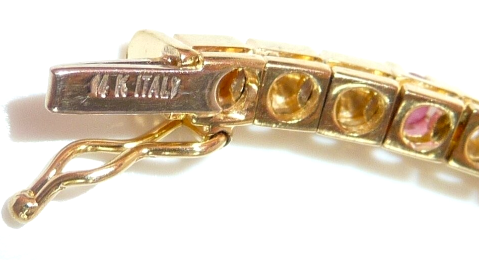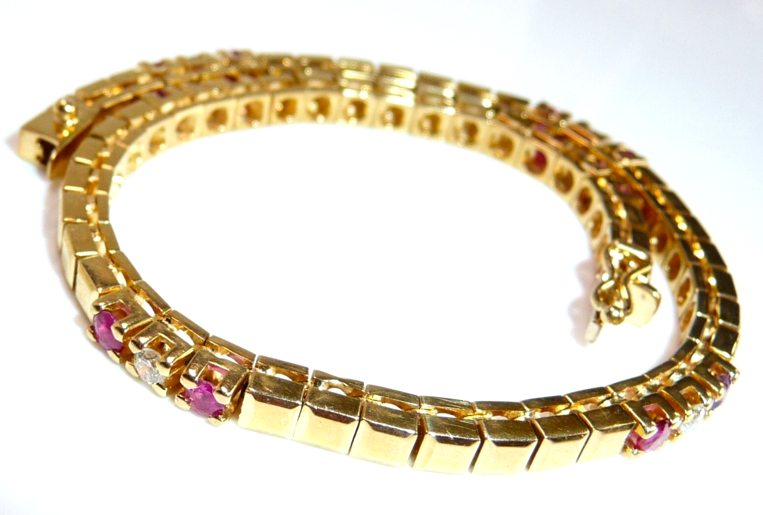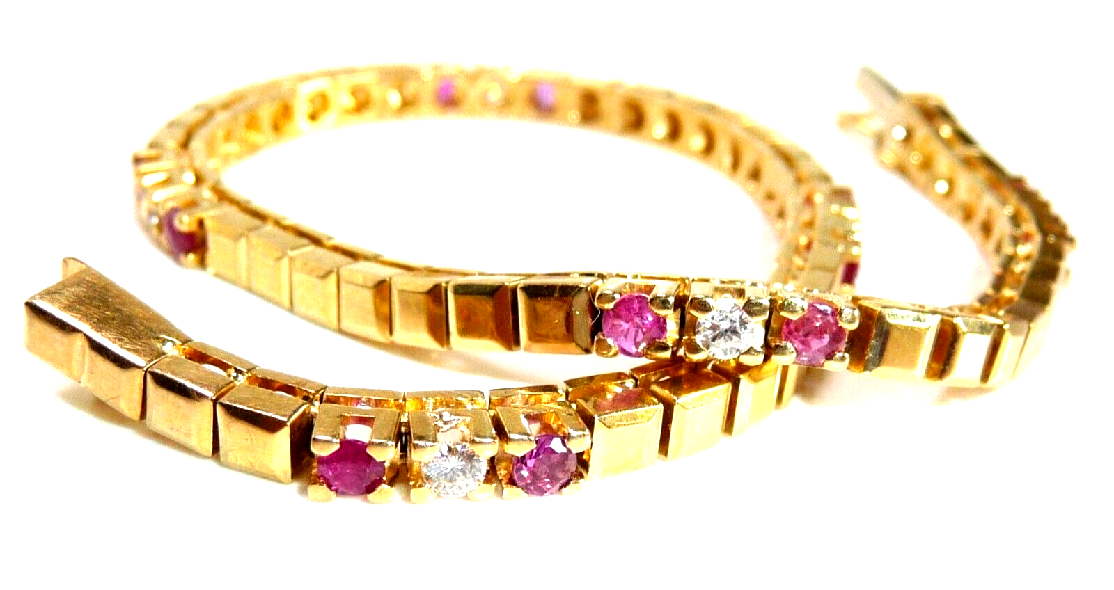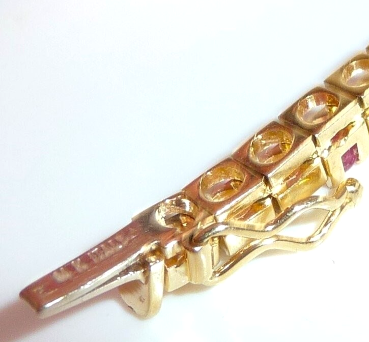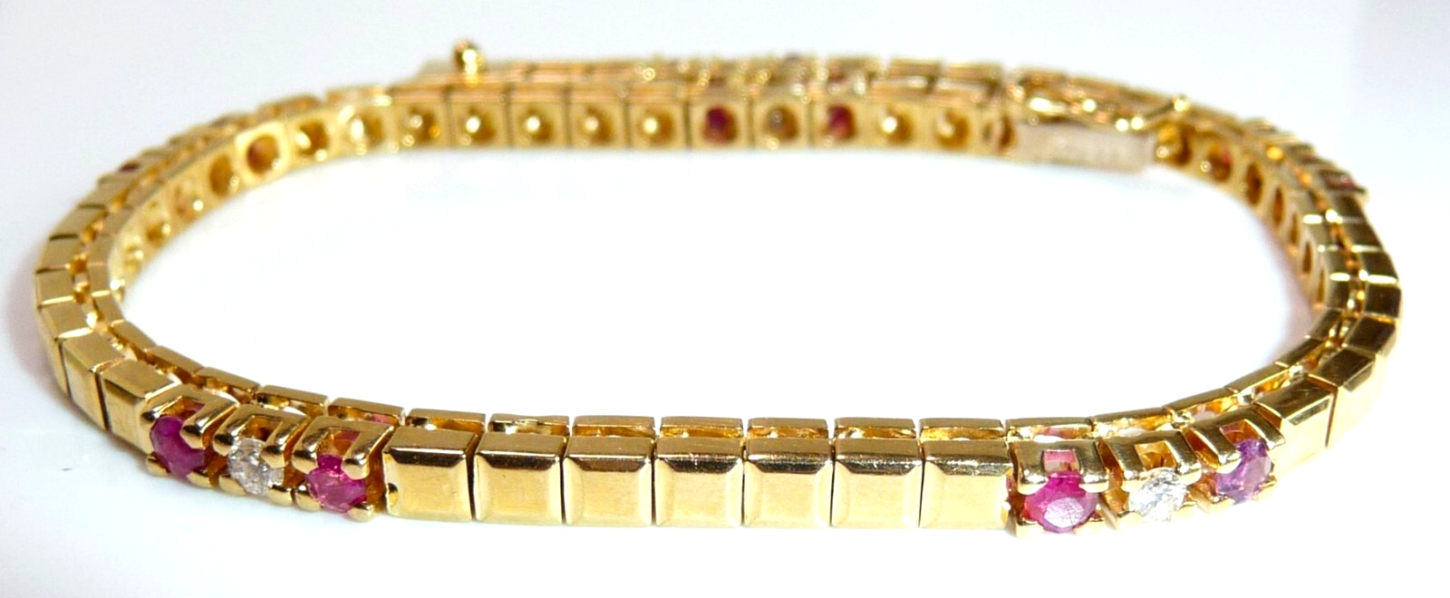 Armband in 585 / 14 K Gelbgold. Das Armband hat 60 kleine quadratische Glieder, die sich sehr präzise aneinander reihen und eine feine Beweglichkeit haben. Etwa alle 7 Glieder sind drei Glieder eingefügt, die mit Edelsteinen besetzt sind. Insgesamt sind 12 runde Rubine von total 1.20 ct. eingefasst. Ferner sind 6 Diamanten im Brillantschliff von total 0.30 ct. (G-F/SI-SI2) eingefasst.