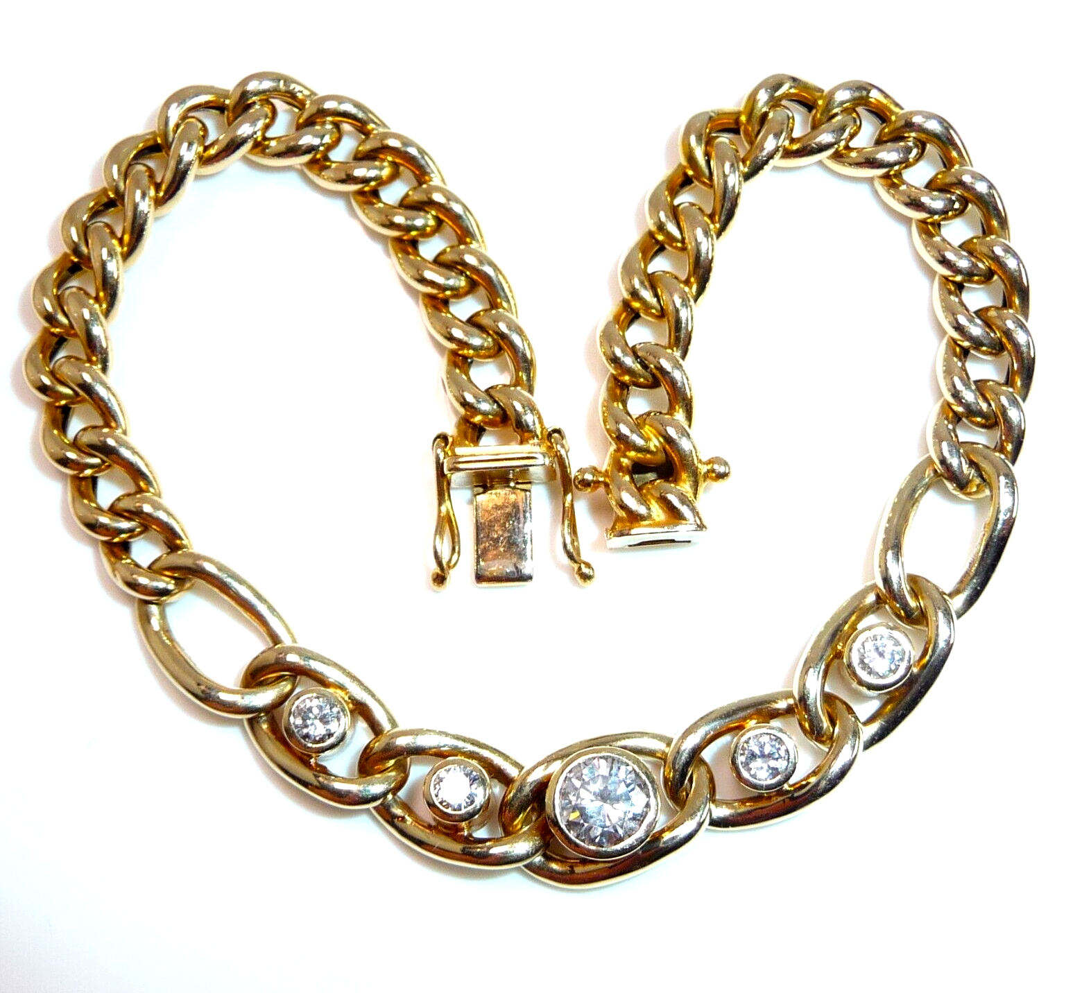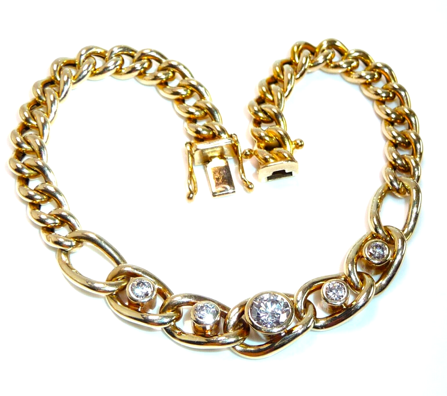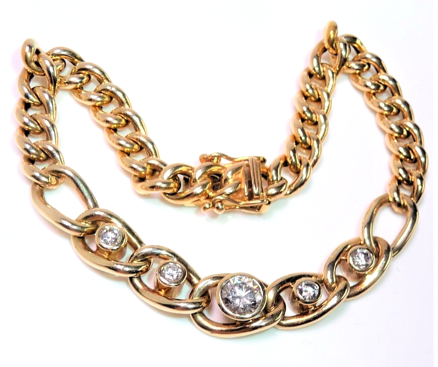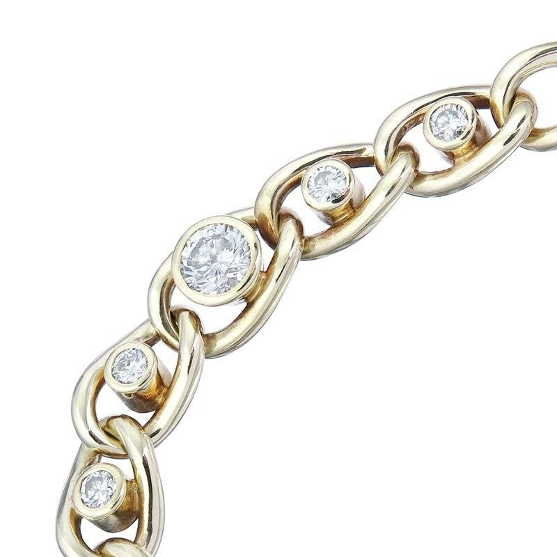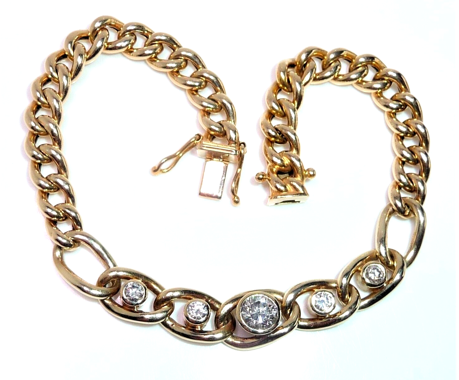 Elegantes Armband in 585 / 14 K Gelbgold. Das Armband hat ein Panzerketten-Muster, das sich zur Mitte hin verbreitert. Eingefügt sind 5 Diamanten im Brillantschliff von total ca. 0.95 ct. Die Diamanten sind in einer Zargenfassung eingefasst.