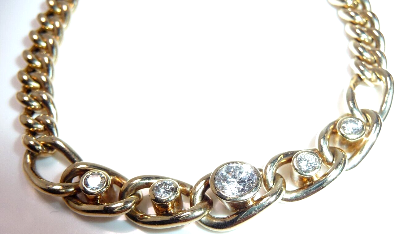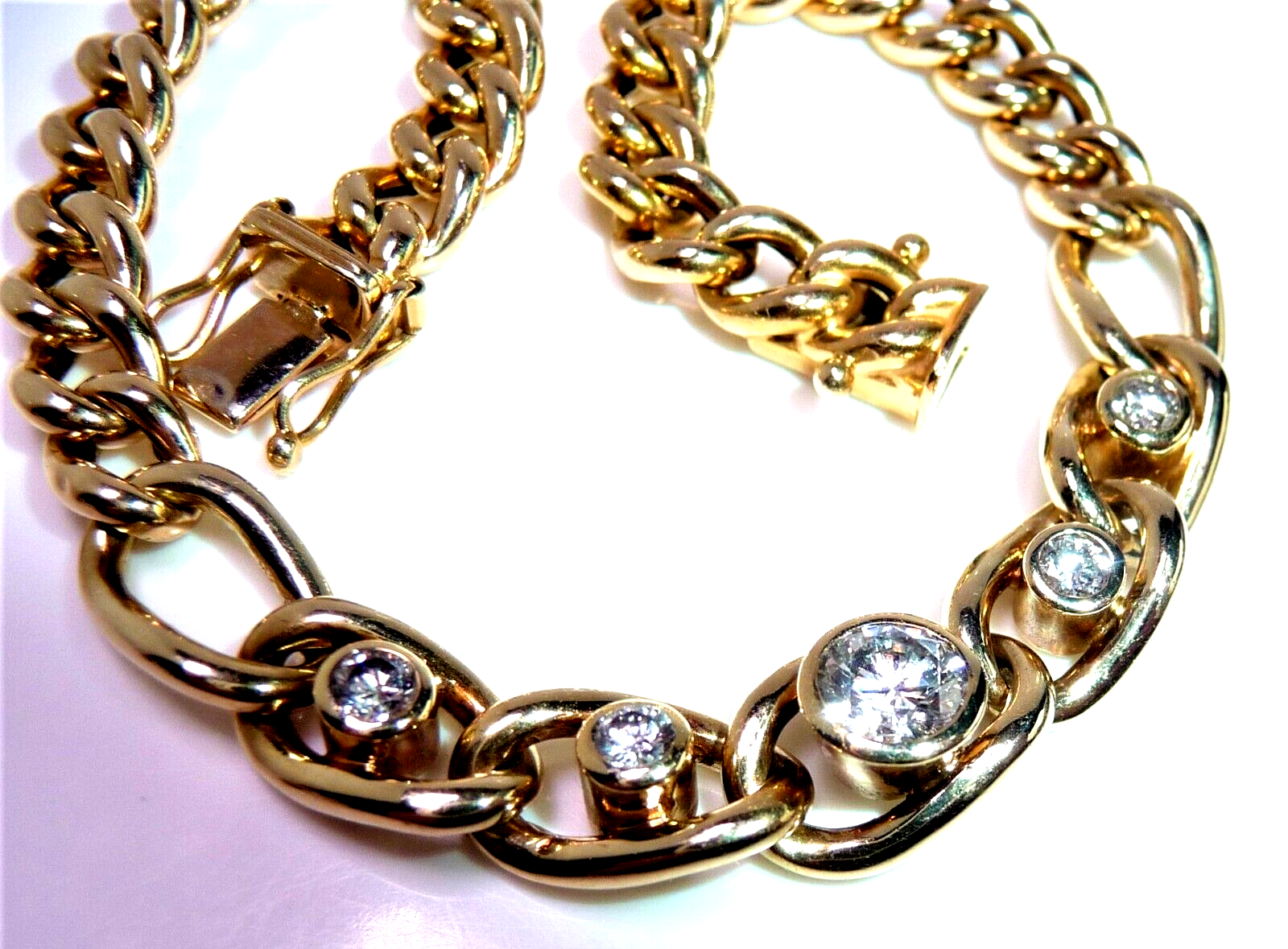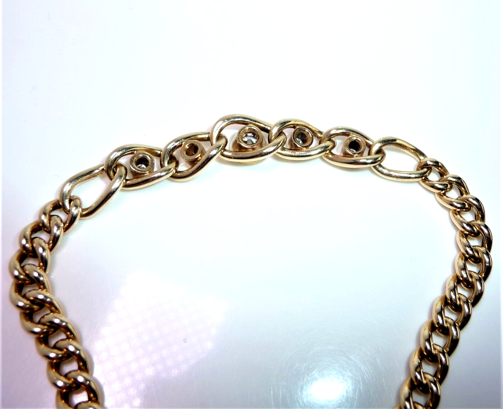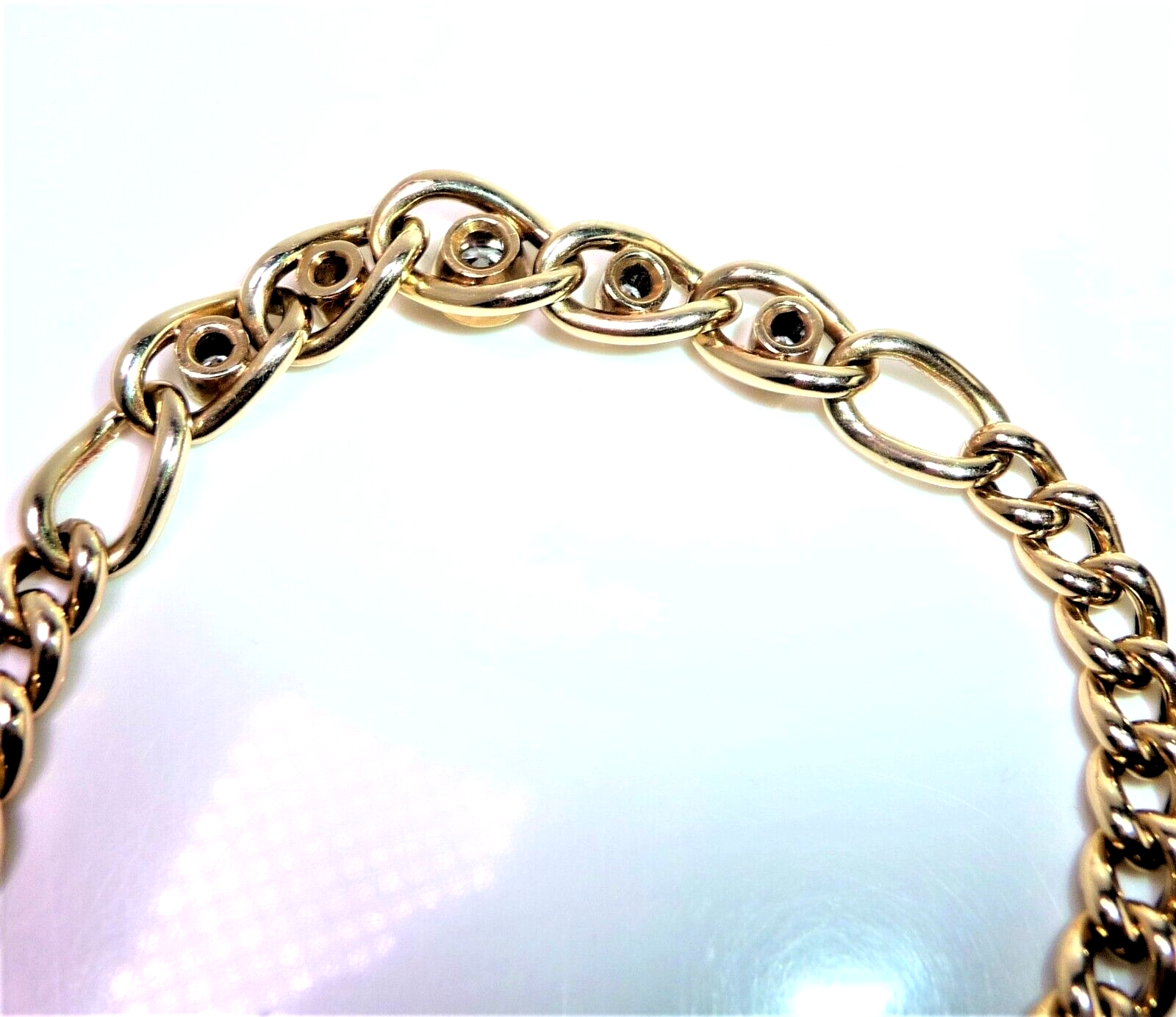 Elegantes Armband in 585 / 14 K Gelbgold. Das Armband hat ein Panzerketten-Muster, das sich zur Mitte hin verbreitert. Eingefügt sind 5 Diamanten im Brillantschliff von total ca. 0.95 ct. Die Diamanten sind in einer Zargenfassung eingefasst.
