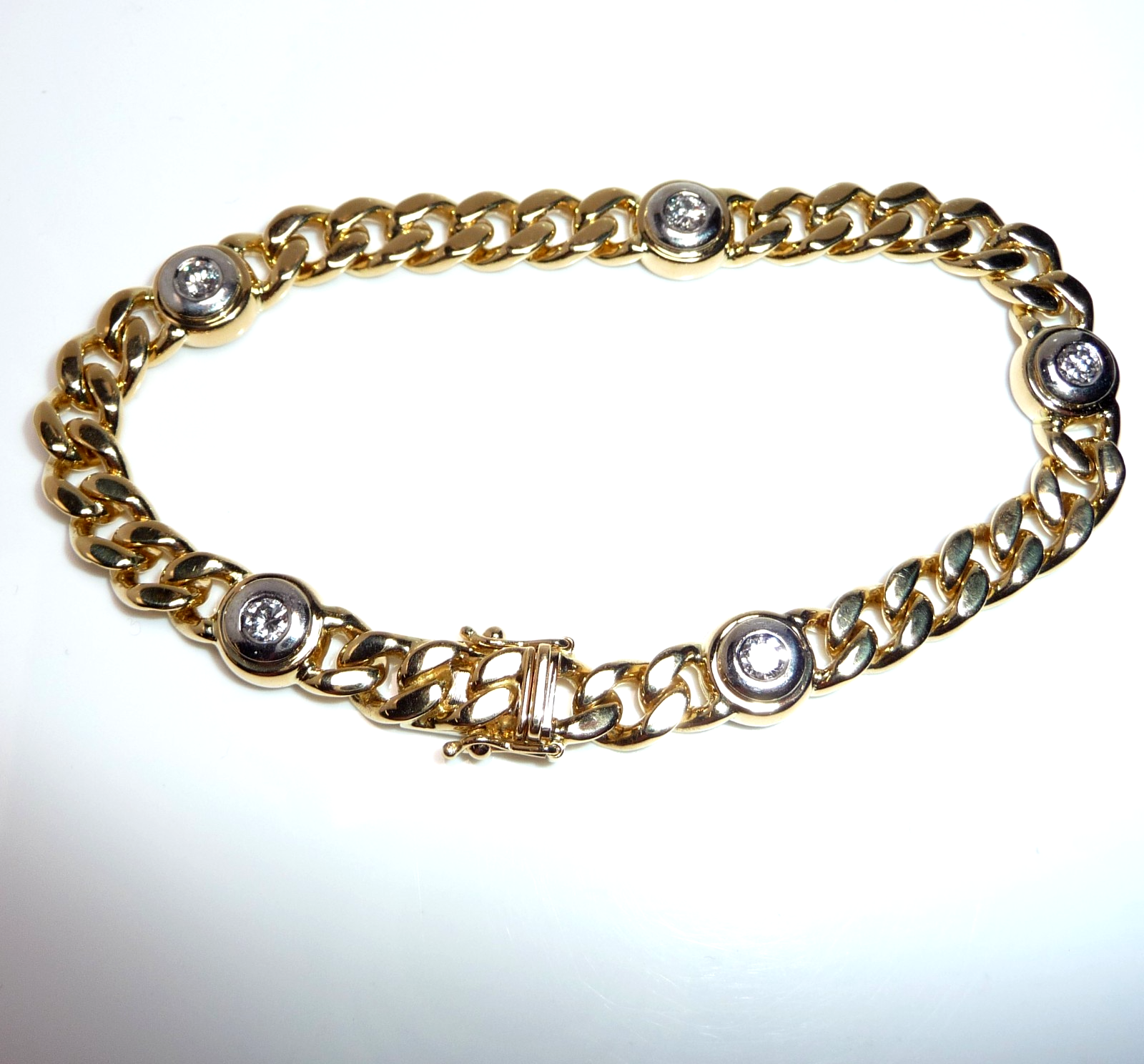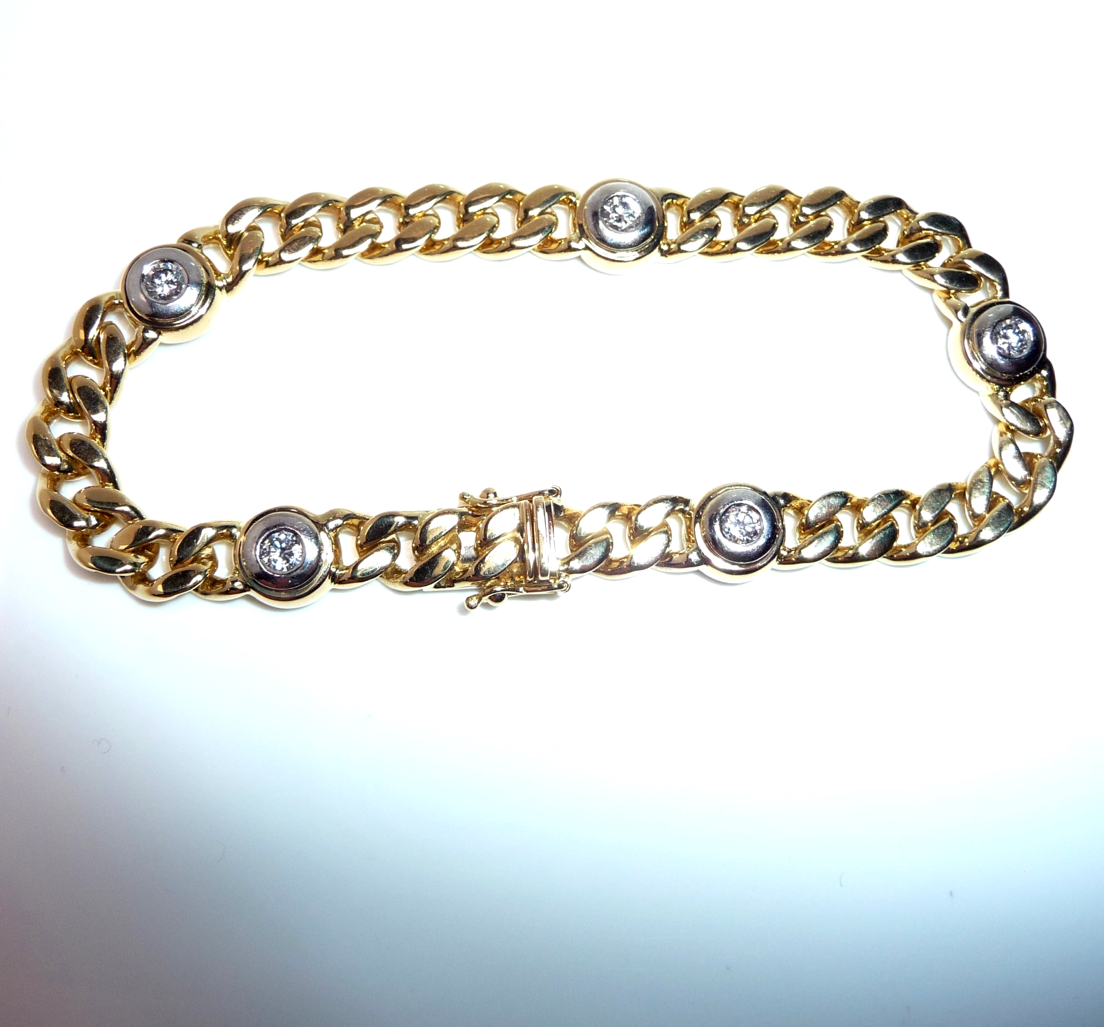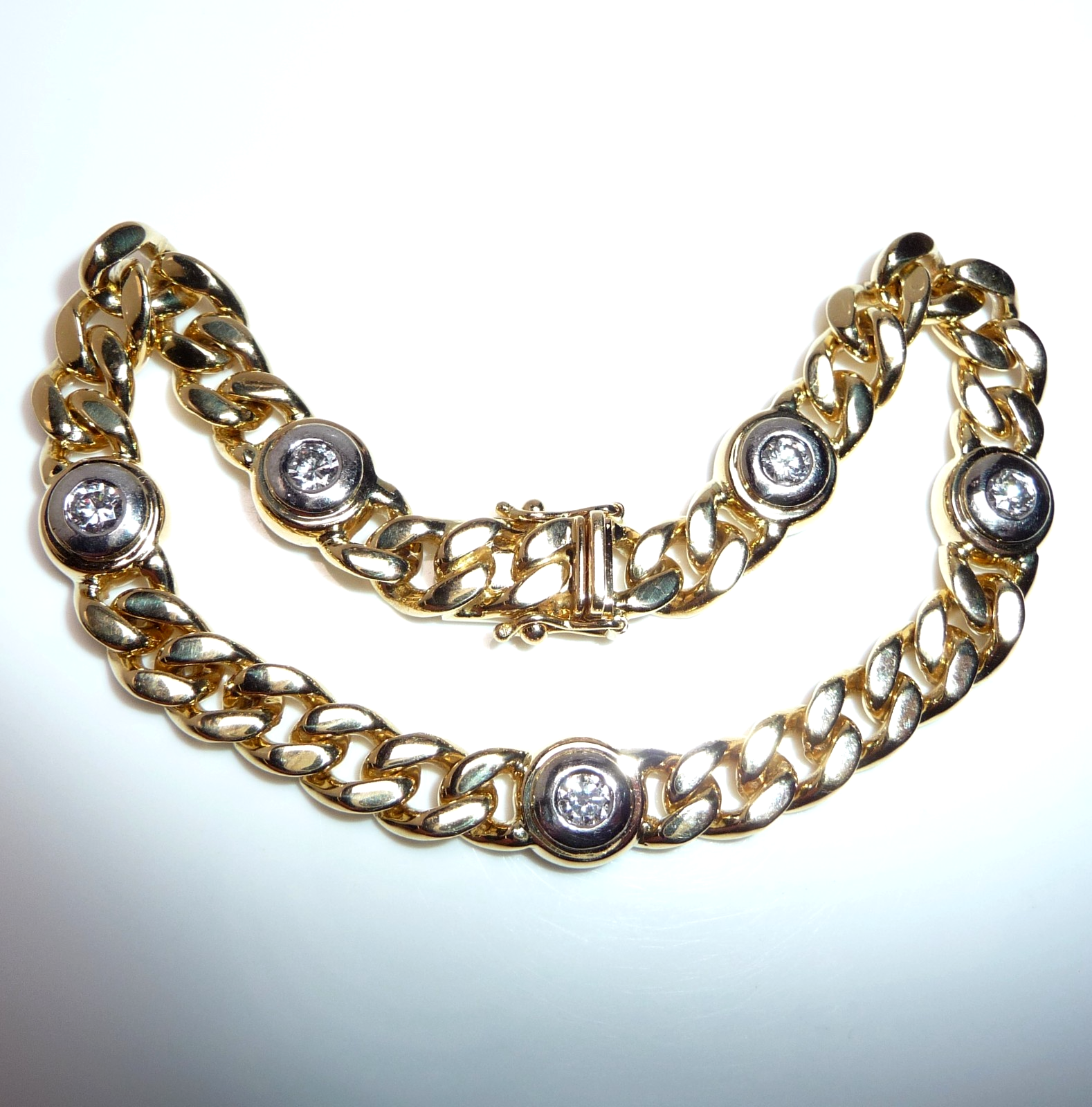 Massives Panzer-Armband in 750/ 18 K Gelbgold. Das Armband hat weich abgerundete und fein polierte Glieder. Insgesamt sind 5 Diamanten im Brillantschliff in das Armband intergiert. Sie sind rundum in gleichmäßigem Abstand verteilt. Die Diamanten sind in einer doppelten Zargenfassung etwas erhöht eingefasst. Mit Durchmessern von 2,4 mm haben die Diamanten jeweils mindestens 0.15 ct.. Diamanten total: 0.75 ct. mit Farbe G-F und Reinheit VVS-IF.