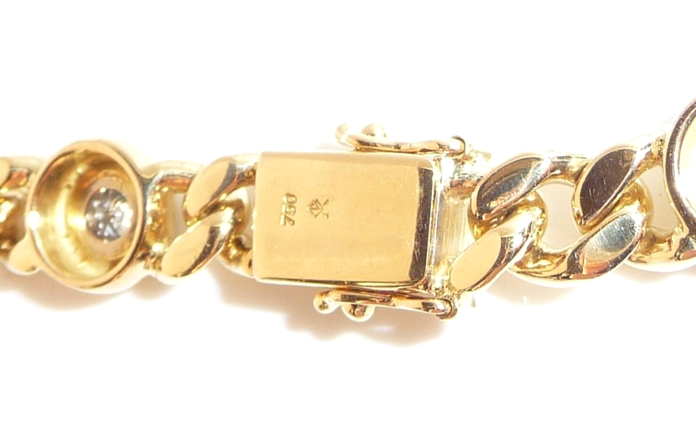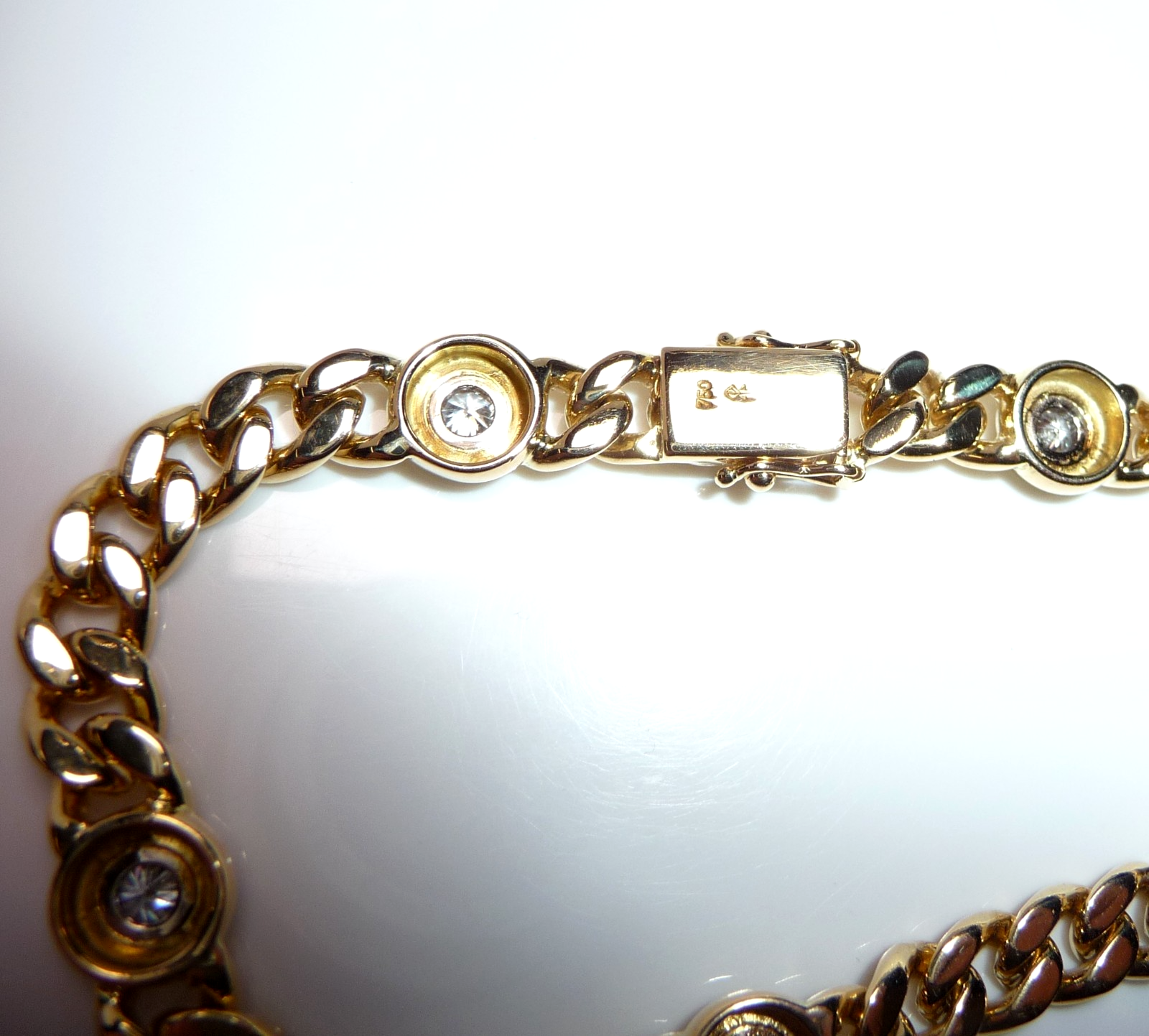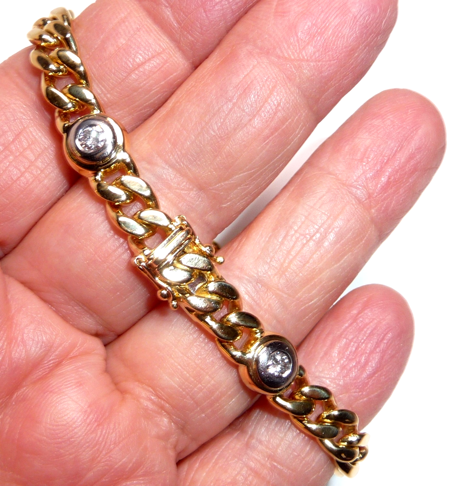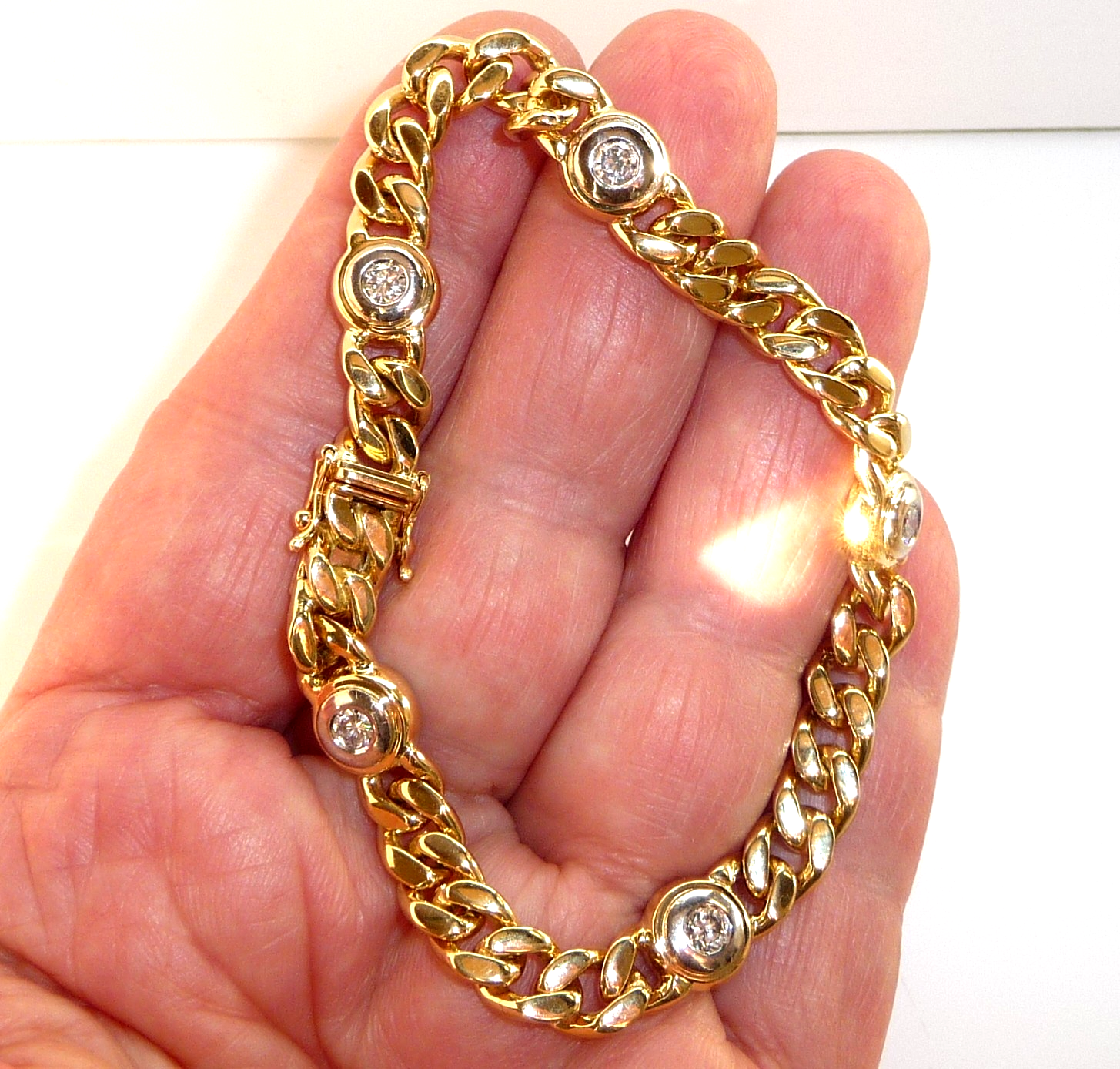 Massives Panzer-Armband in 750/ 18 K Gelbgold. Das Armband hat weich abgerundete und fein polierte Glieder. Insgesamt sind 5 Diamanten im Brillantschliff in das Armband intergiert. Sie sind rundum in gleichmäßigem Abstand verteilt. Die Diamanten sind in einer doppelten Zargenfassung etwas erhöht eingefasst. Mit Durchmessern von 2,4 mm haben die Diamanten jeweils mindestens 0.15 ct.. Diamanten total: 0.75 ct. mit Farbe G-F und Reinheit VVS-IF.