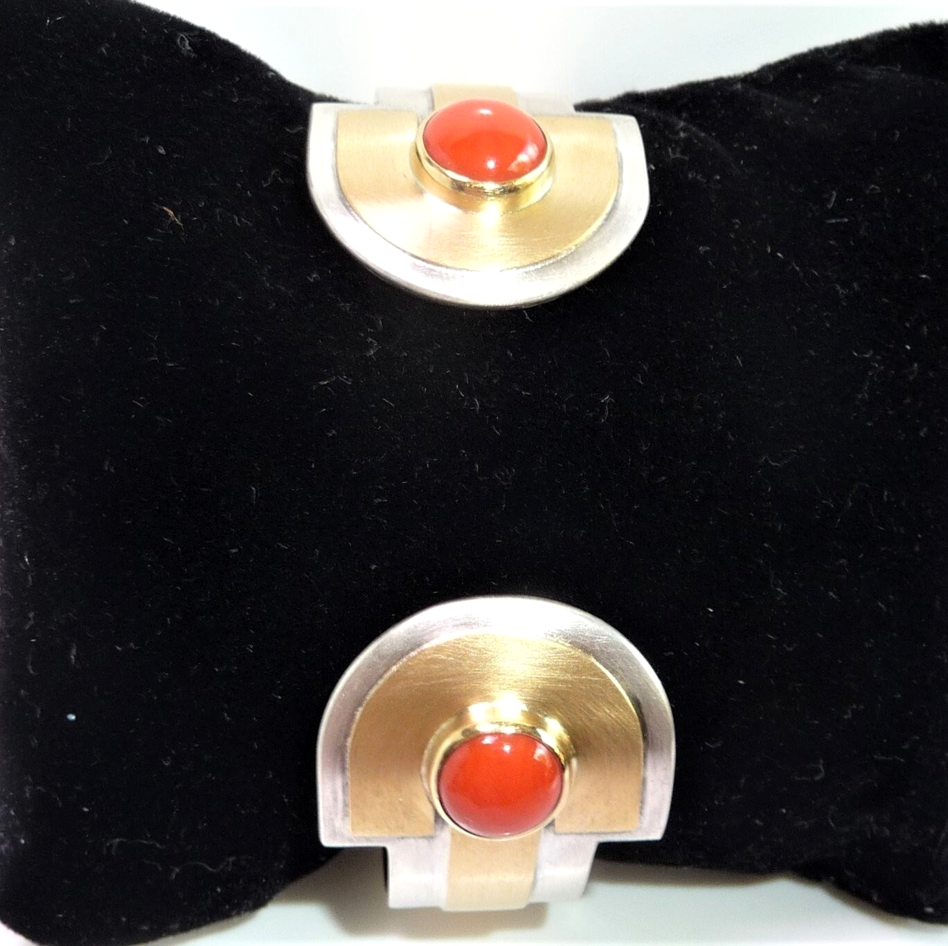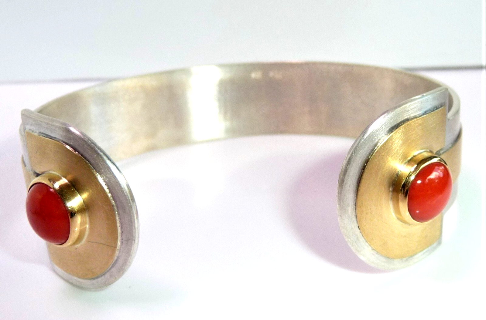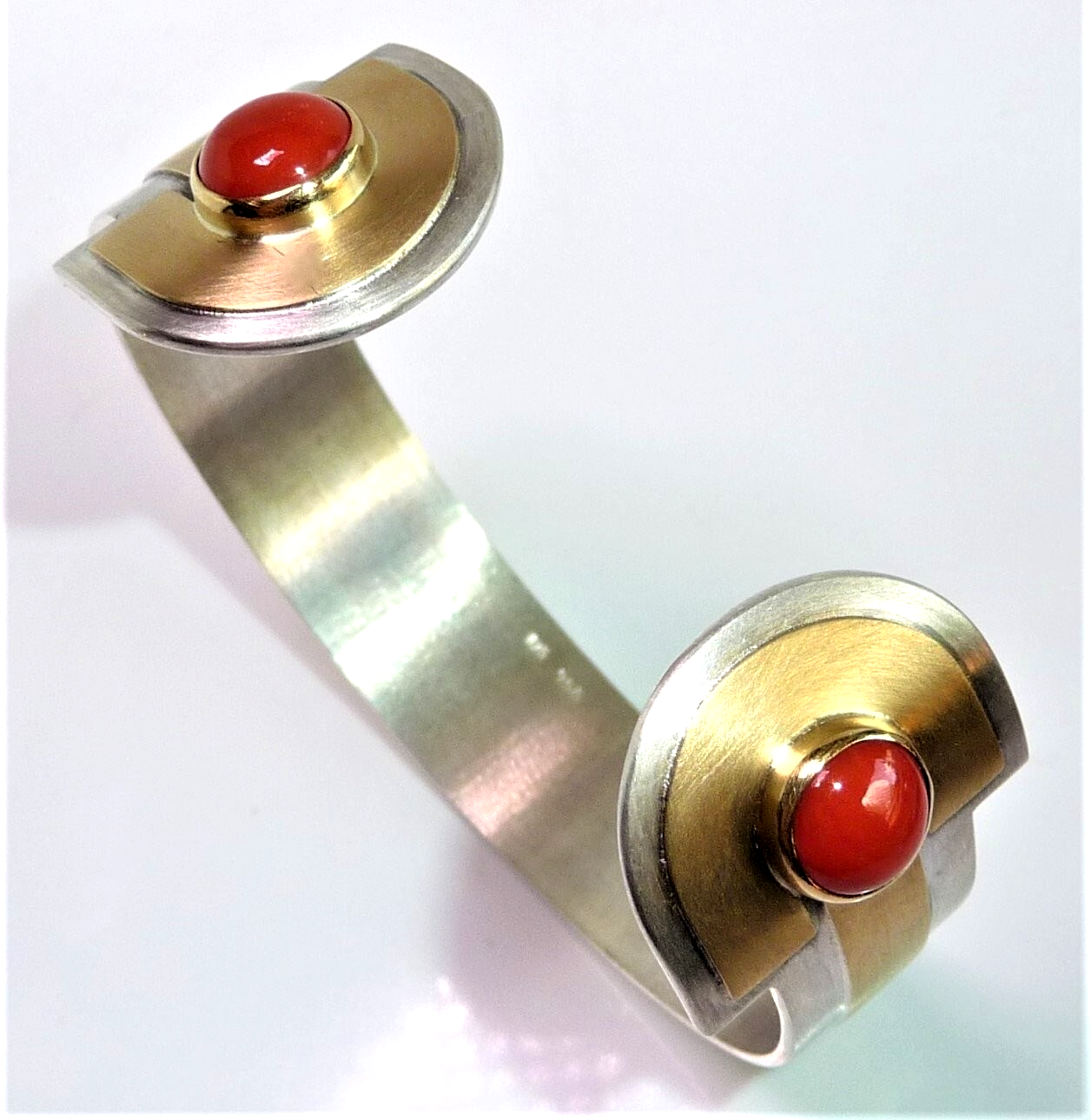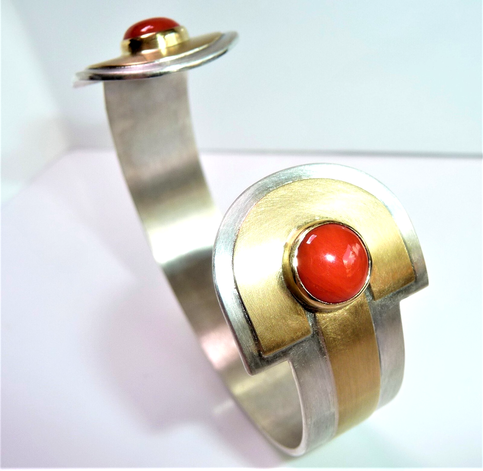Armreif / Bangle in 750 Gelbgold und 925 Silber. Kreative Goldschmiede-Arbeit mit zwei runden Blutkoralle Cabochons von ca. 4.00 ct. Der Armreif ist innen in 925 Silber und hat außen einen breiten Reif aus massivem 750 Gold. Der Goldschmied schätzt den Anteil an 750 Gelbgold mit 15 Gramm.