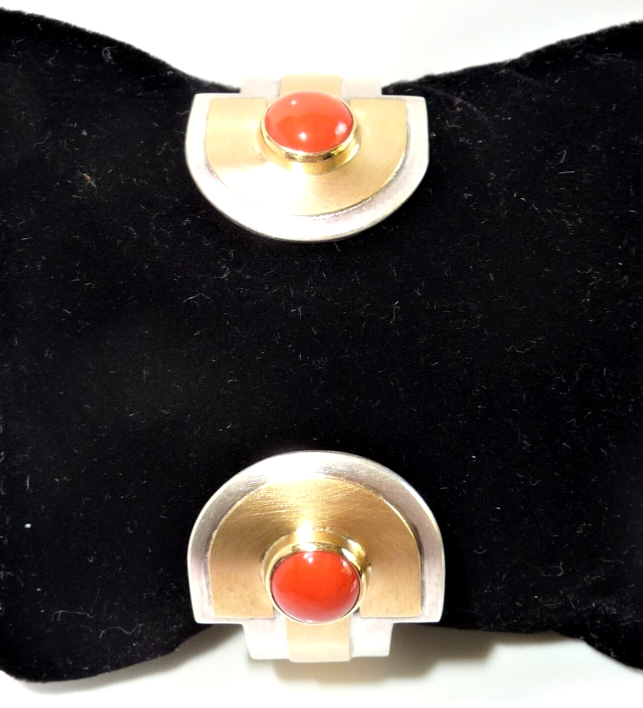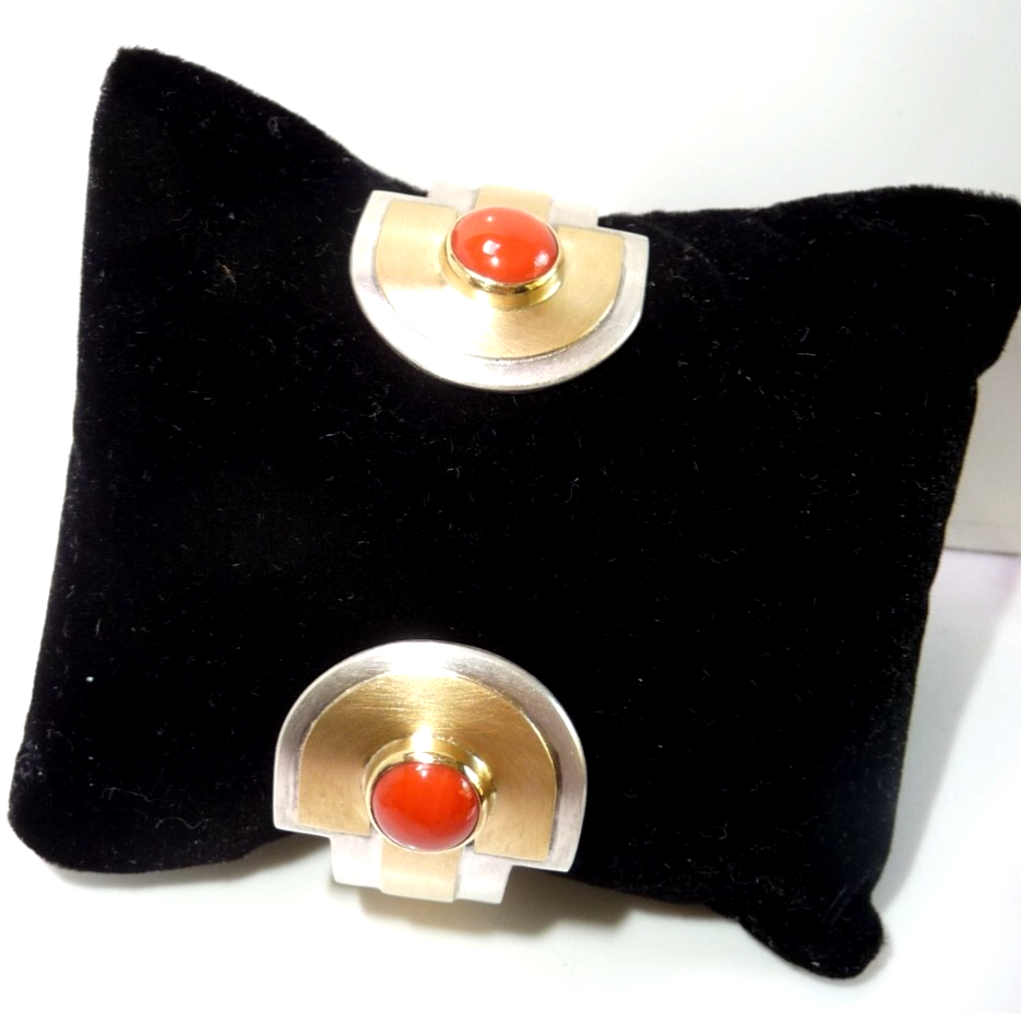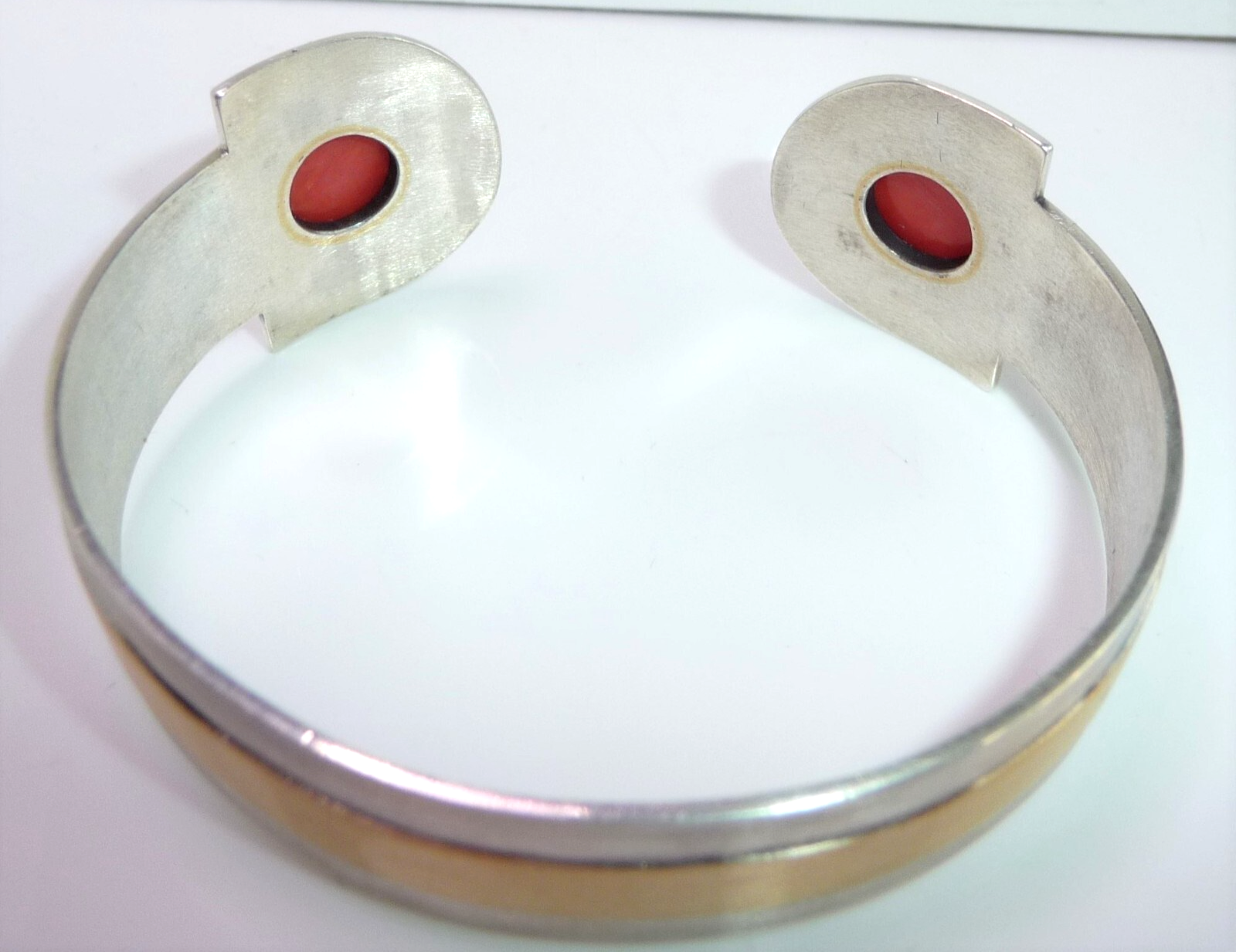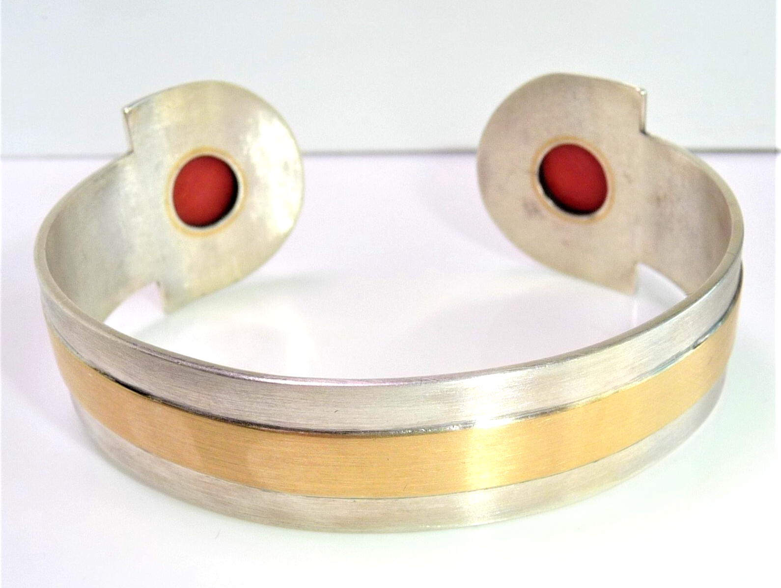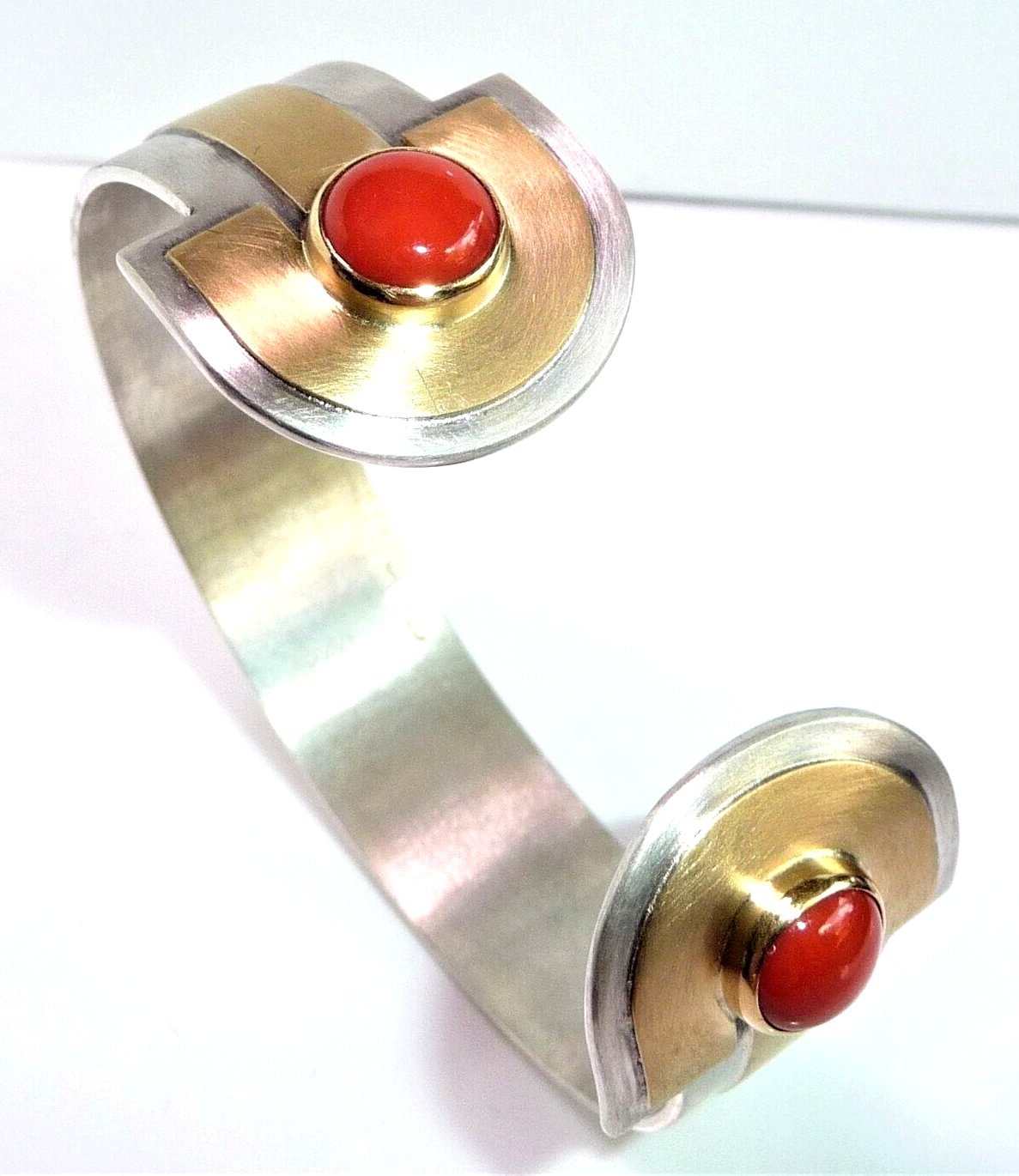 Armreif / Bangle in 750 Gelbgold und 925 Silber. Kreative Goldschmiede-Arbeit mit zwei runden Blutkoralle Cabochons von ca. 4.00 ct. Der Armreif ist innen in 925 Silber und hat außen einen breiten Reif aus massivem 750 Gold. Der Goldschmied schätzt den Anteil an 750 Gelbgold mit 15 Gramm.