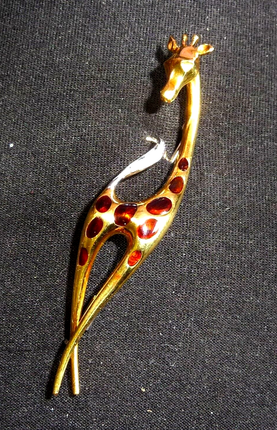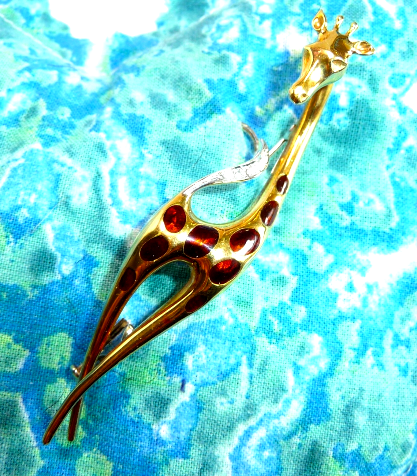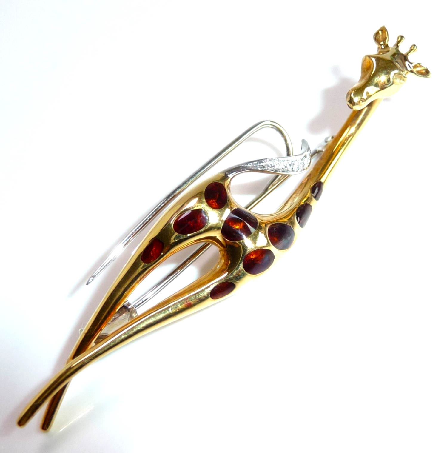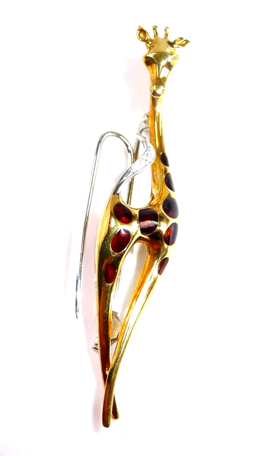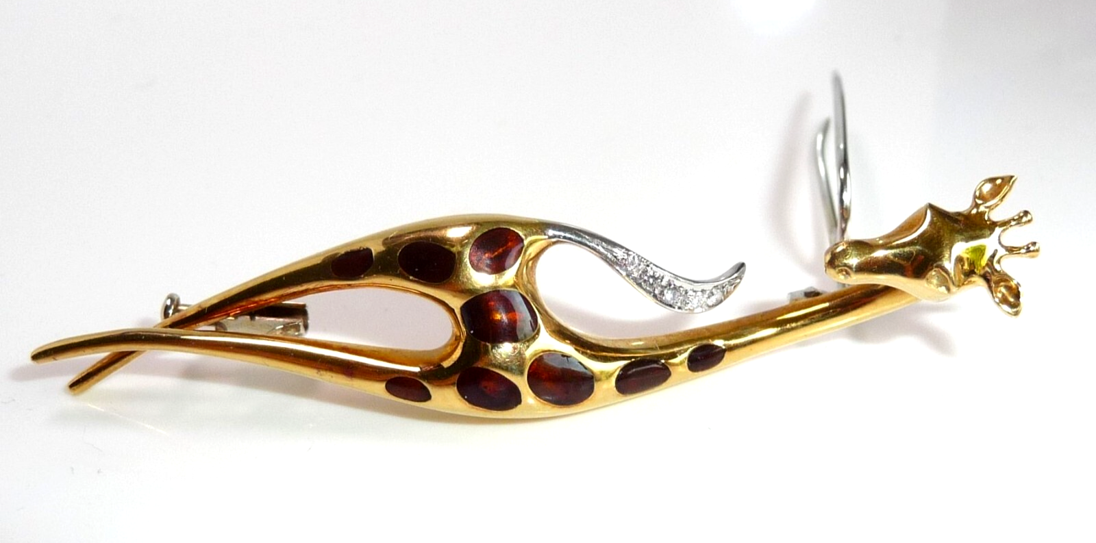 Designer-Brosche in 18 K / 750 Gelbgold. Die Brosche ist als Giraffe gearbeitet. Die surrealistische Darstellung erinnert an die stilisierten Darstellungen von Dali. Der Kopf der Giraffe ist sehr naturalistisch ausgeformt, der Körper hingegen weicht die starren Formen auf und deutet die Formen nur noch an und überlässt den Rest der Fantasie des Betrachters. Die Maserung der Giraffe wird durch braune Emaille-Tupfer symbolisiert. Der Schwanz der Giraffe ist in Weißgold und mit 5 Diamanten im Brillantschliff von total 0.075 ct. (F-G / VVS-VS) besetzt.
