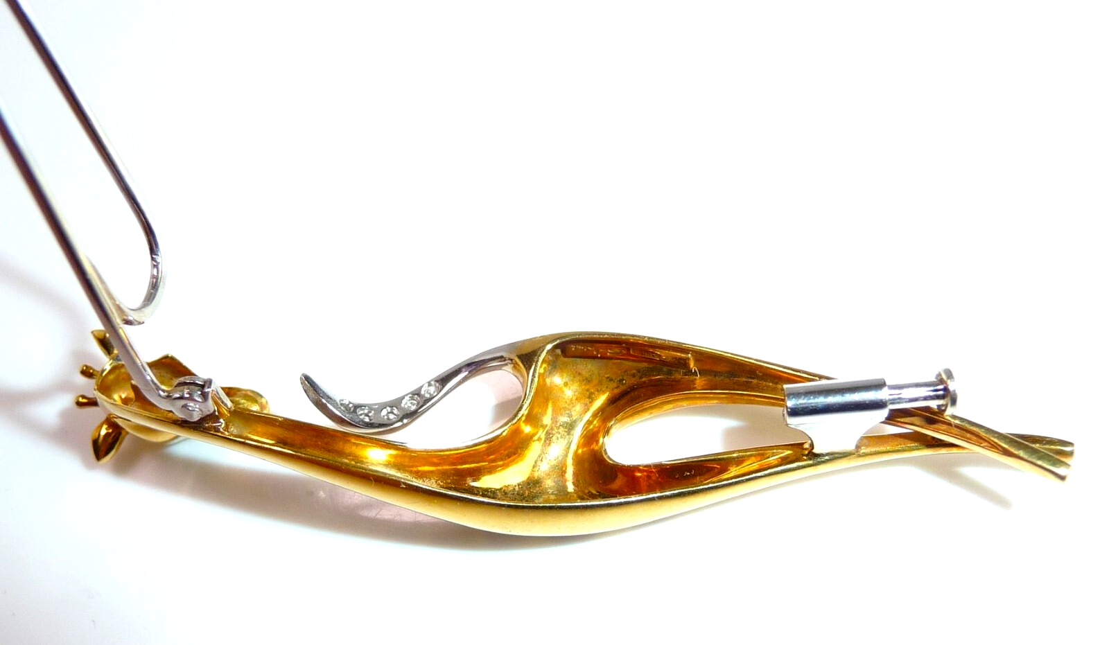 Exzellenter Zustand, sehr hochwertige Goldschmiede-Arbeit mit hochwertiger doppelter Broschierung, die die Brosche sicher in Position hält. Ein Zylinder-Hülse verschließt die Nadel