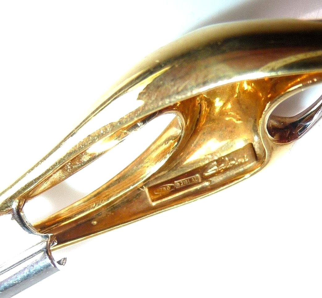 Gepunzt innen auf der Rückseite mit 750 - italienischer Eich-Punze: Stern - 5481 AL und Marken-Signe für den Goldschmied. Wir lesen dort "Saloini"
